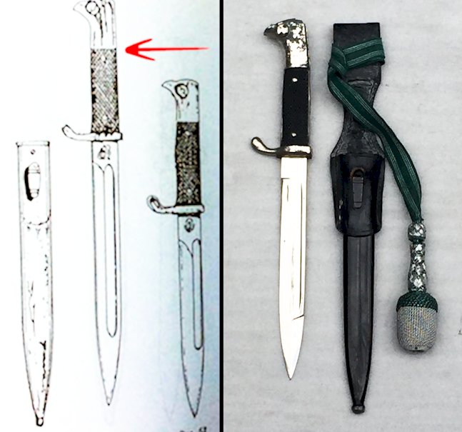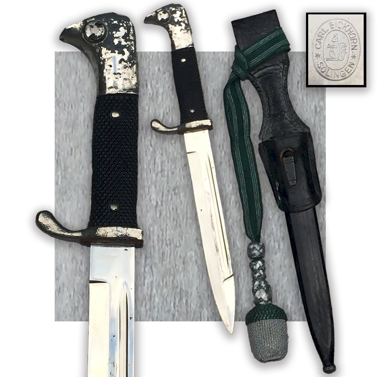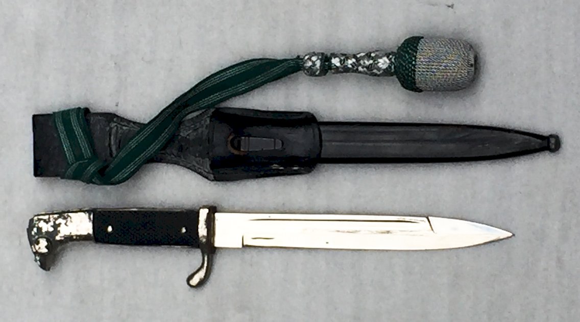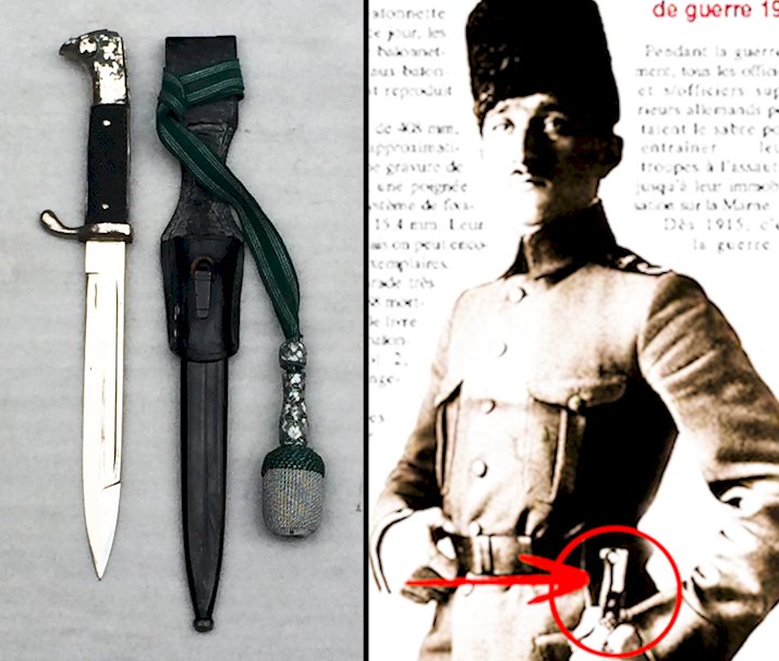 Très belle dague/baionette de type prusienne ou allemand. Poignée noire quadrillée, bois et fer, abimée et un peu déformée (probablement un incident durant les combats). La lame comporte un marquage au talon : '' CARL EICKHORN SOLINGEN '' avec un Ecureuil comme il se doit. La lame est en super état, encore brillante (état de musée), le fourreau comporte encore sa peinture noire ainsi que son petit rivet de fixation. Très belle et rare dragonne verte avec du fil argenté, ainsi que son baudrier en cuir d'origine + une exceptionnelle photo du propriétaire de l'objet. Très beau poignard, totalement homogène, très rare. En vigueur également dans l'empire Ottoman durant la première guerre mondiale ainsi que durant la WW2. Très agréable à tenir et juste mangifique lorsqu'il est exposé en vitrine, une véritable pépite ! Réellement très rare dans cet état !
