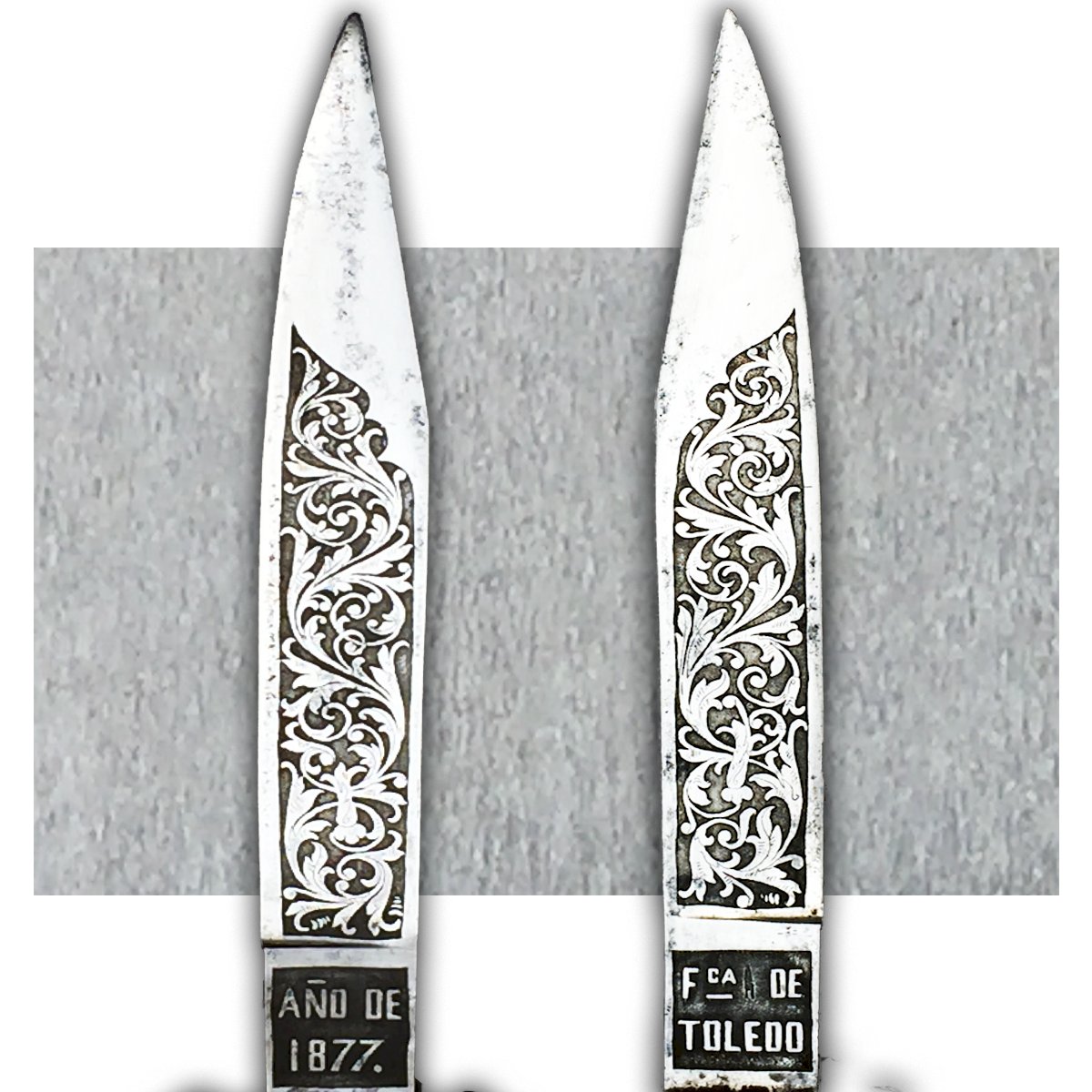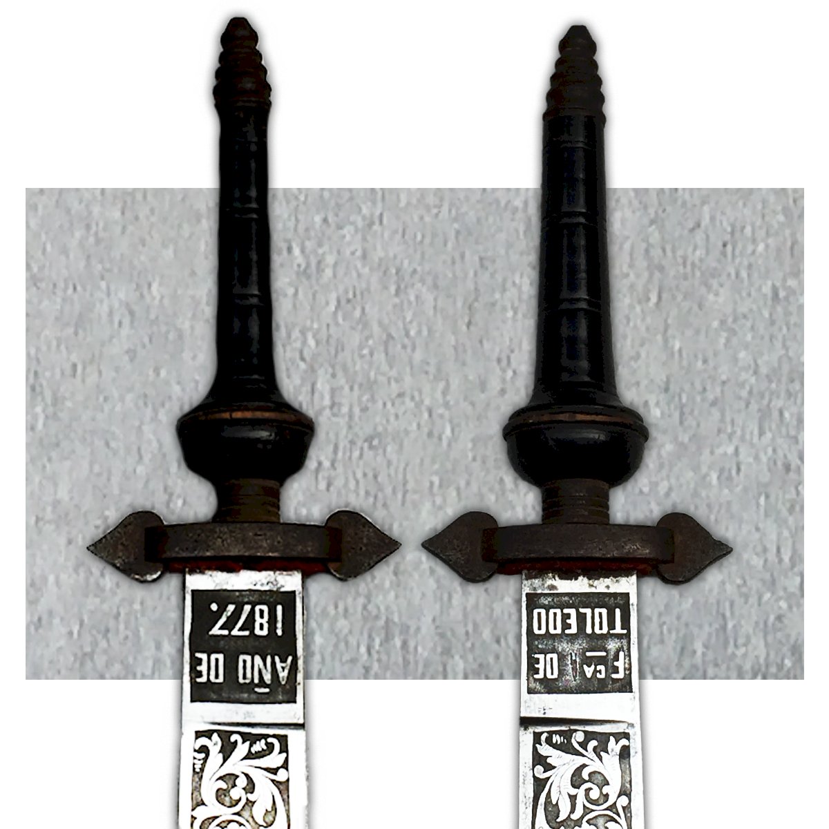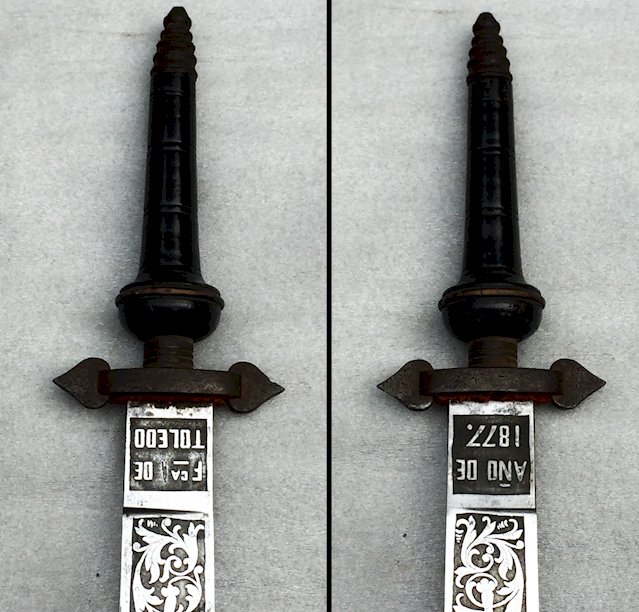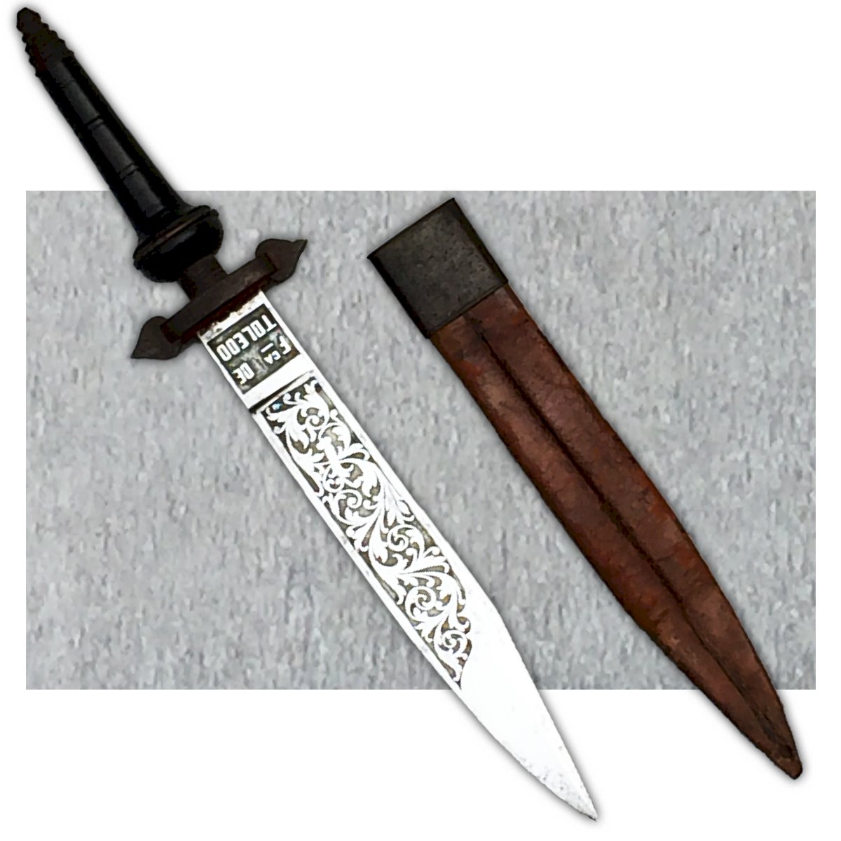 En achetant cette luexeuse et très rare dague de TOLEDO, vous placerez dans votre vitrine un témoignage inestimable et rare de l'histoire du royaume d'Espagne, mais aussi celle des meilleurs armuriers de TOLEDO du XIX siècles. Magnifique et RARISSIME pièce, n'attendez pas