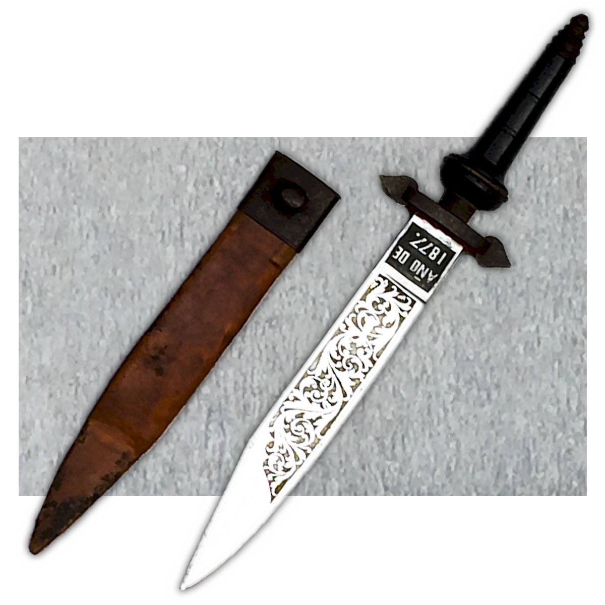 Extrêmement rare et sublime poignard / dague espagnole du XIX, datée 1877. Belle poignée avec garde noire en bois et acier avec une jolie petite boule vers le talon. Belle lame, superbement gravée '' ANO DE 1877 '' et sur l'autre face '' FCA DE TOLEDO ''. Dague gravée de différents motifs de la prestigieuse manufacture de Toledo. Pièce dans son jus, avec des traces dûes au temps, propre ! Fourreau en cuir, un peu décousu à l'arrière, bouterolle en acier. Très agréable à tenir en mains et encore plus à observer en vitrine, très rare et 100% original !!! Pièce se vendant sur les sites d'experts entre 2000-2500 euros ! ! !