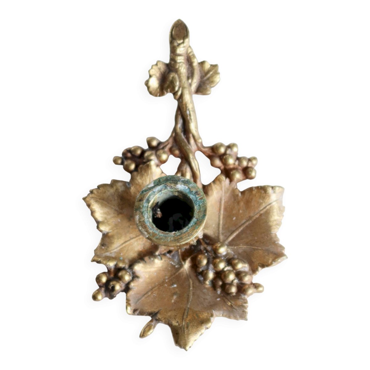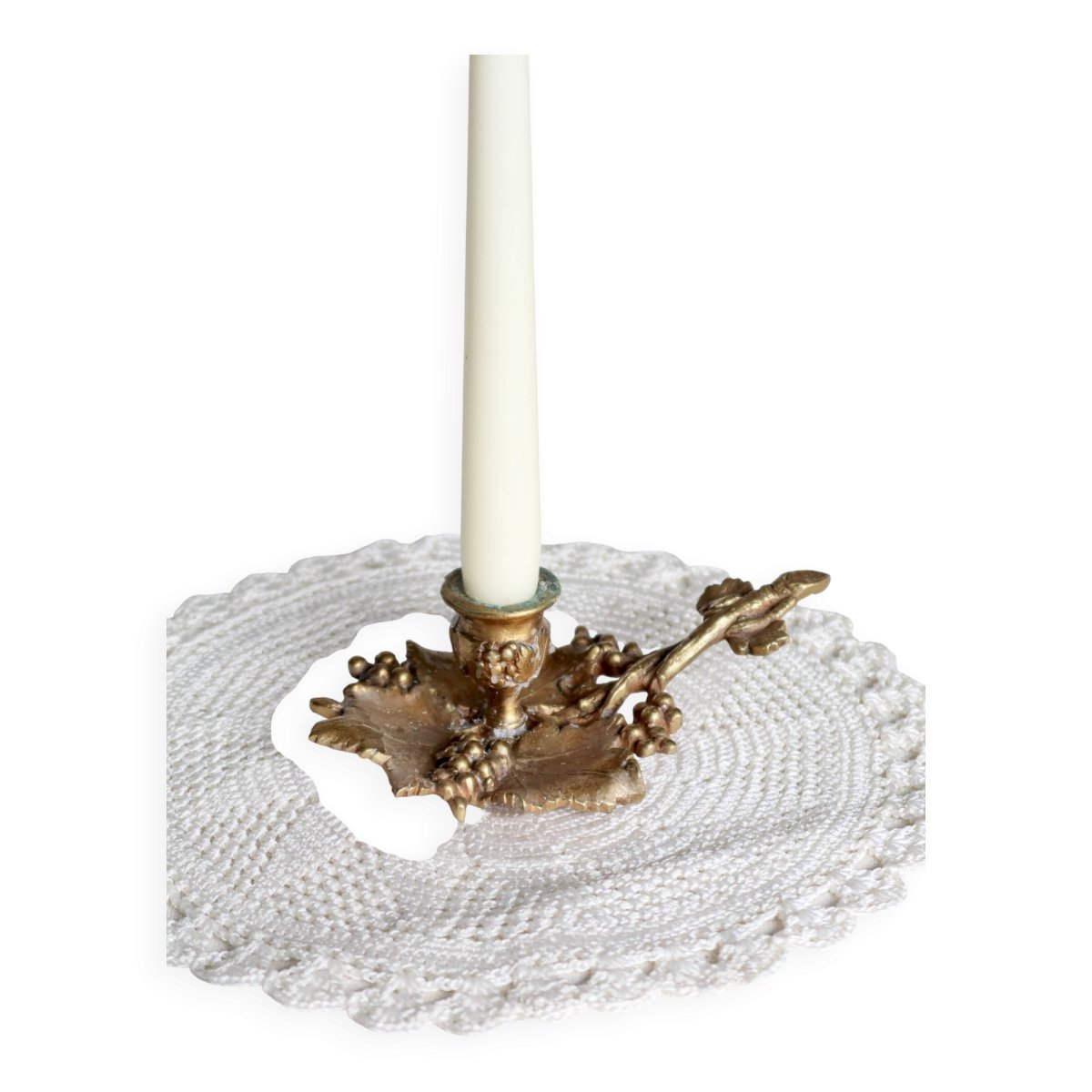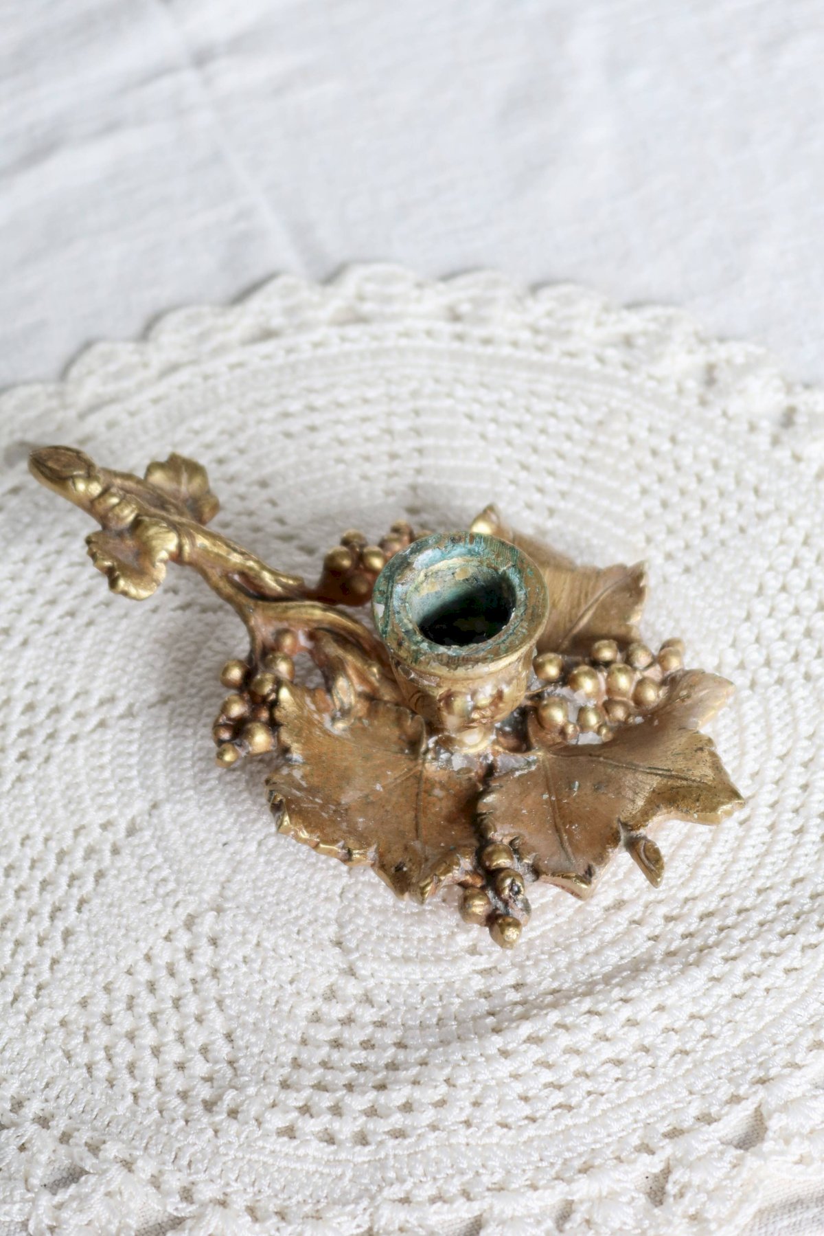 Petit bougeoir ancien en laiton moulé, orné de pampres et raisins.