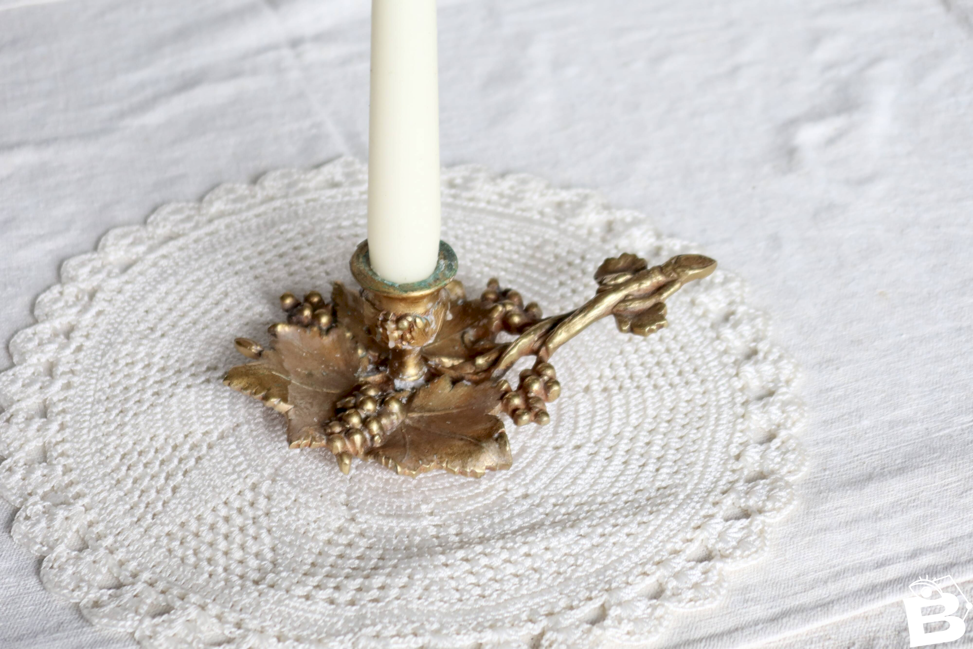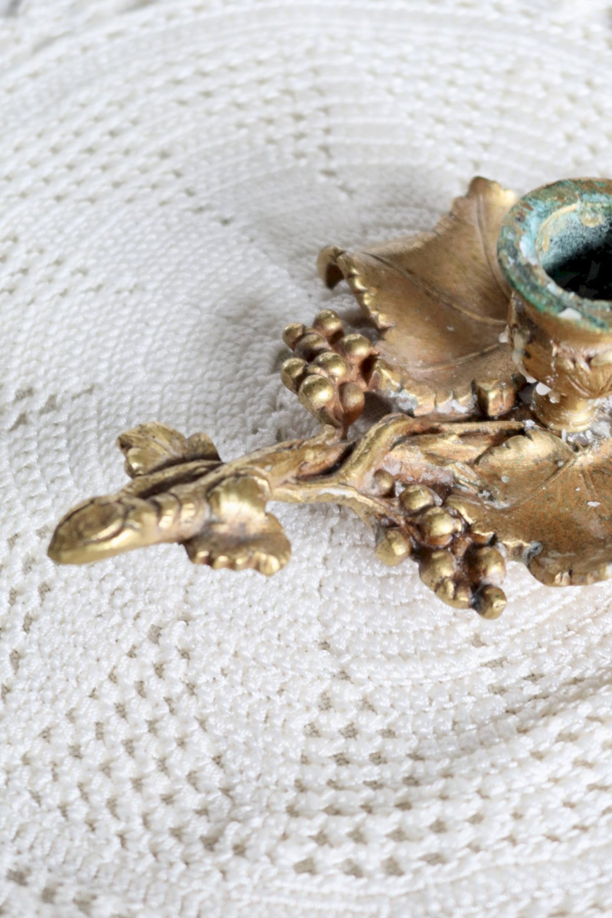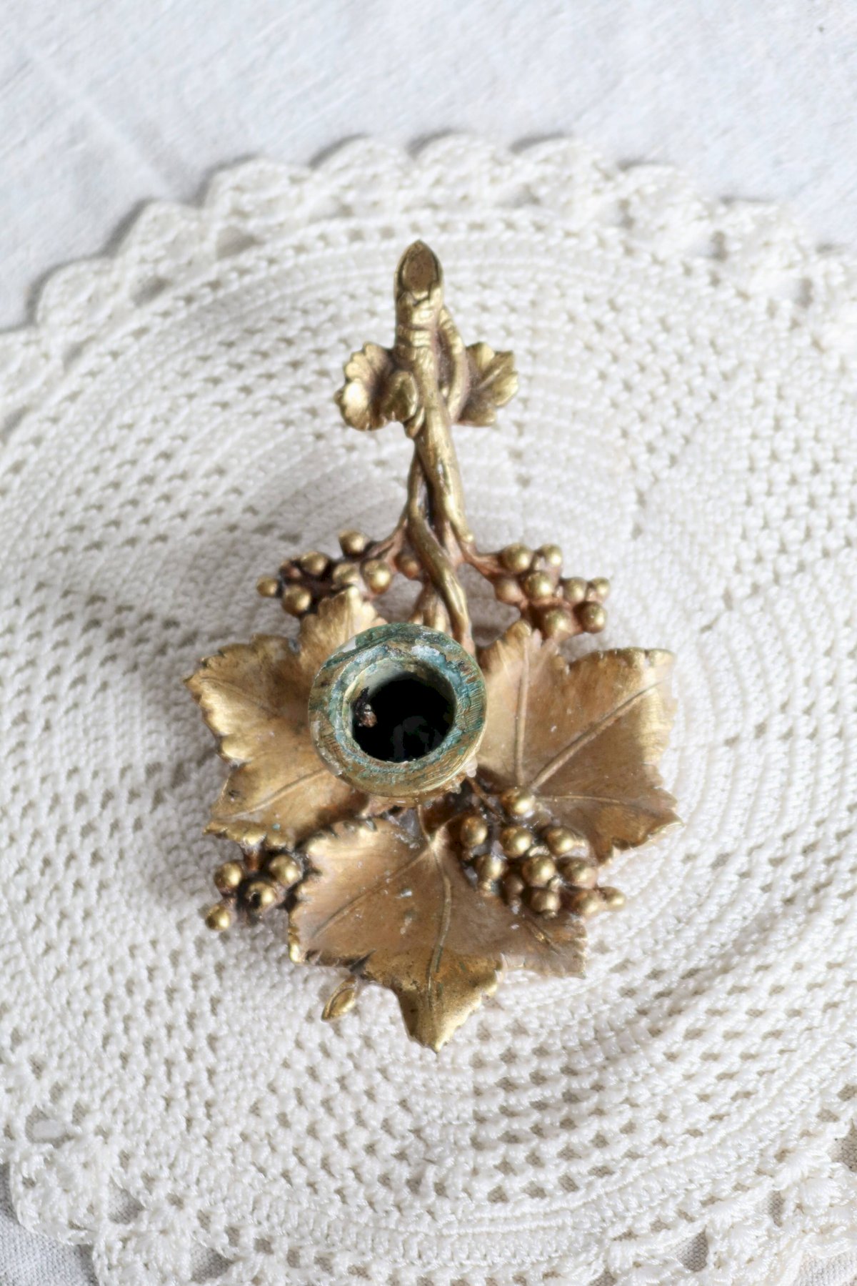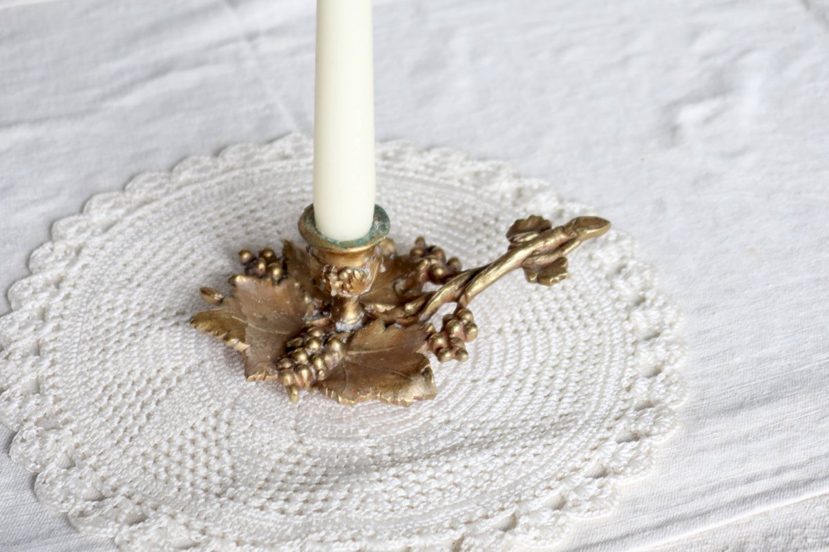 Petit bougeoir ancien en laiton moulé, orné de pampres et raisins.