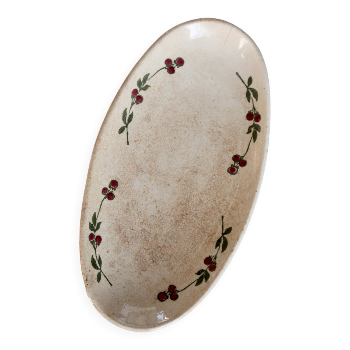 Ravier ovale en terre de fer de la faïencerie française située à Somain, décor Sorbier: guirlande de petites baies rouges et feuillage vert sur fond ivoire.