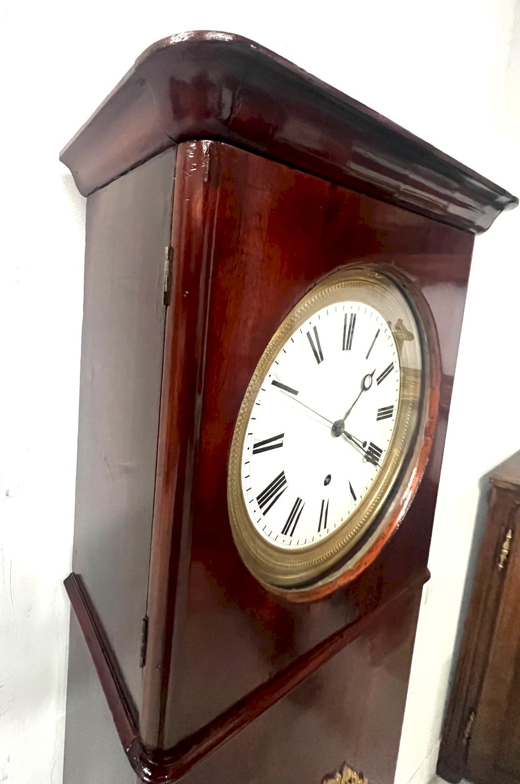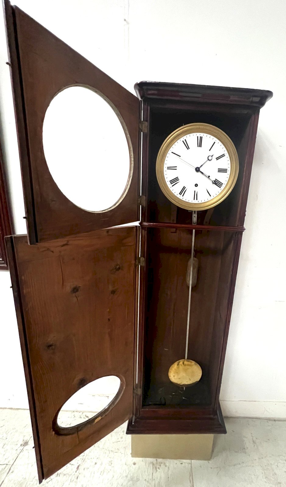 Régulateur mural de style en acajou et placage  Ossature en placage d'acajou sur fond de chêne Cadran en émail blanc a chiffres romain  Bon état général  Mécanisme a vérifier Dimension  H 143 x L 45 x 23 cm  Epoque XIX siècle  Pour une livraison a l’international, me contacter merci   Nous essayons d’être le plus précis possible dans notre description N ' hésitez pas a nous poser toutes vos question avant de finaliser votre achat soit par mail ou au tel PETIT RAPPEL Le meilleur allié de la vente par correspondance reste le dialogue, c'est pour cela que je vous communique mon numéro de portable pour toutes questions pendant une vente mais aussi pour toutes interrogations pendant vos achats. Je répondrais volontiers à toutes vos questions, n'hésitez pas les photos tiennent lieu de descriptif Pour tout retour, les frais d'expédition et de retour resterons a la charge de l'acheteur Type:Objet de métier Poids:45 Origine:France Pays d'origine:France Hauteur:143 Matière:Bois Style:Napoléon III Largeur:23