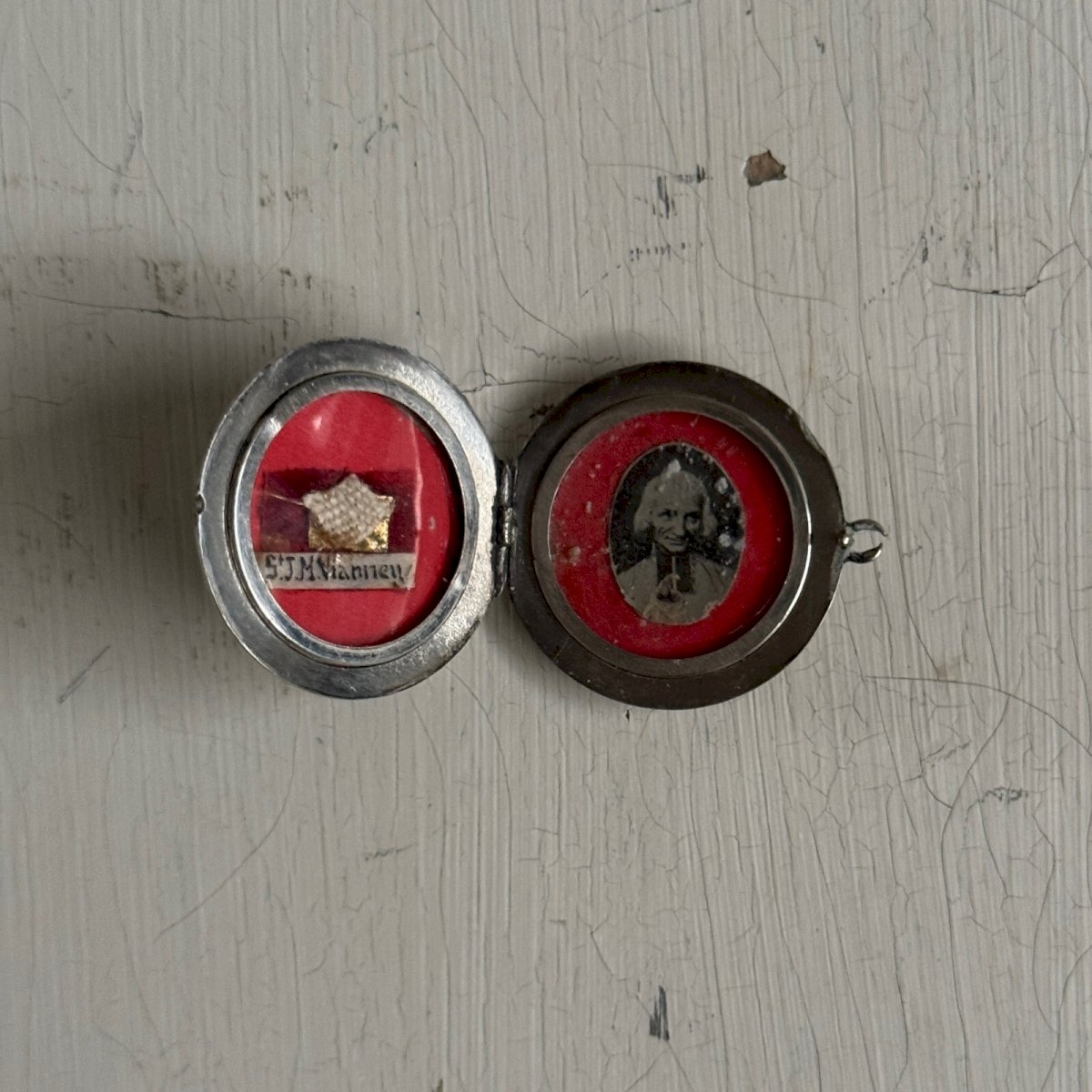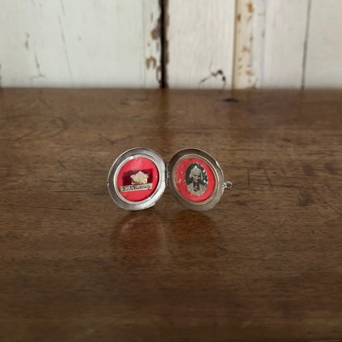 Reliquaire portatif en argent double face de saint Jean-Marie Vianney M3629 Ce reliquaire en argent s'ouvre, on trouve à l'intérieur une photo de saint Jean-Marie Vianney et une relique de l'autre côté. On ne trouve pas de poinçon, mais il s'agit bien d'argent massif. Pour l'état, notons que l'accroche est usée et de fines rayures dues à l'usage. Nos photos vous permettent d'apprécier la qualité de l'objet. Pour l'état, merci de bien détailler les photos. N'hésitez pas à zoomer . Les photos font partie intégrante de la description. Dimensions : Hauteur avec anneau : 3,2 cm Diamètre : 2,8 cm Épaisseur : 0,5 cm P : 1581174  Je reste à votre disposition pour toute question. Type:Objet de vitrine, Décoratif Origine:France Sous-type:reliquaire Hauteur:3,2 cm Matière:Argent massif Longueur:cm Largeur:2,8 cm