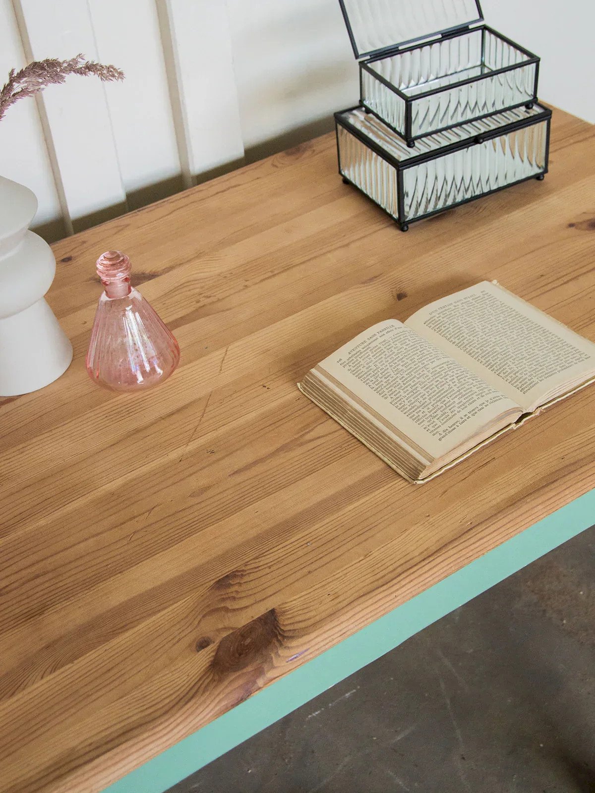 Alliez style et authenticité avec cette table à manger au plateau en bois brut et allongé. Ses pieds peints en vert apportent une touche fraîche et originale à votre intérieur. Son design simple met en valeur la beauté naturelle du bois. Un tiroir discret sur le côté ajoute une note esthétique et pratique. Parfaite pour les repas conviviaux ou comme pièce maîtresse d’une salle à manger chaleureuse. Longueur : 110 cm Hauteur : 73 cm Hauteur sous plateau : 60 cm Profondeur : 60 cm Petite histoire de la table de ferme La table de ferme est un design intemporel qui orne depuis longtemps les salles à manger. Cette table à manger en bois, inspirée de l’automne, est un indémodable pour une décoration vintage et bohème. Classique avec des teintes de bois vives et lumineuses et un aspect brut, elle est surtout choisie pour sa grande taille, son aspect uni et ses tiroirs placés sous le plateau. La grande table de ferme est un élément incontournable de toutes les réunions de famille ! État:Occasion: Objet ayant été utilisé. Objet présentant quelques marques d'usure superficielle, ...Occasion: Objet ayant été utilisé. Objet présentant quelques marques d'usure superficielle, entièrement opérationnel et fonctionnant correctement. Il peut s'agir d'un modèle de démonstration ou d'un objet retourné en magasin après une courte période d'utilisation. les éventuelles imperfections. Marque:Debongout Type:Produit chiné Matériau:Bois Style:Campagne Personnalisé:Tables à manger