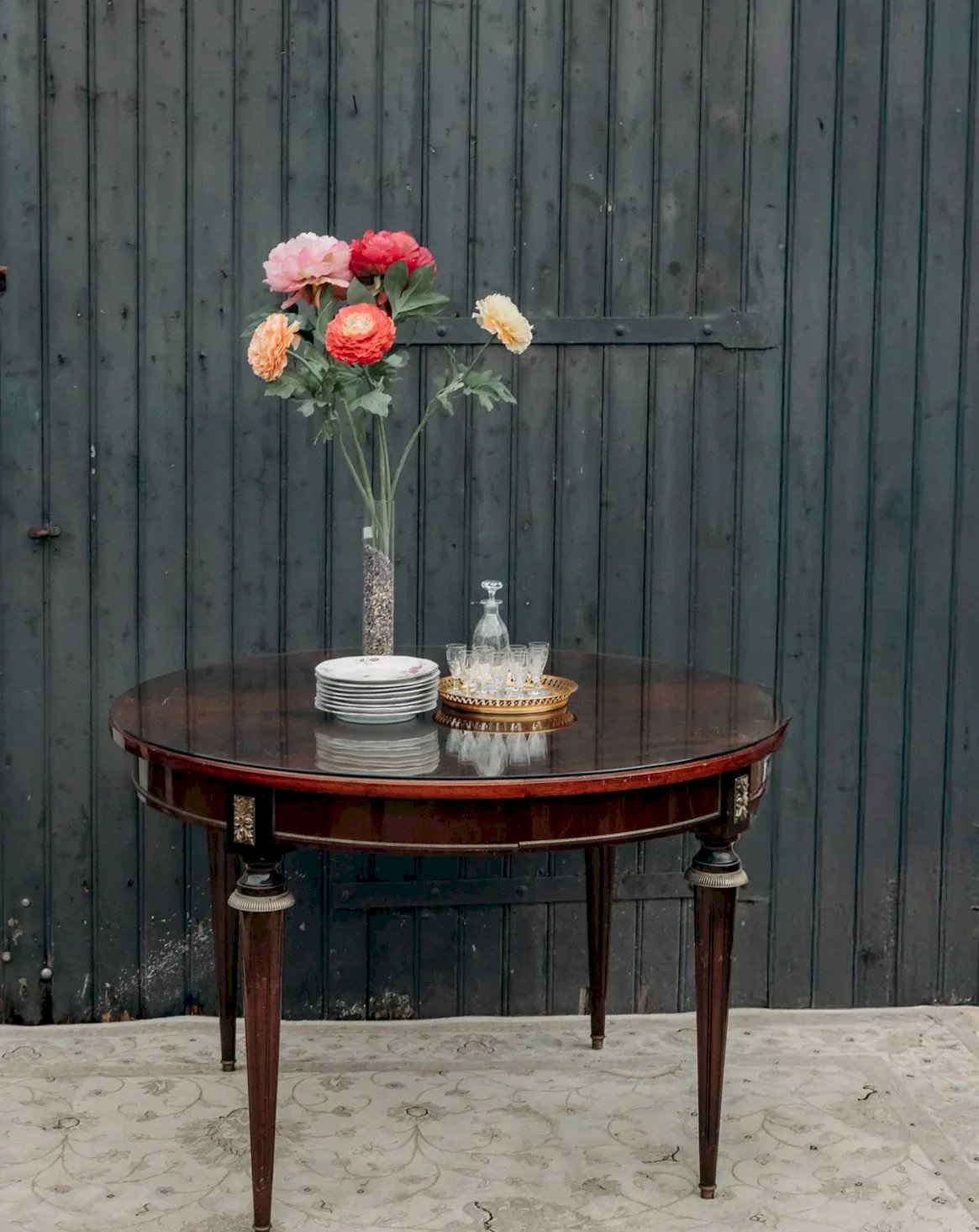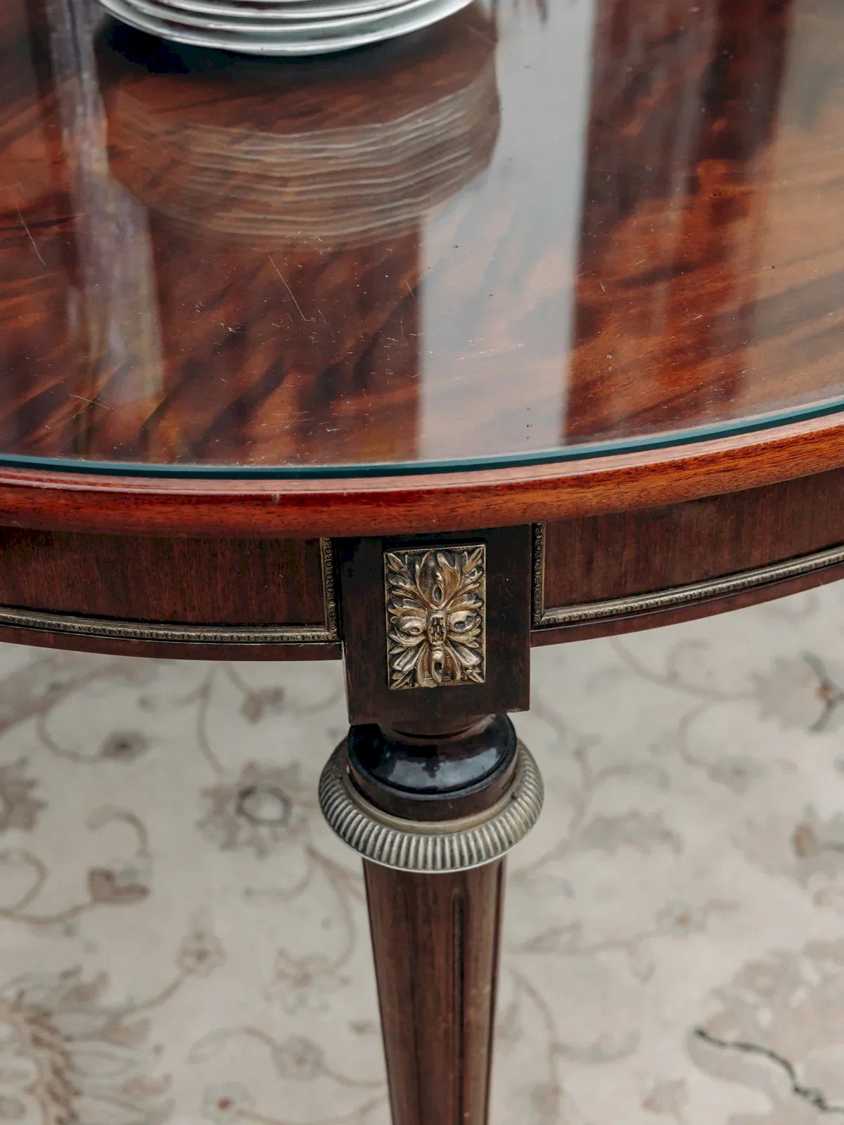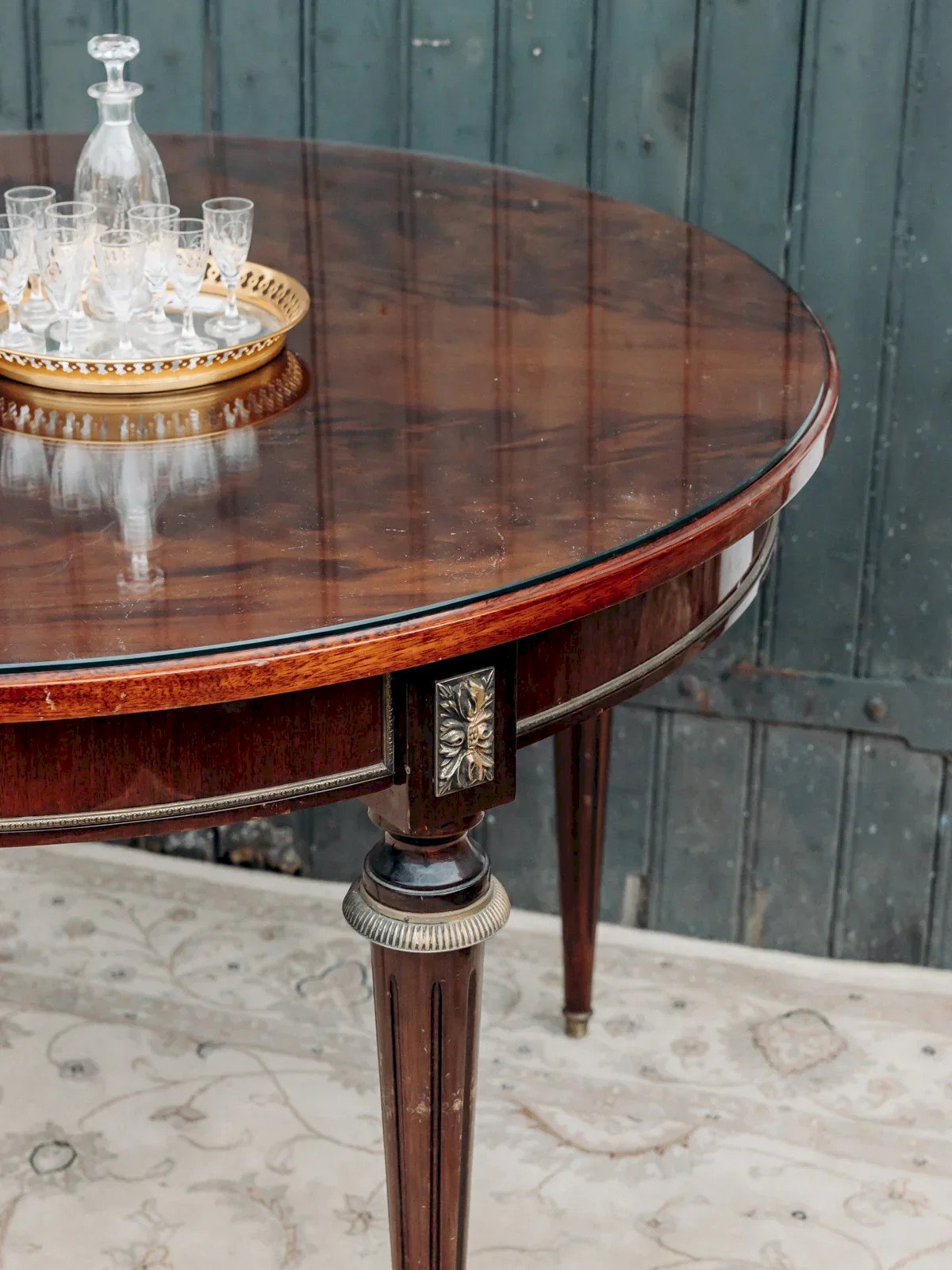 Découvrez cette table à manger ronde plaquée acajou, où la chaleur du bois rencontre une silhouette travaillée et élégante. Son plateau en verre posé souligne la finesse du placage et met en valeur les pieds finement sculptés, tandis que son format compact accueille confortablement quatre convives. Adaptée à une cuisine intime ou à un séjour aux lignes classiques, elle apporte une atmosphère chaleureuse et raffinée tout en offrant une présence légère et fonctionnelle au quotidien. Rayures légères. Hauteur : 75 cm Hauteur sous plateau : 64 cm Diamètre du plateau : 112 cm État:Occasion: Objet ayant été utilisé. Objet présentant quelques marques d'usure superficielle, ...Occasion: Objet ayant été utilisé. Objet présentant quelques marques d'usure superficielle, entièrement opérationnel et fonctionnant correctement. Il peut s'agir d'un modèle de démonstration ou d'un objet retourné en magasin après une courte période d'utilisation. les éventuelles imperfections. Marque:Debongout Type:Produit chiné Matériau:Acajou, Bois, Verre Style:Campagne Personnalisé:Tables à manger
