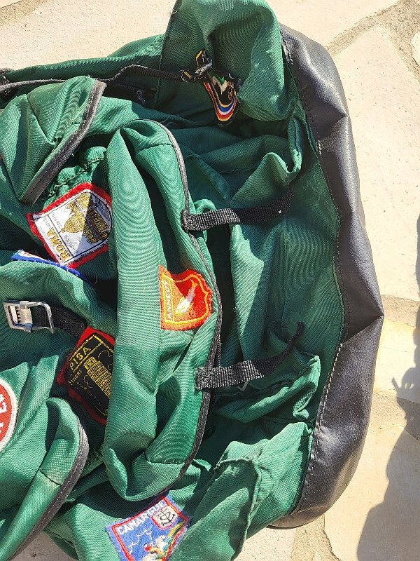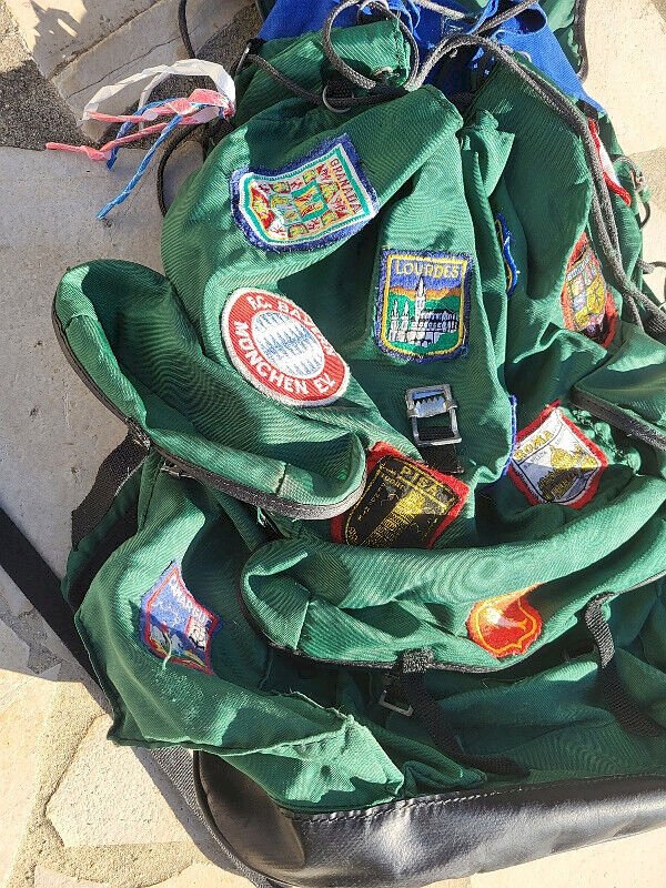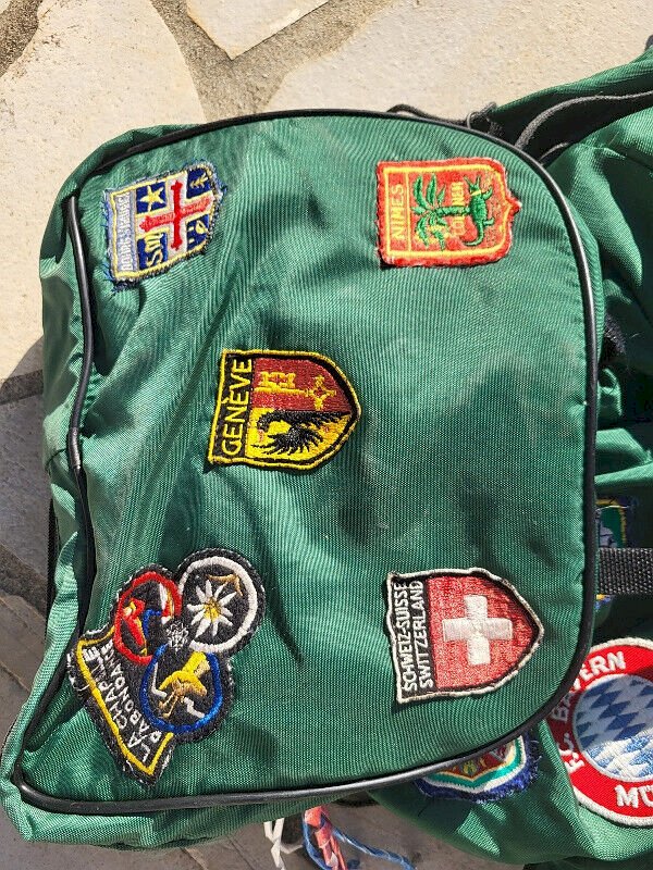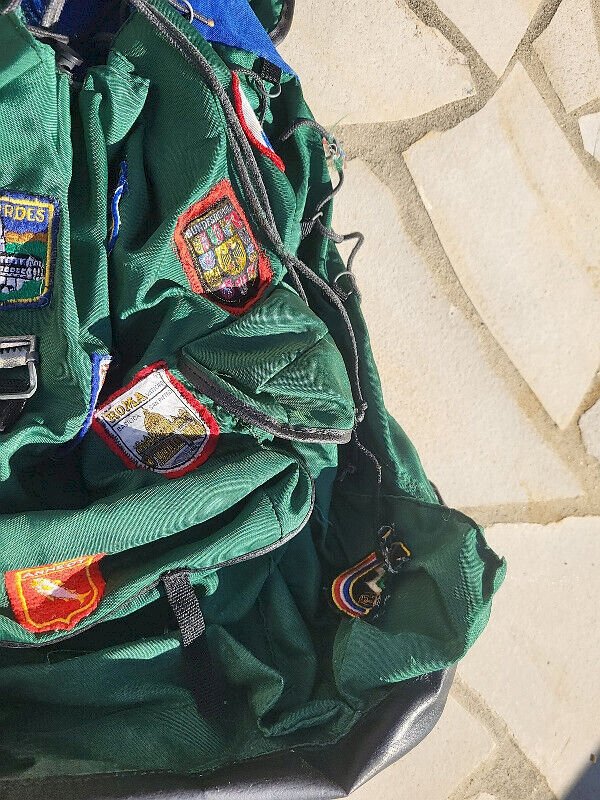 superbe sac à dos de voyage avec écussons il est en bon état il y a juste un écusson qui est abimé le sac à vécu mais il est encore en très bon état il a une armature dorsale et une ceinture 2 poches par côtés il mesure 43 cm de haut sur 45 cm de large Type:sac a dos de voyage