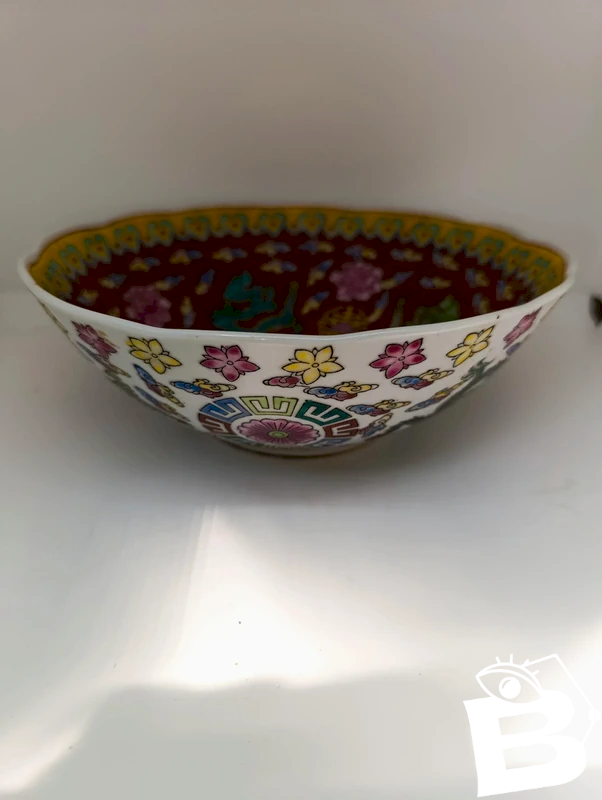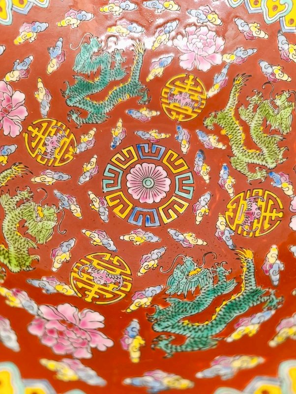 beau saladier en porcelaine datant du milieu du 20eme siecle reproduction de l'epoque Ming en bon etat superbe travail de couleur et de dessin avec ses fleurs et dragons marquage sous la base diametre 22cm hauteur 8cm