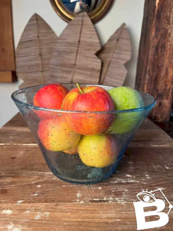 Saladier en verre soufflé bullé de la verrerie de Biot, de couleur bleue translucide.