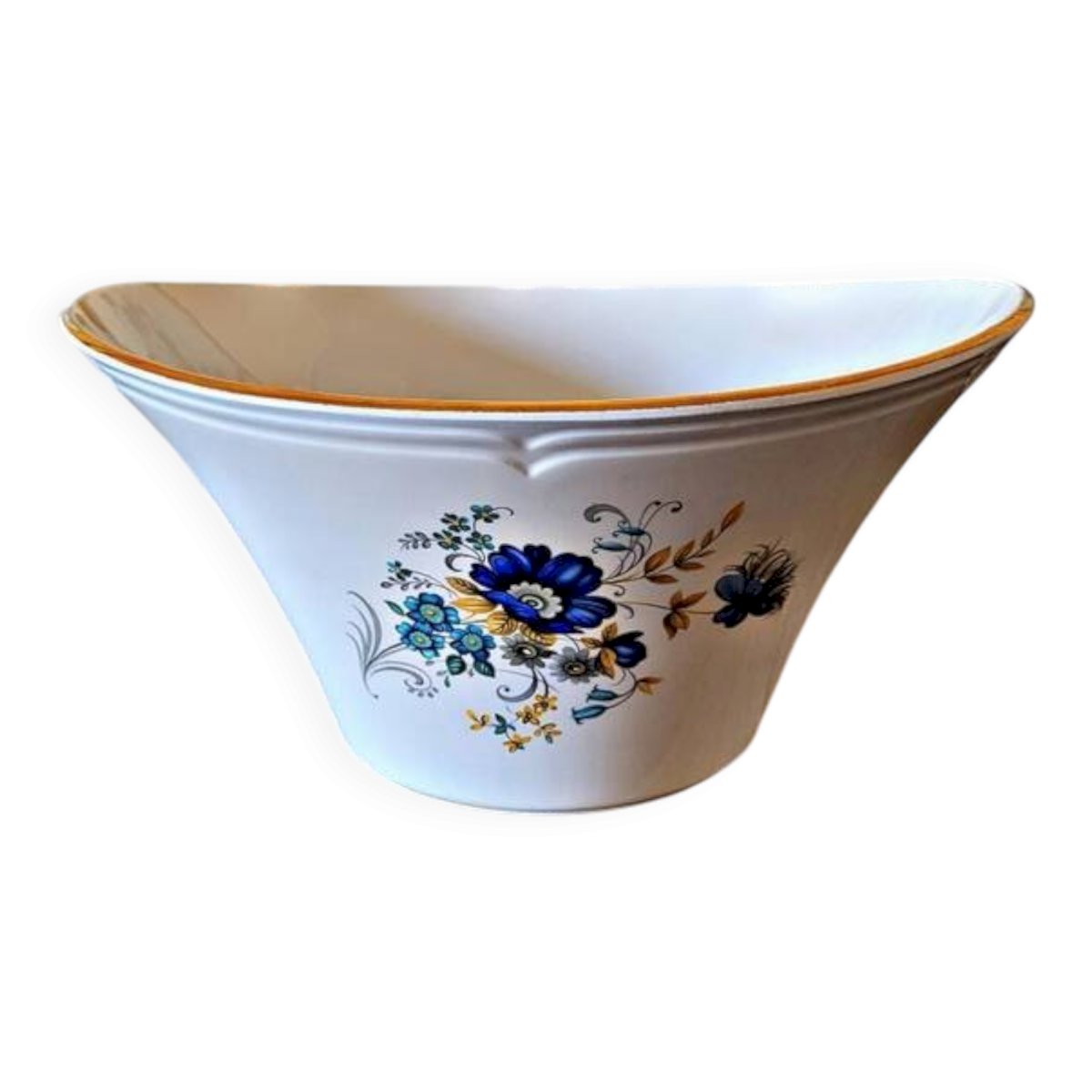 Ce saladier Moulin des Loups – modèle Volubilis illustre parfaitement l’élégance et le raffinement de l’art de la table du milieu du XXᵉ siècle.Le décor délicat de fleurs bleues, souligné par un fin liseré doré, apporte douceur et lumière à la pièce.