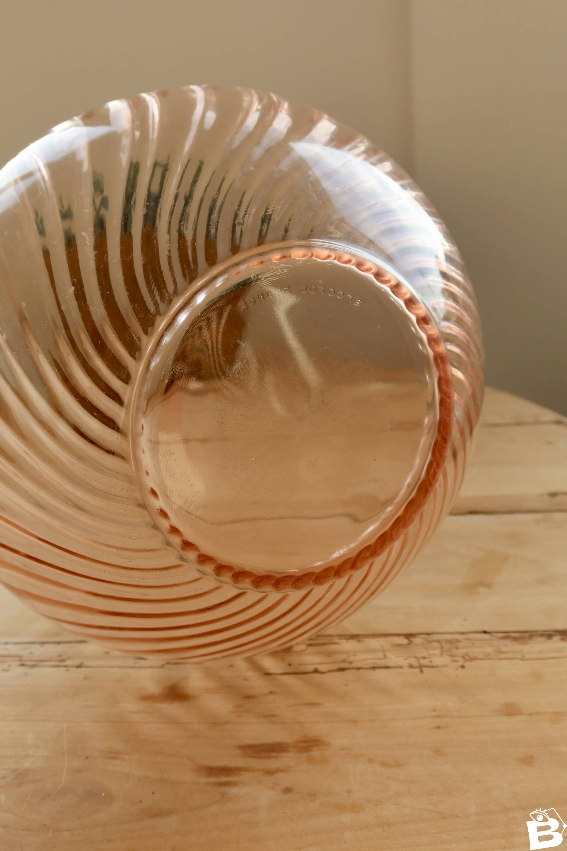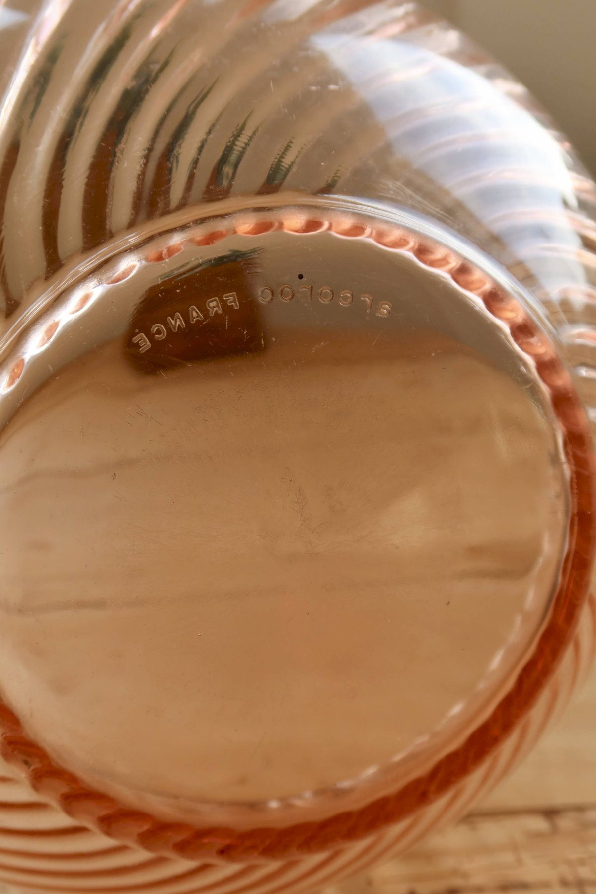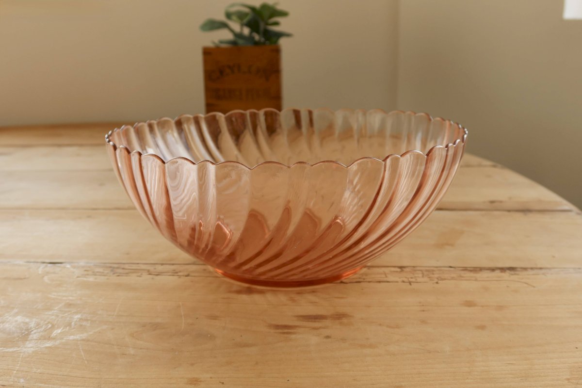 Saladier vintage en verre Rosaline Arcoroc, reconnaissable à sa teinte rose délicate et à son décor nervuré aux lignes élégantes.