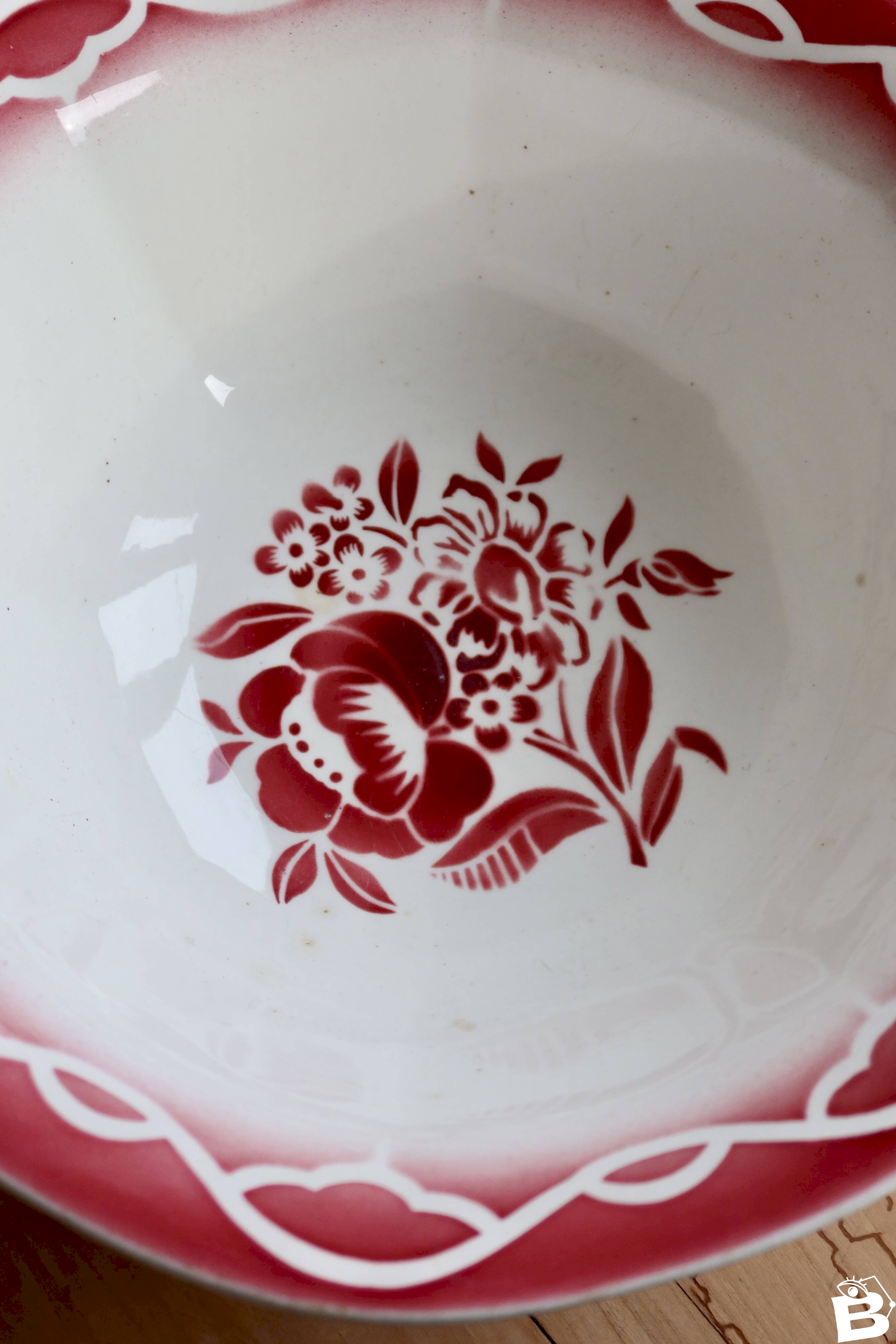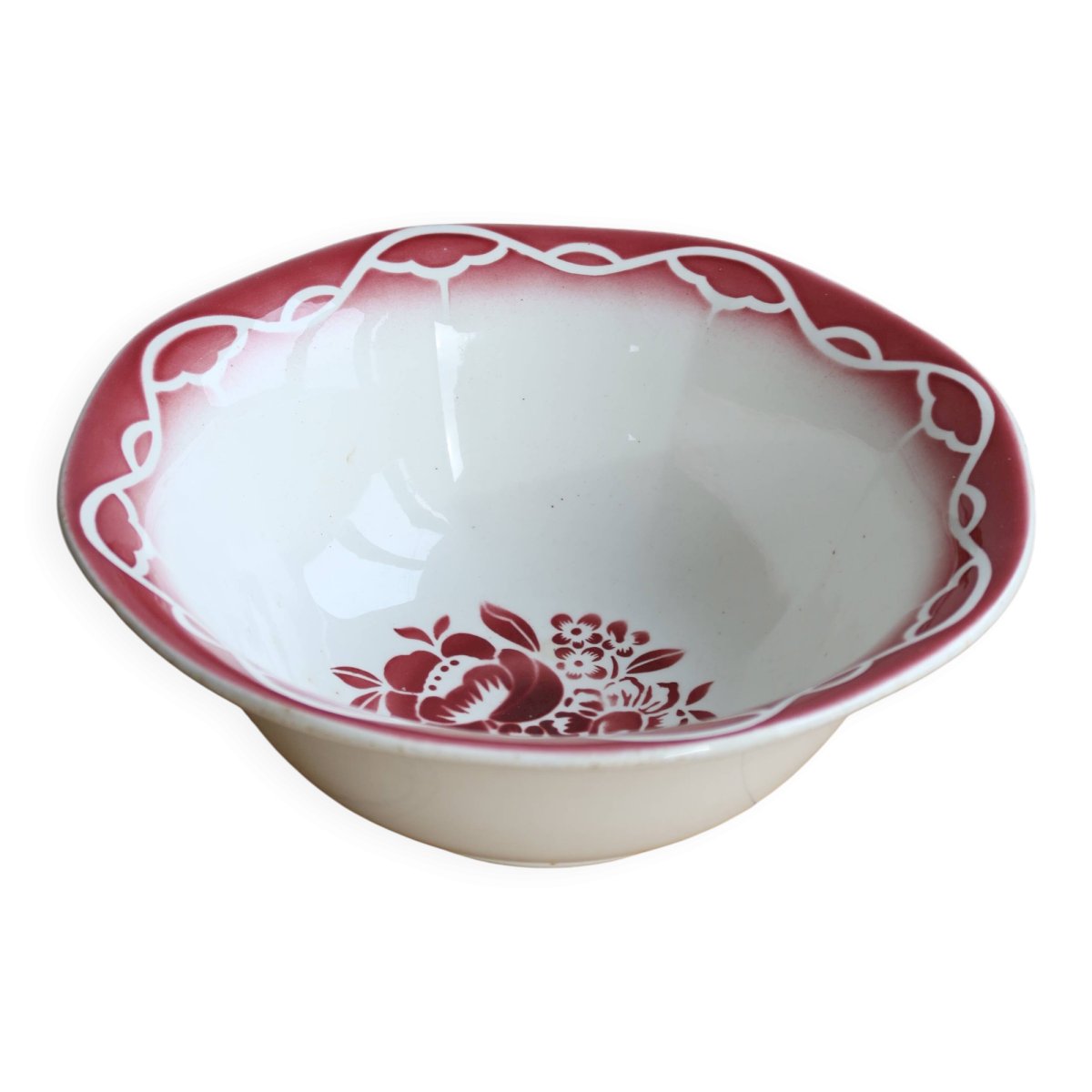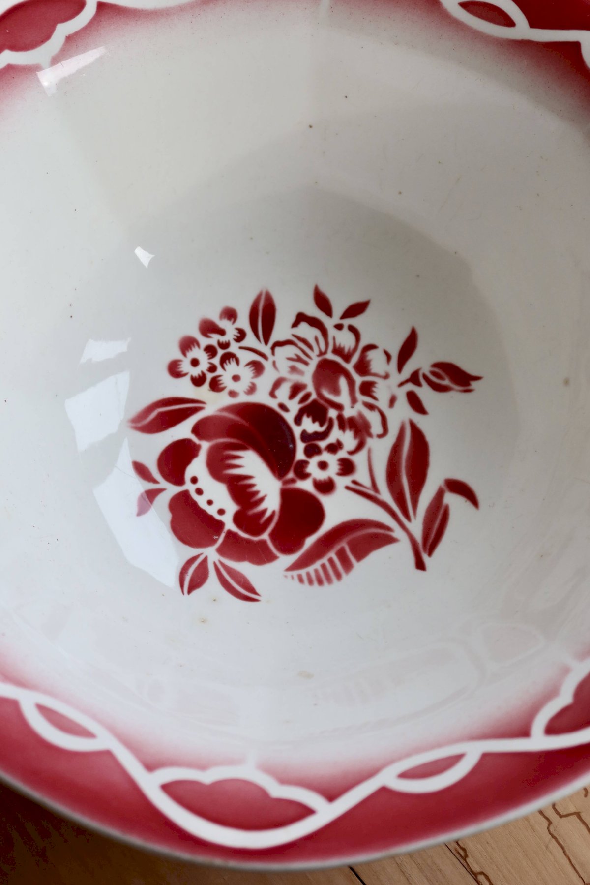Saladier en faïence blanche signé Digoin Sarreguemines, modèle Odette, décoré d’un motif floral rouge vif avec frise en dégradé sur l’aile.
