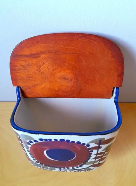 Cette boîte à sel de Beth Breyen pour Royal Copenhagen, datant de 1960, est un bel exemple de design mid-century modern. Fabriquée en céramique avec un couvercle en teck, elle présente des motifs colorés et artistiques typiques de l'époque. Idéale pour les collectionneurs ou pour ajouter une touche vintage à votre cuisine.