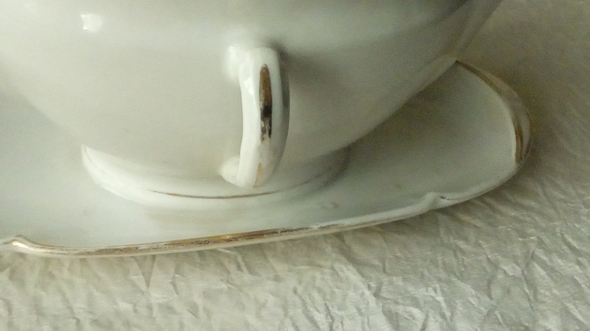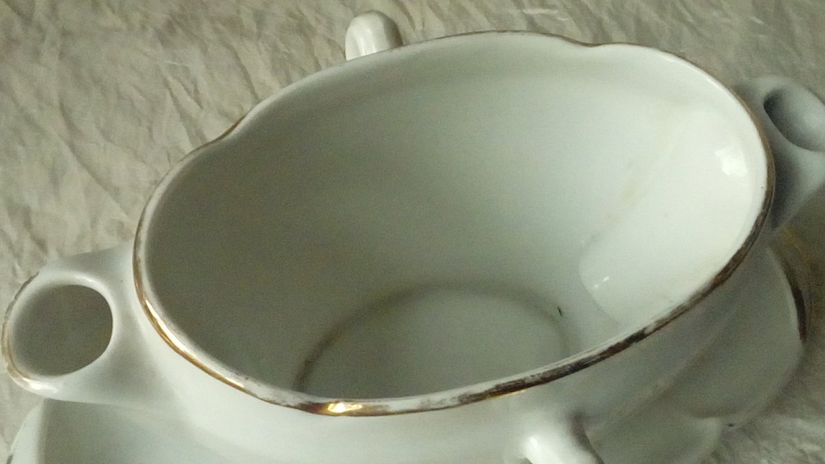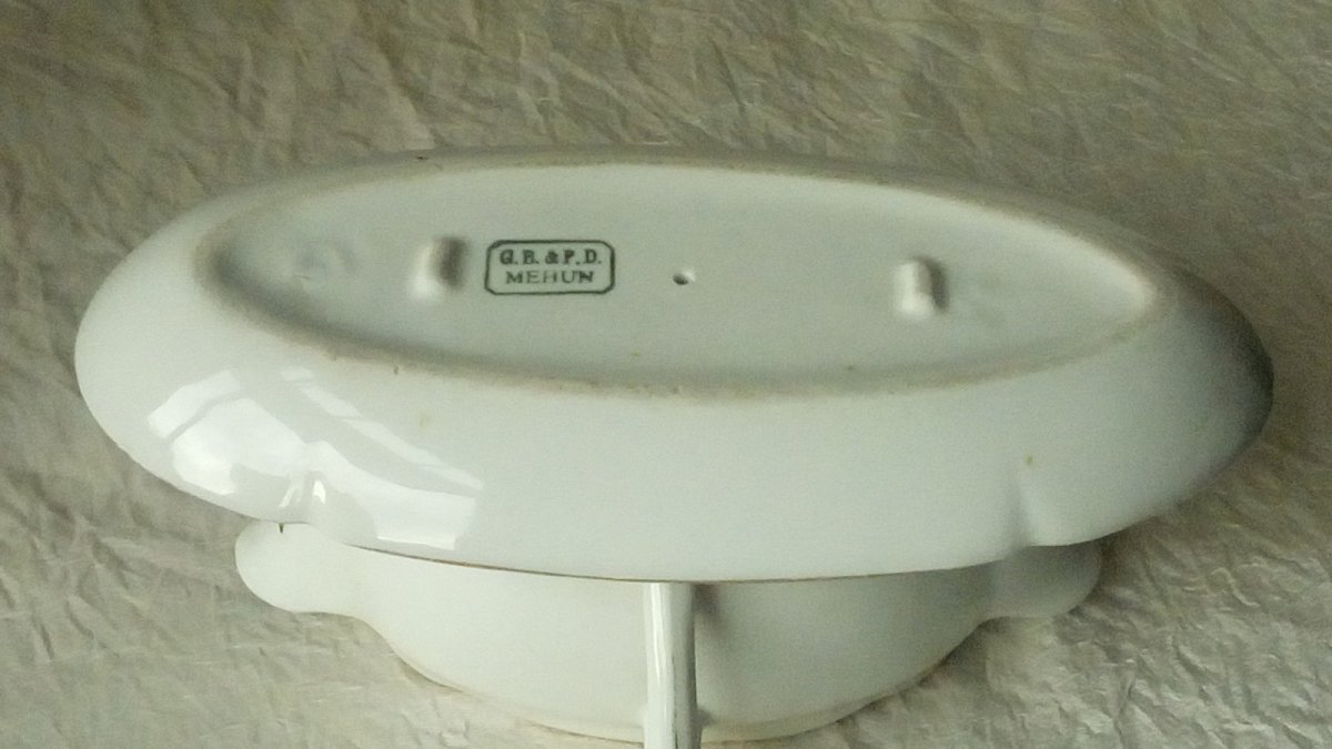 TRES BELLE SAUCIÈRE EN PORCELAINE PORCELAINE ÉPAISSE SIGNÉE G.B&P.D MEHUN LONGUEUR 20 cm HAUTEUR 8.50 cm LARGEUR 12 cm LÉGÈRES TRACES D'USAGE VISIBLE SUR LES PHOTOS EN BON ÉTAT Pays d'origine:France