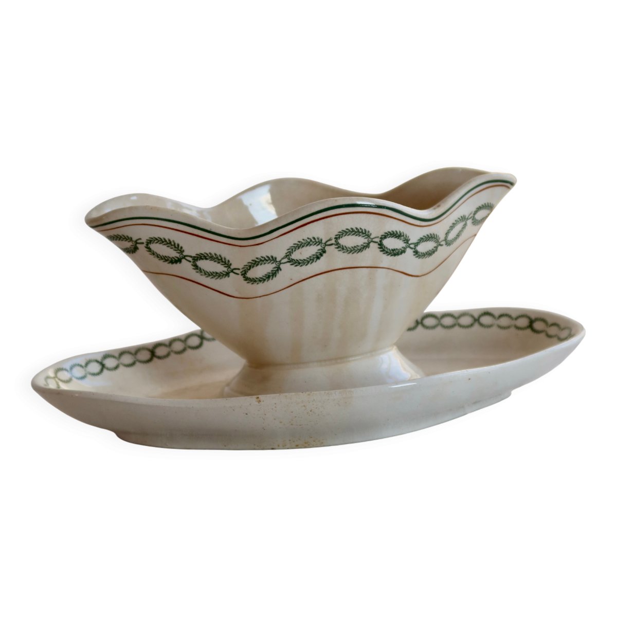 Saucière ancienne en terre de fer Saint-Amand modèle 3003, composée de sa saucière sur son plateau assorti, décorée d’une frise végétale verte soulignée d’un liseré brun.