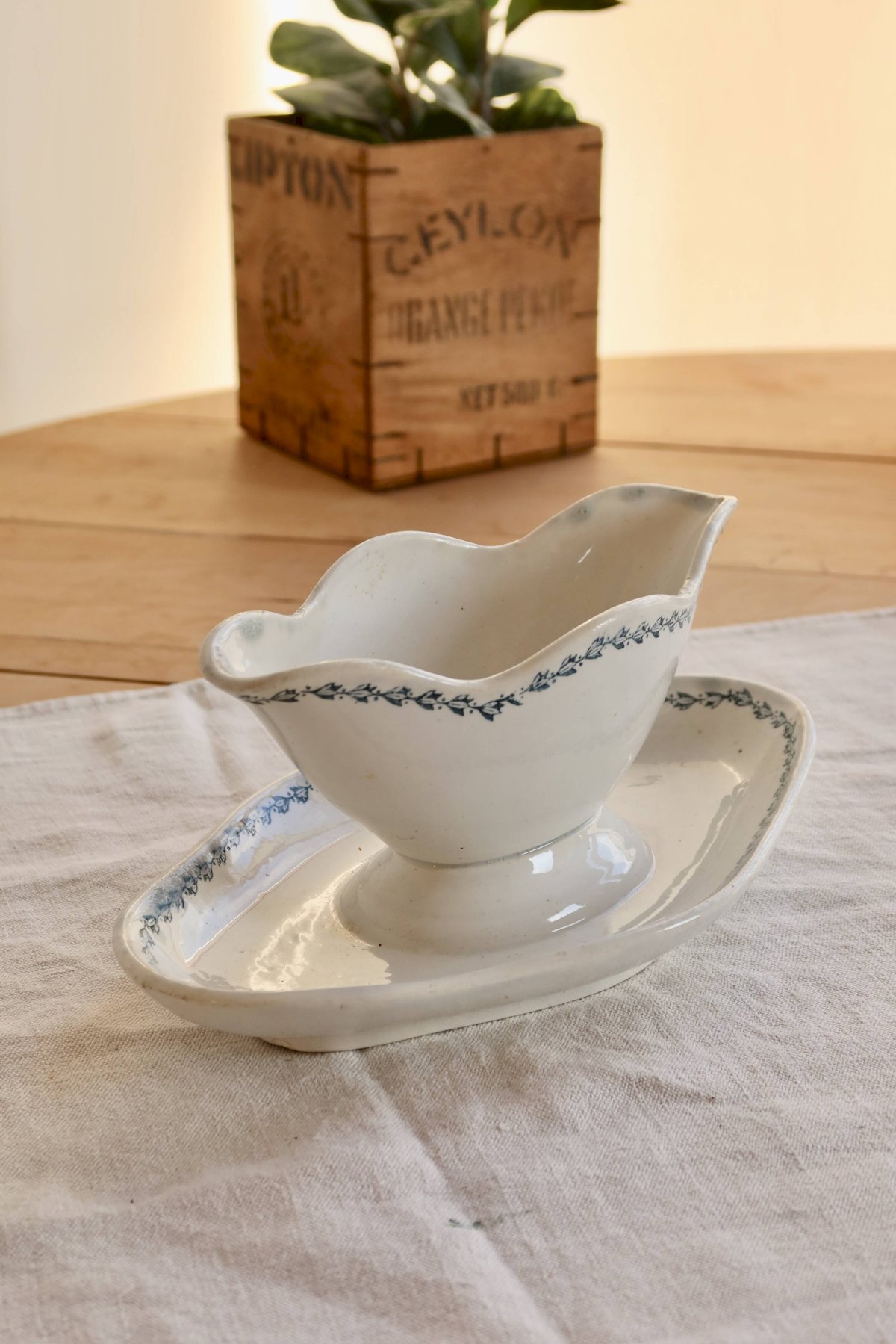 Saucière ancienne en terre de fer Saint-Amand modèle 4022, composée de sa saucière et de son plateau assorti, décorée d’un fin liseré fleuri bleu délicat.