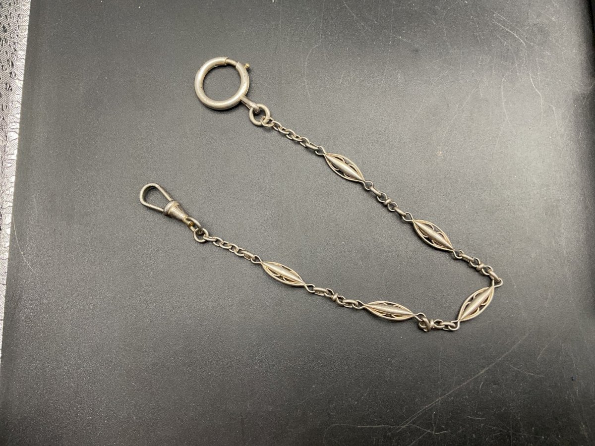 Chaine de Montre CHATELAINE en Argent  XIXème . Longueur : 24,5cm Authenticité:Original Type:Objet de vitrine, Décoratif Origine:France Sous-type:Horloge, Pendule Matière:Argent massif Style:Napoléon III