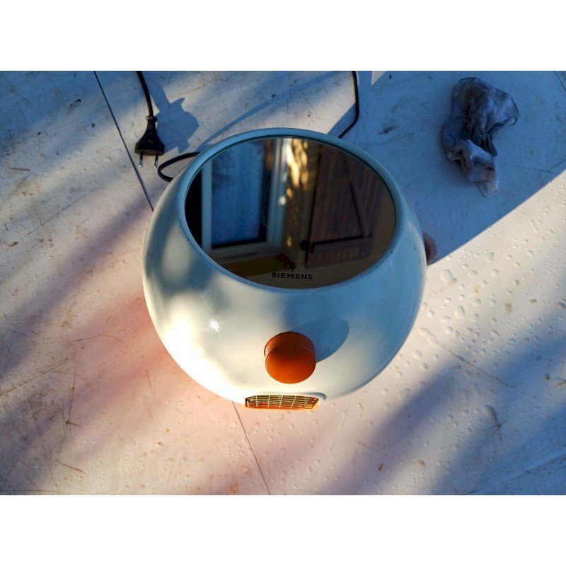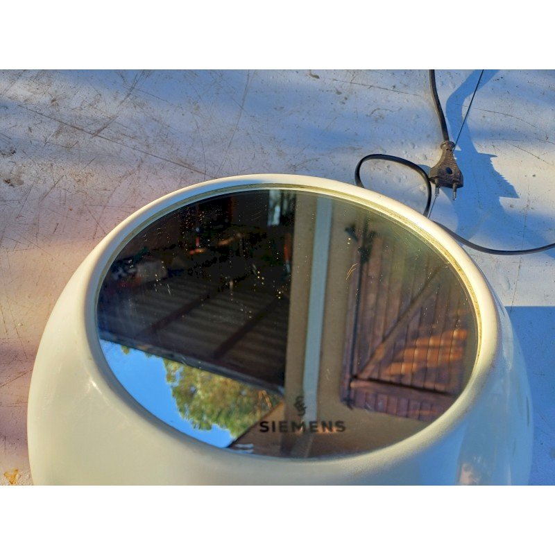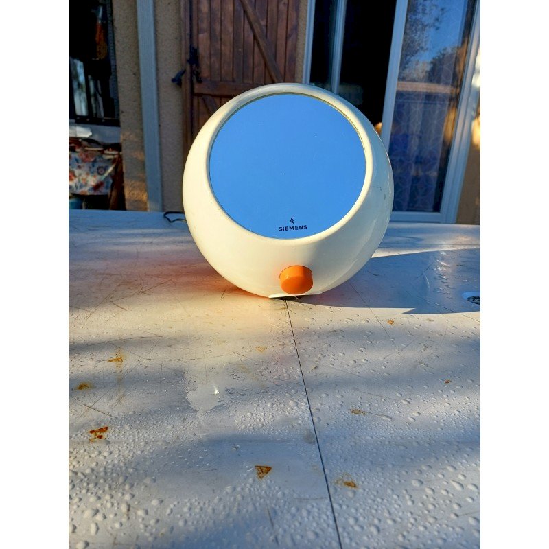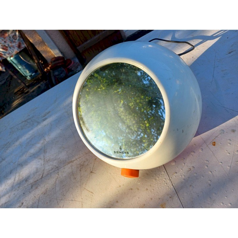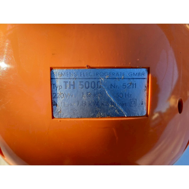 Seche Mains Siemens TH 5000 par Roger Tallon Design emblématique :Conçu par Roger Tallon pour Siemens, son style "Space Age"  années 1970.Double fonction :Il sert à la fois de sèche-mains soufflant et de miroir.Matériaux :Il est fabriqué en plastique orange et blanc, couleurs caractéristiques de l'époque. Diam : 25 cm , Poids : 2,8 Kg , trés bon ètat , Fonctionnel