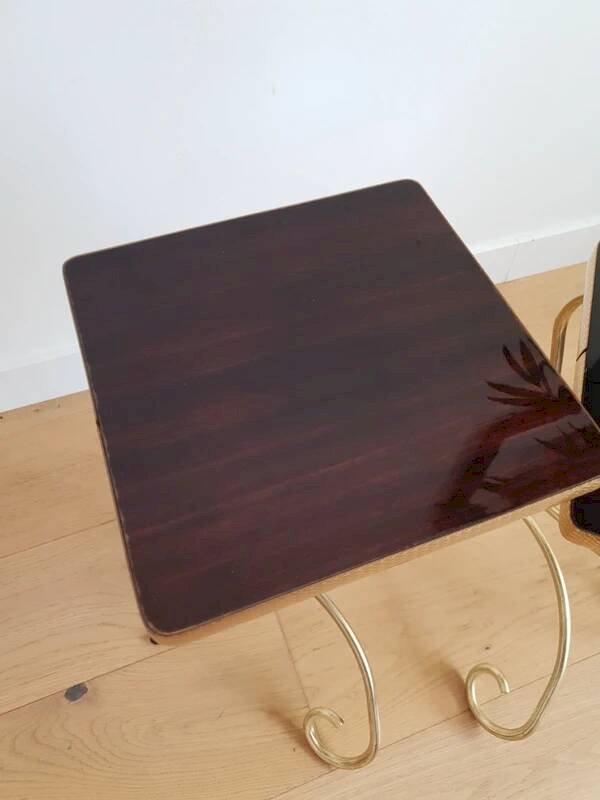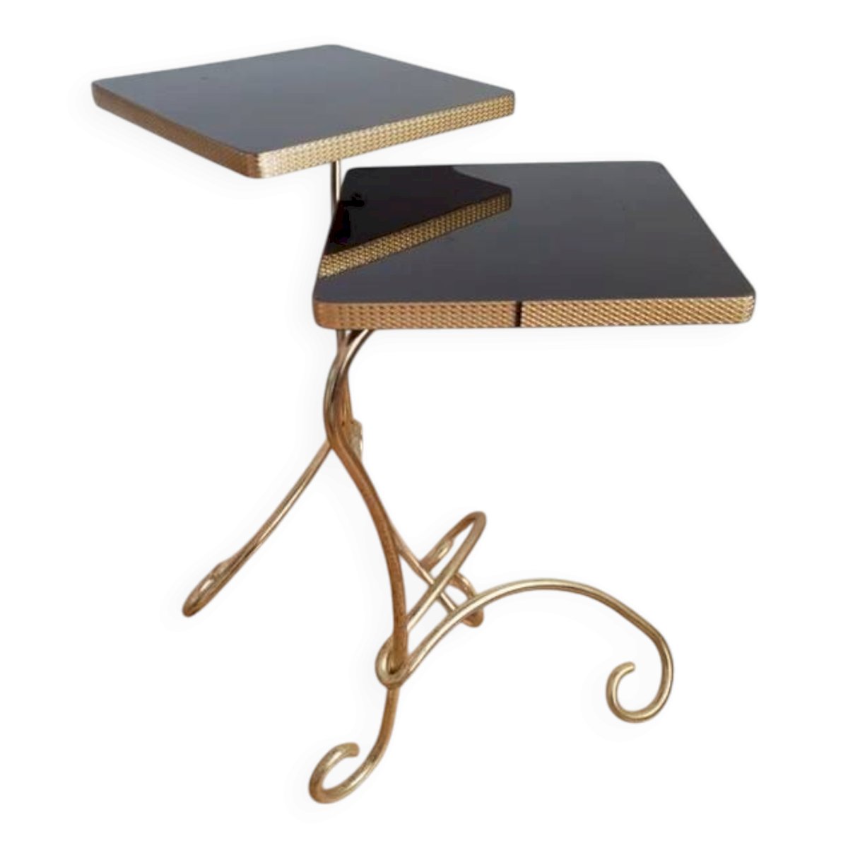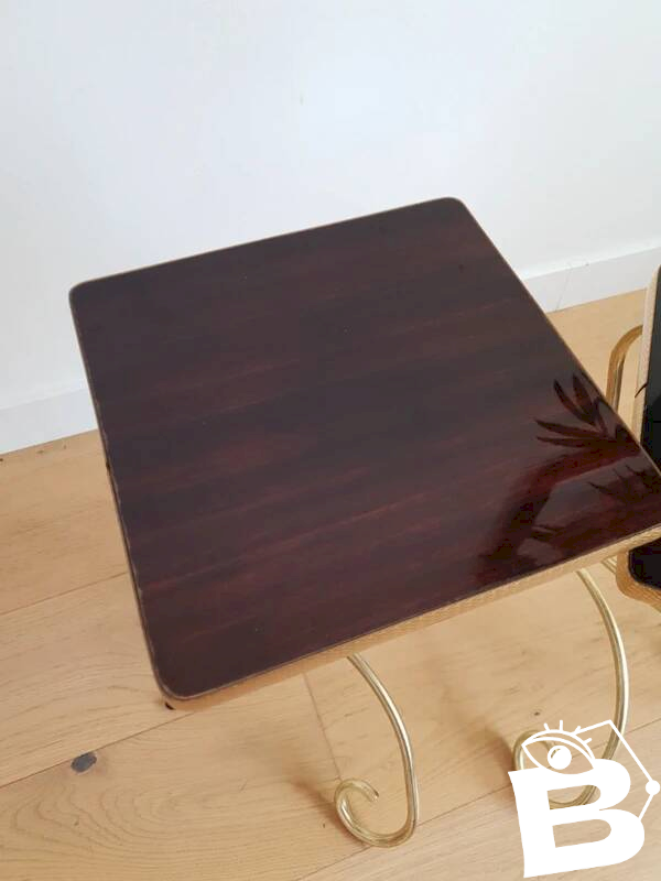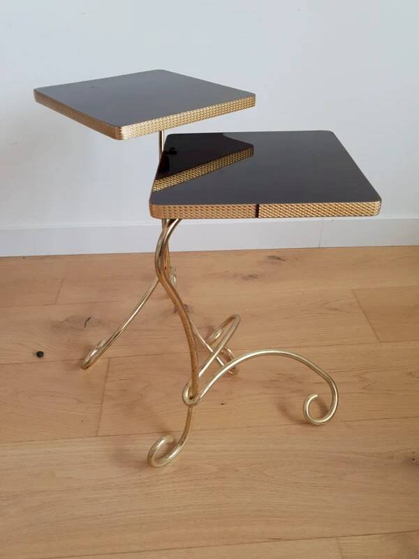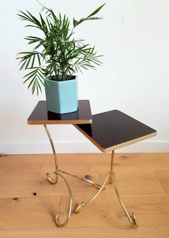 Duo de selettes vintage, plateau en formica, piètement en laiton, pourtour des plateaux dorés.A utiliser en porte plantes, bout de canapé etc...Très bon état général.Hauteur 45 cm et 41 cm.Plateau 22.5 cm X 22.5 cm.