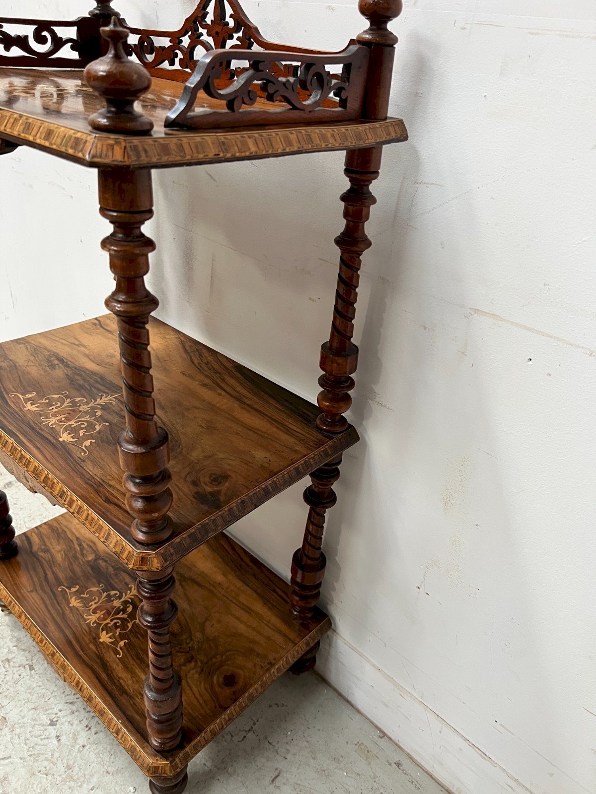 Console Napoléon III en acajou marqueté Trois plateaux marqueté de motif géométrique Quatre montants en bois tourné Quatre pieds toupies a roulettes Très bon état Dimension H 104 x L 53 x 36 cm Epoque XIX siècle Type:Table Période:XIXème et avant Sous-type:Console Nombre de chaises:Non-spécifié Pays d'origine:France Hauteur:104 Style:Napoléon III Matière:Acajou Longueur:53 Largeur:36 Forme:Rectangulaire