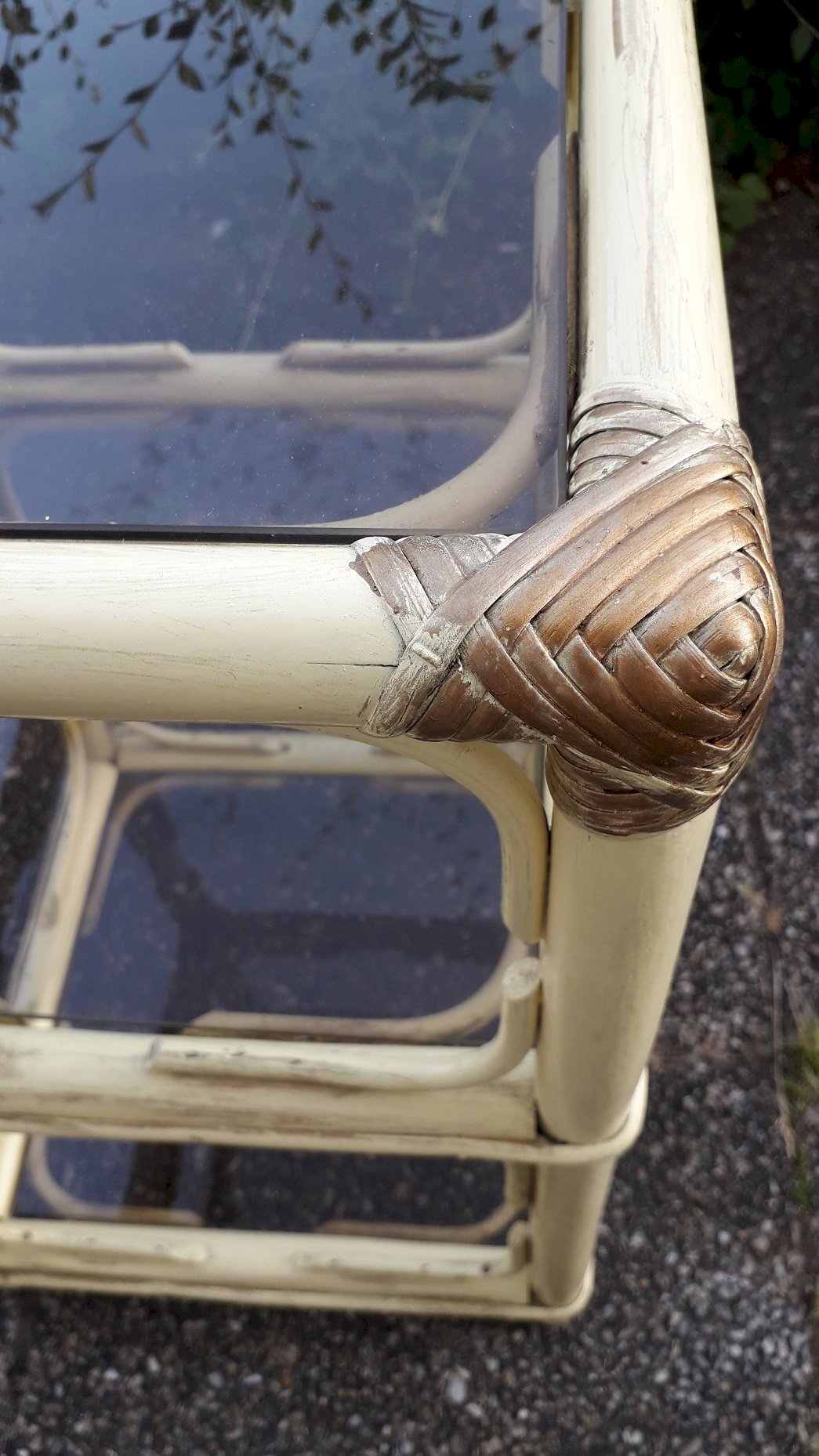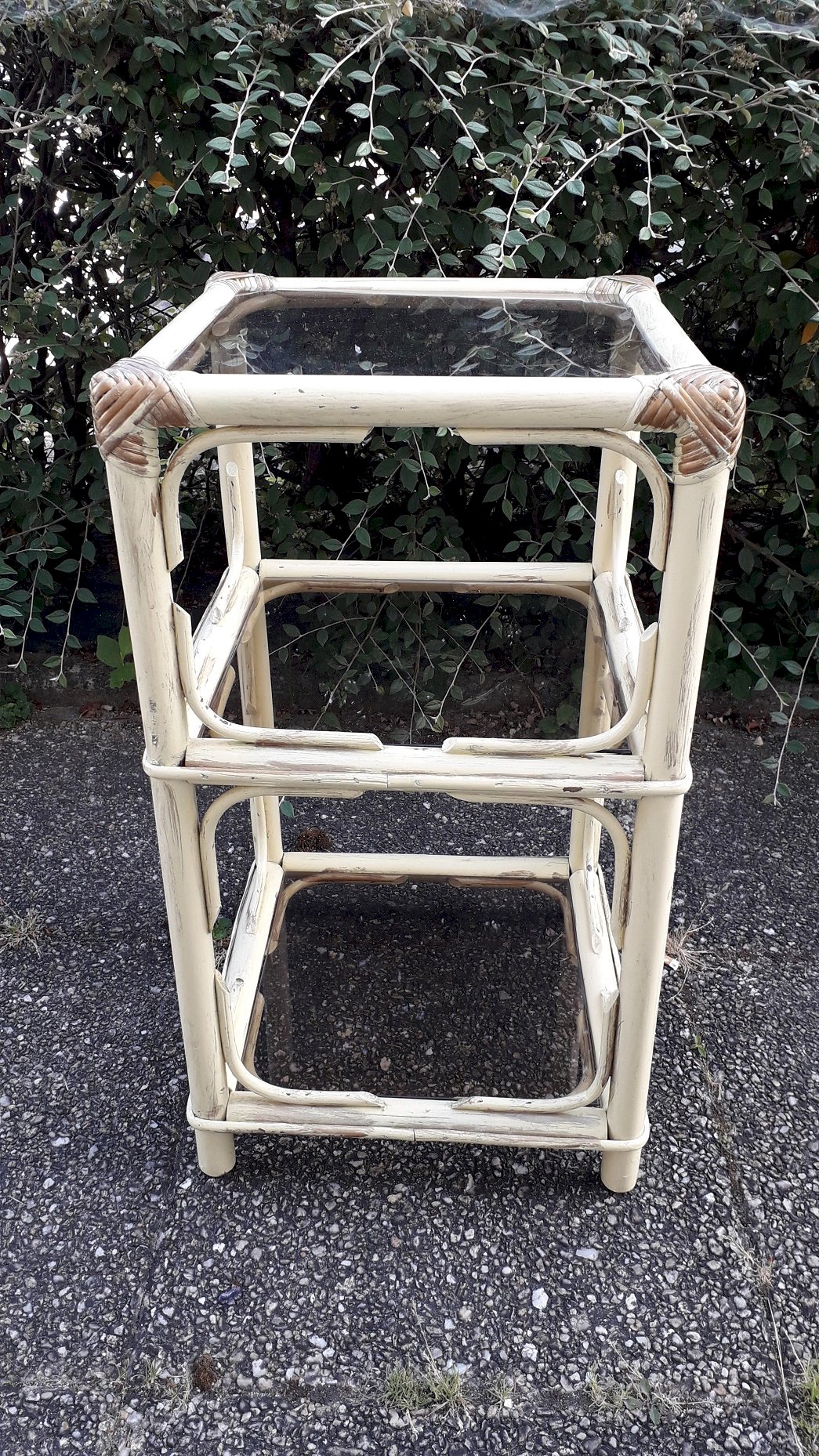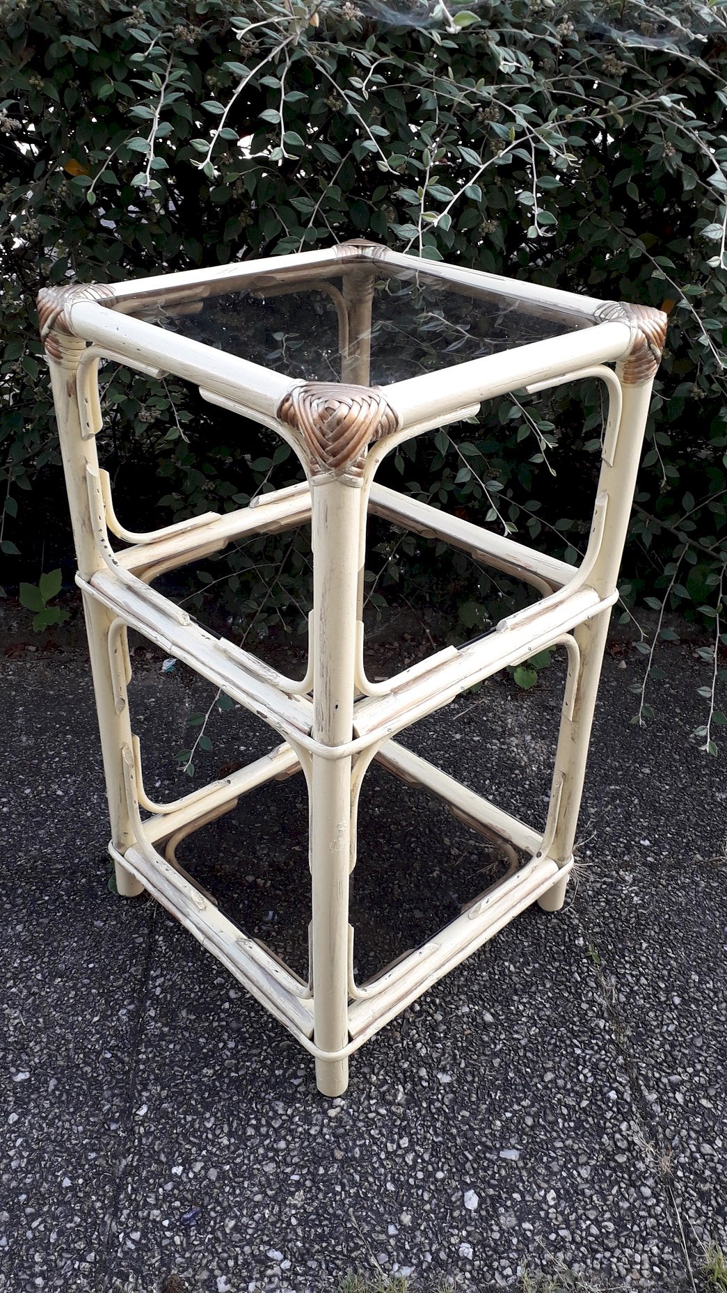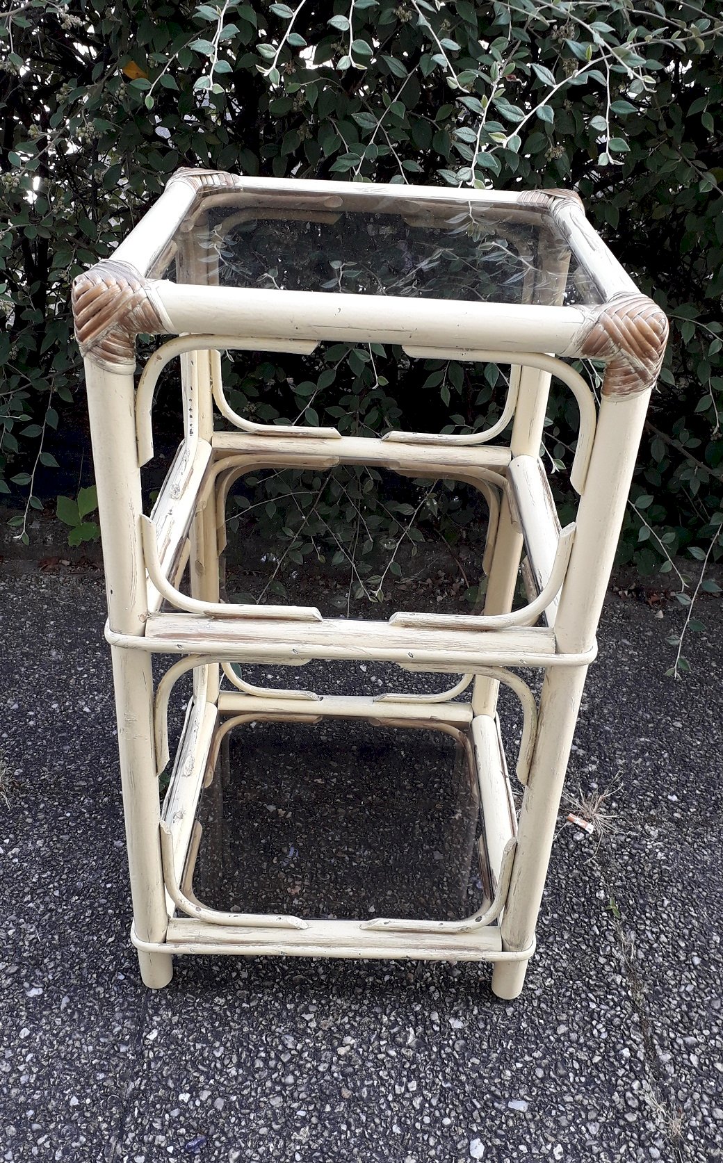 Sellette, table d'appoint ou étagère, en rotin cérusé, à trois plateaux en verre.