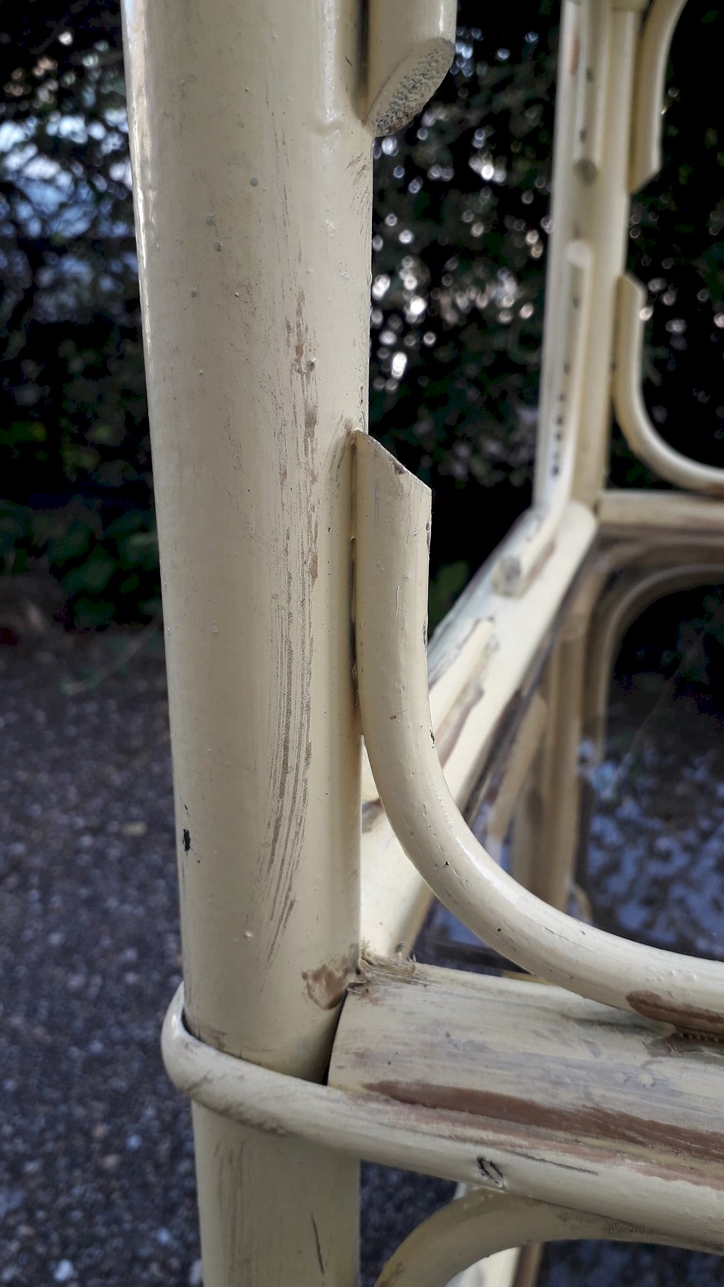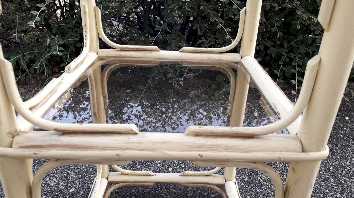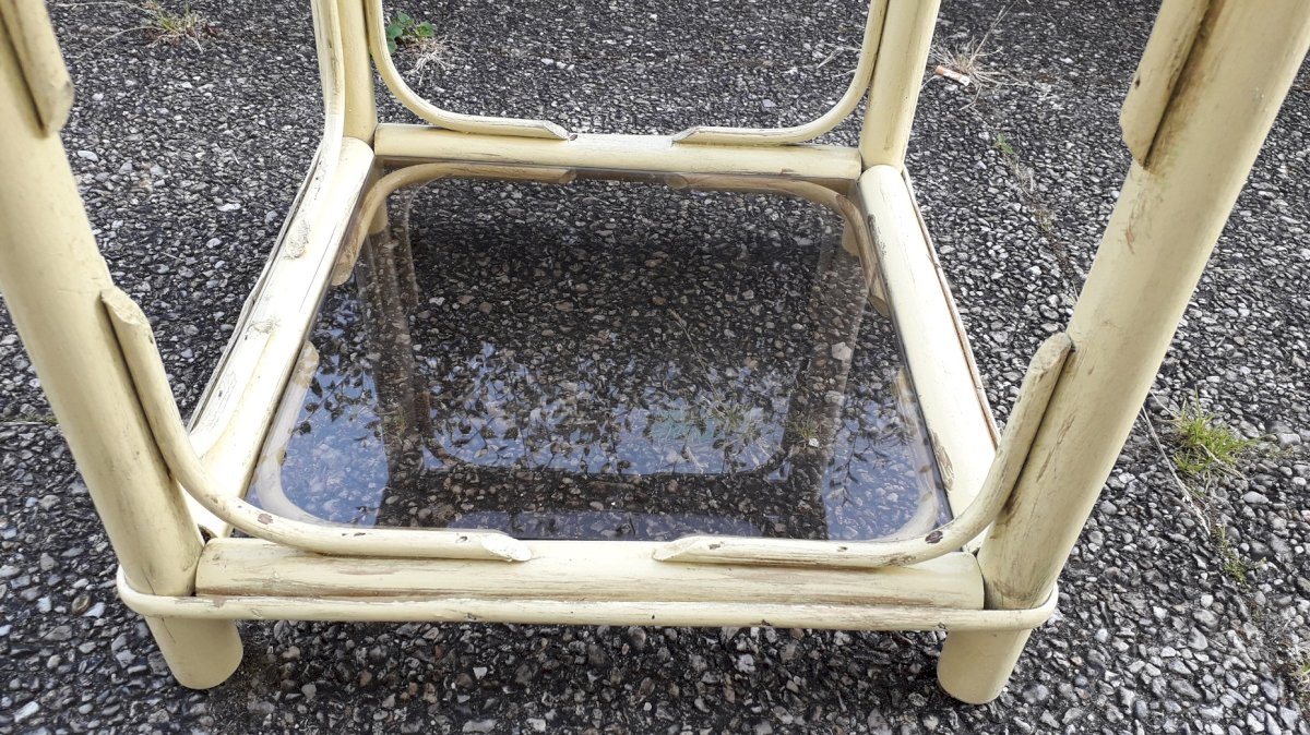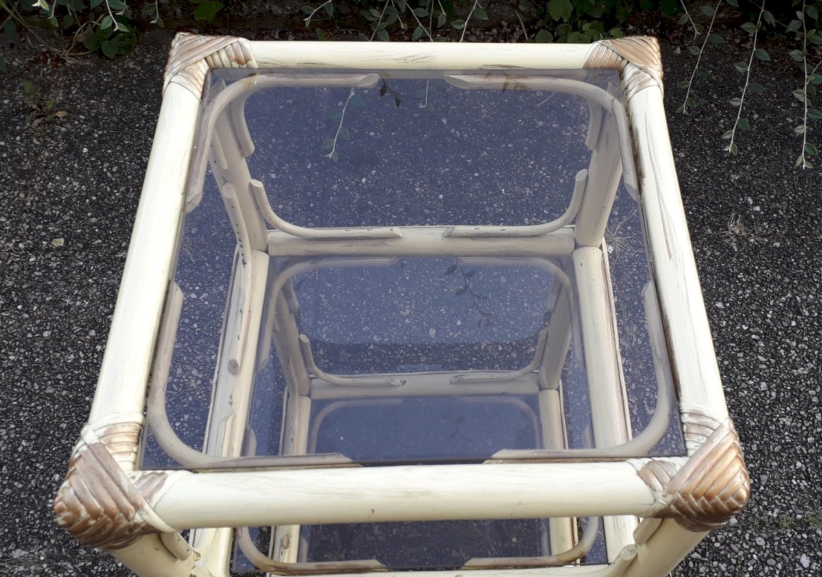 Sellette, table d'appoint ou étagère, en rotin cérusé, à trois plateaux en verre.