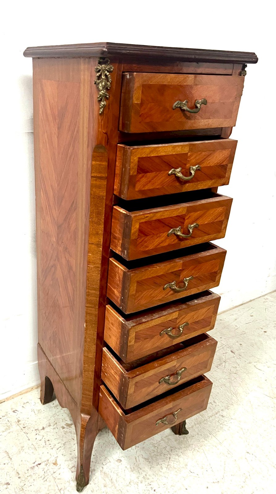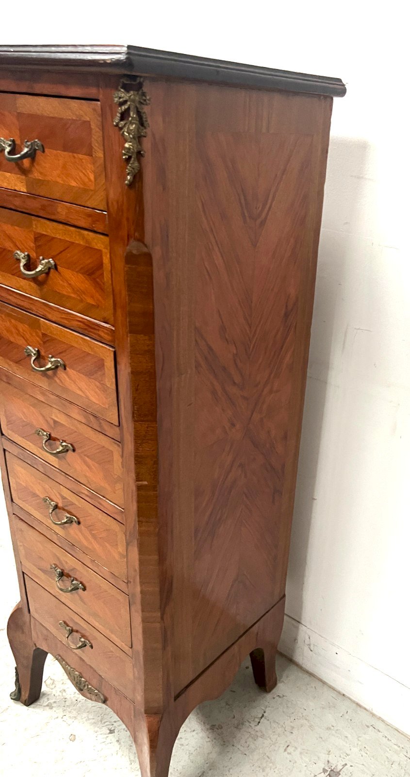 Semainier de style Louis XV en placage de bois de rose  Sept tiroirs a pognée de bronze en façade  Le dessus est en plateau de bois  Bon état  Dimension  H 123 x L 42 x 39 cm  Epoque XX siècle    Type:Commode, Chiffonnier Sous-type:Plus de 3 tiroirs Hauteur:123 Matière:bois de rose Longueur:42 Largeur:39