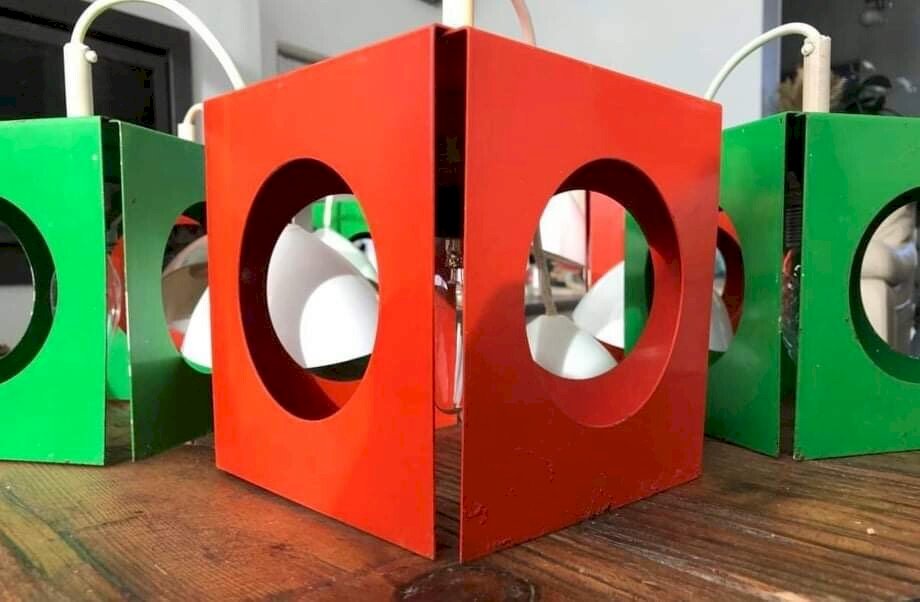 Serie De 6 Lampes Vintage Tôle Pliee Space Age Anciennes. Griffes, rayures et traces d'oxydation (cf photos). Cube de 15cm de côté. Un système de cache des branchements électriques cassé sur une lampe. Envoi en plusieurs colis mondial Relay. Prisunic prism kubus Richard Essig design luminaire suspensions rétro pop industriel orange vert loft