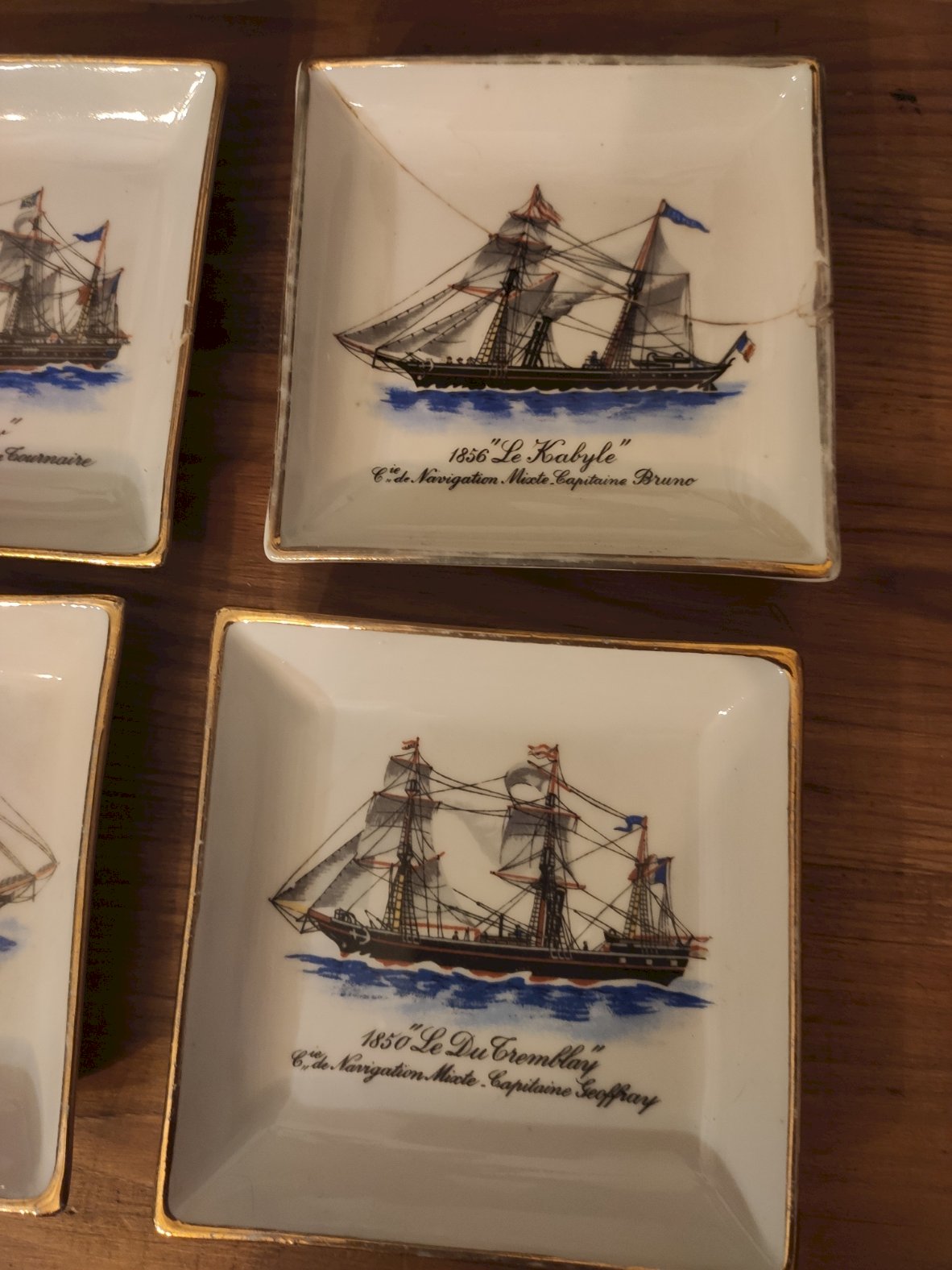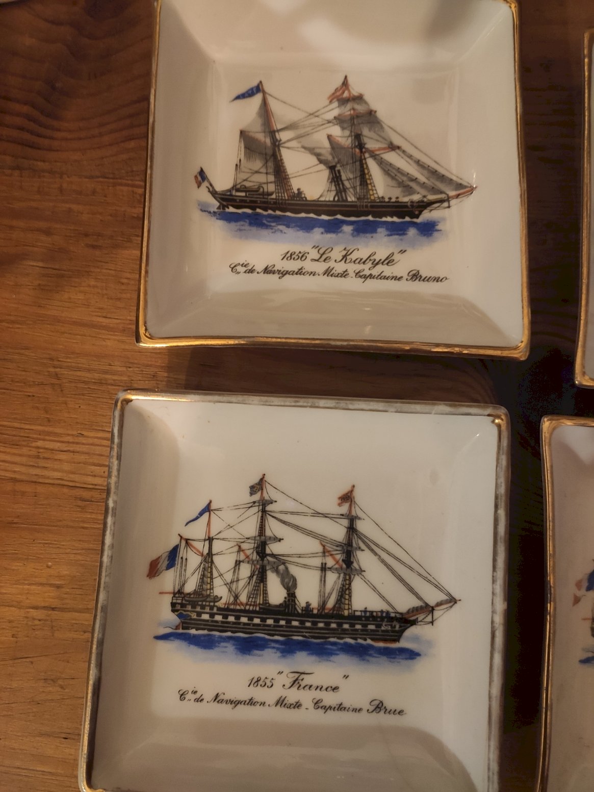 Bel ensemble de 6 vide poches (ou cendrier de table) carrés en porcelaine de Paris, réalisés pour la prestigieuse Compagnie de Navigation Mixte. Chaque pièce illustre un navire historique de la flotte de la compagnie avec des détails de grande finesse. La bordure est soulignée d'un liseré doré à l'or fin.