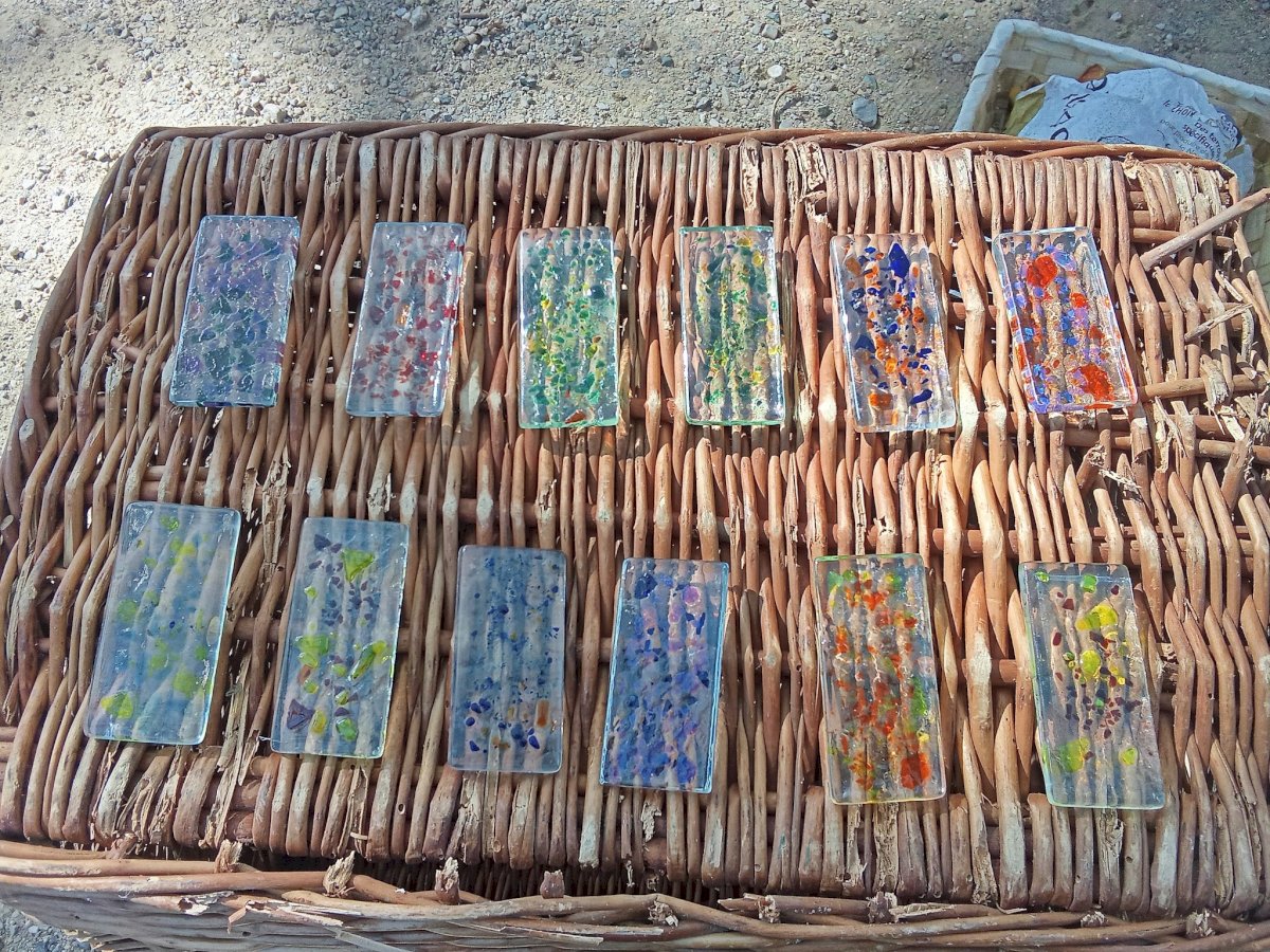 Série de douze porte-couteaux en verre multicolore en bon état.