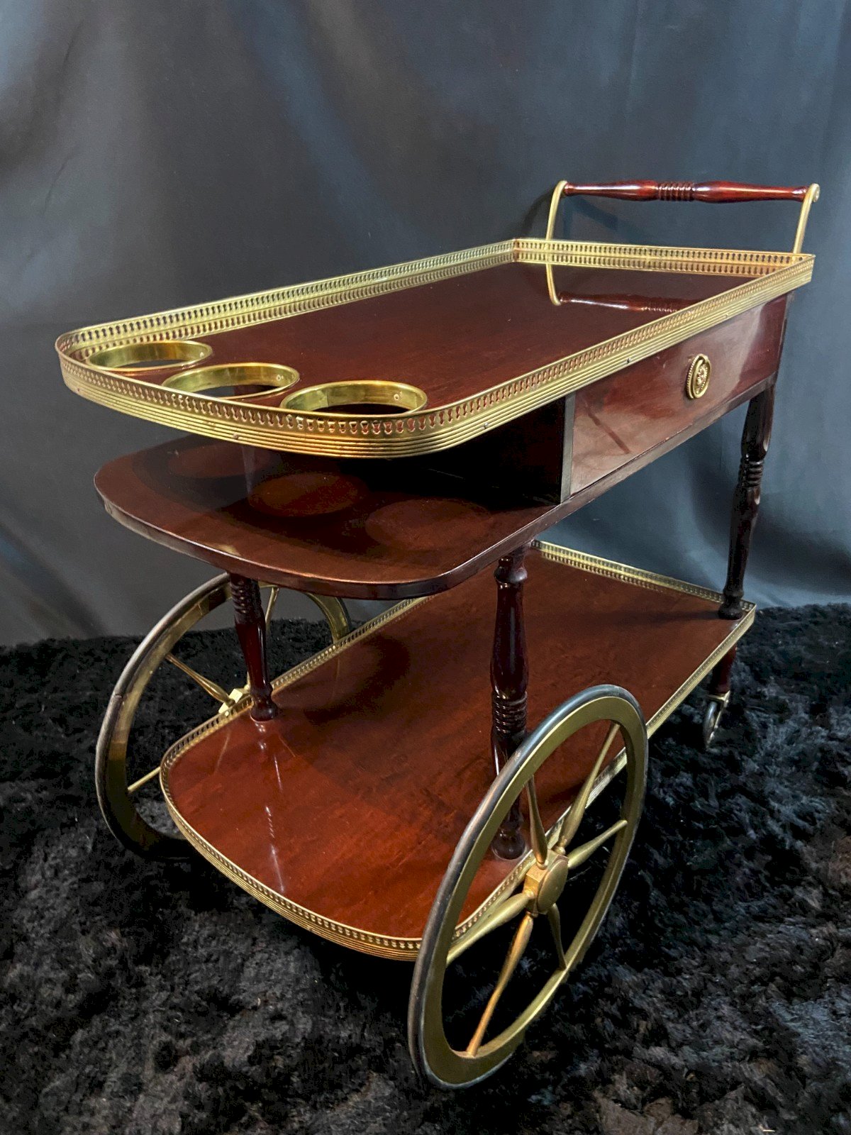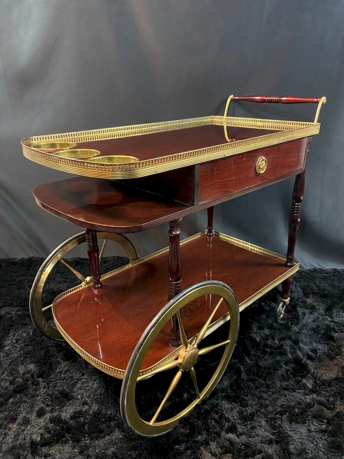 Servante roulante, bar chariot, bar rolling en bois vernis acajou et laiton 1970