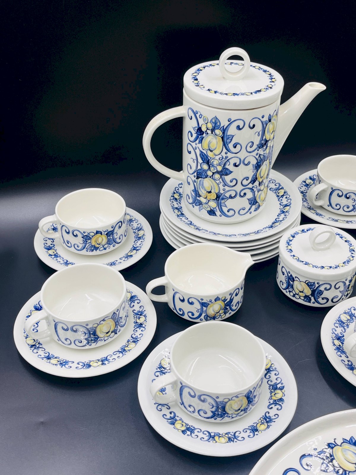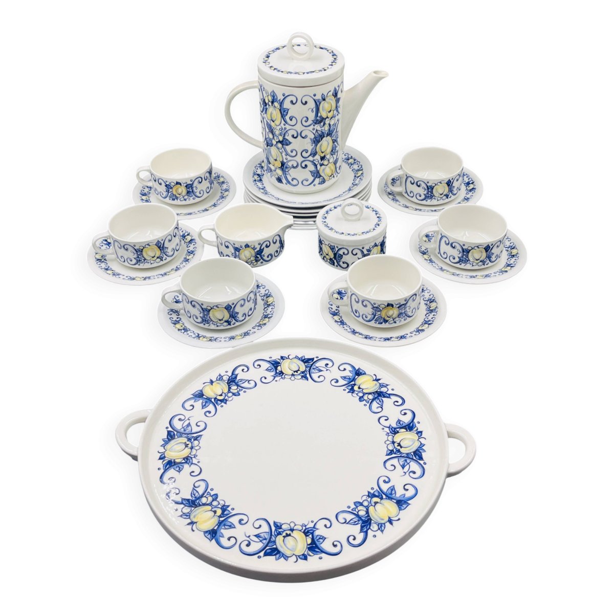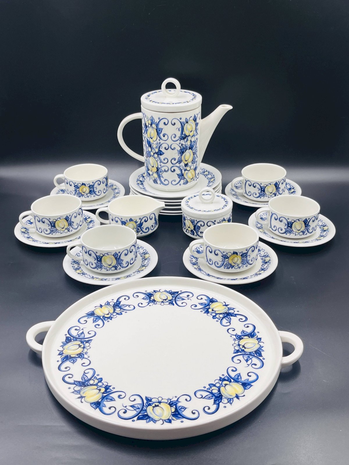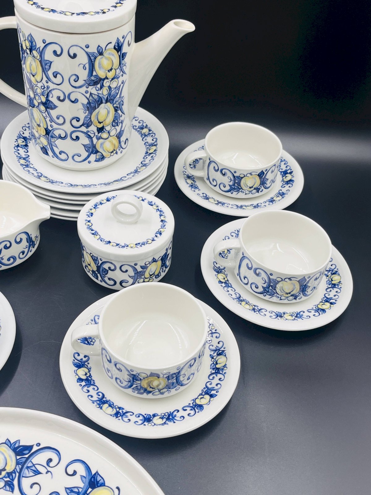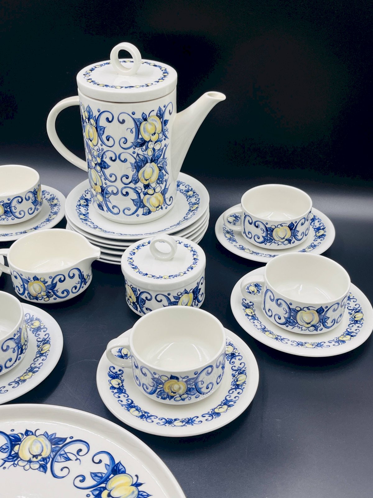 Dimensions : 6 assiettes 19 x 19 x H 2 cm, 6 tasses 11.5 x 9 x H 5.5 cm, 6 sous tasses 15.5 x H 2 cm, 1 cafetière 22 x 12 x H 21 cm, 1 pot à lait 13 x 9 x H 5.5 cm, 1 sucrier 9 x 9 x H 9.5 cm, 1 plat à gâteaux 36 x 30 x H 2.5 cm.