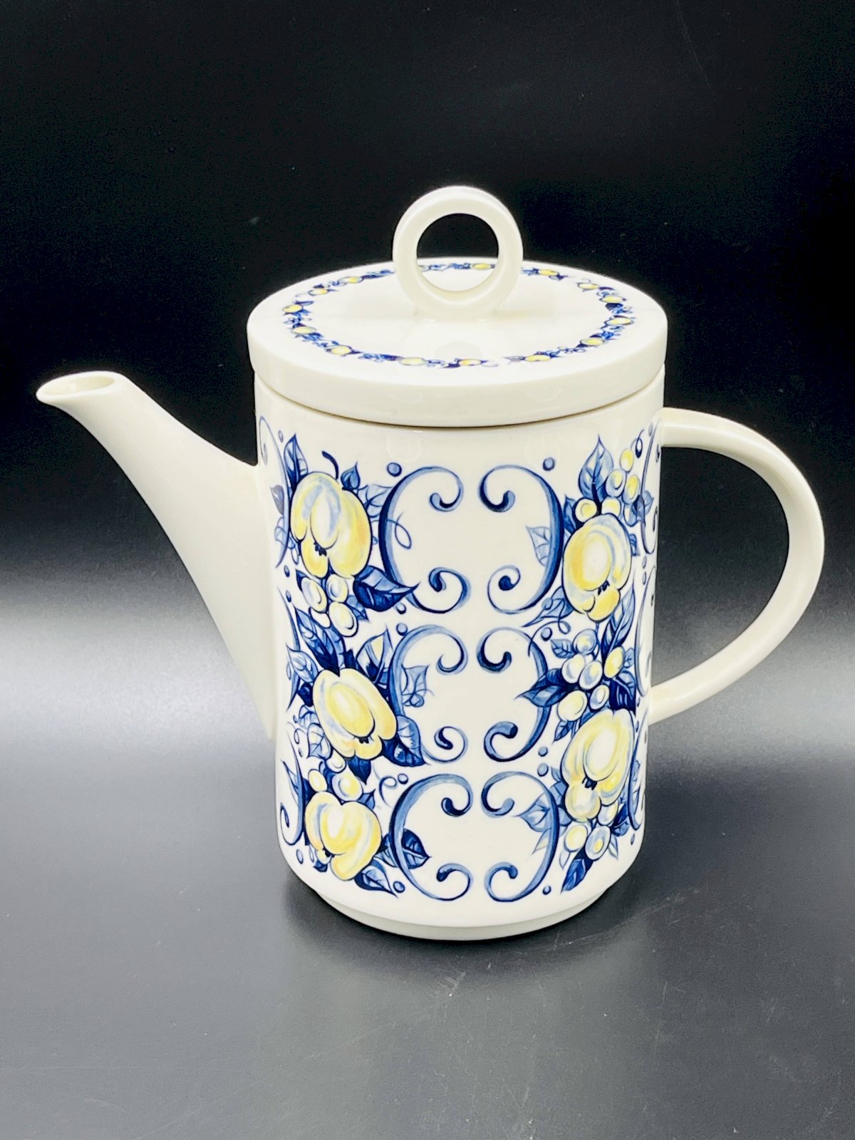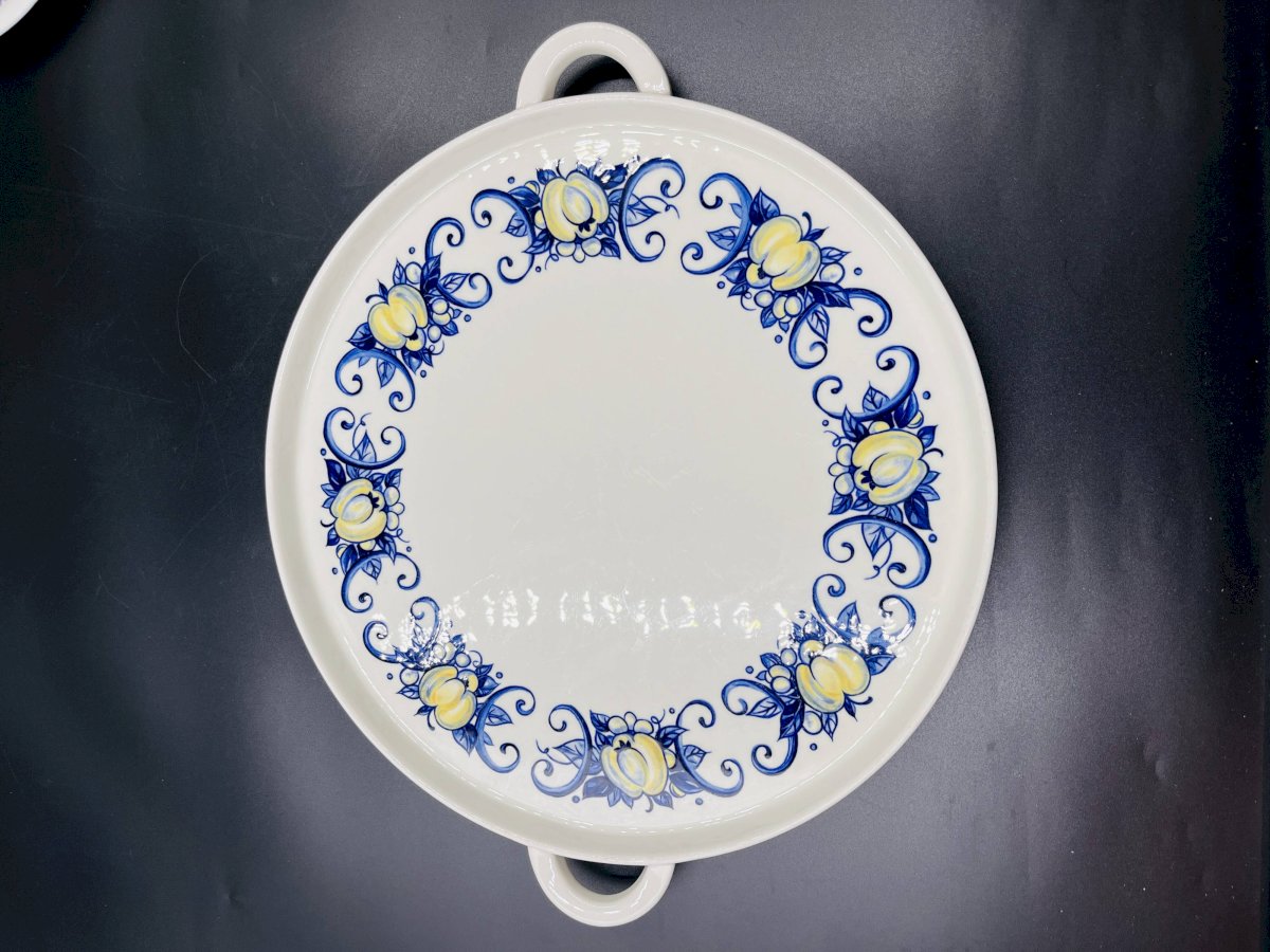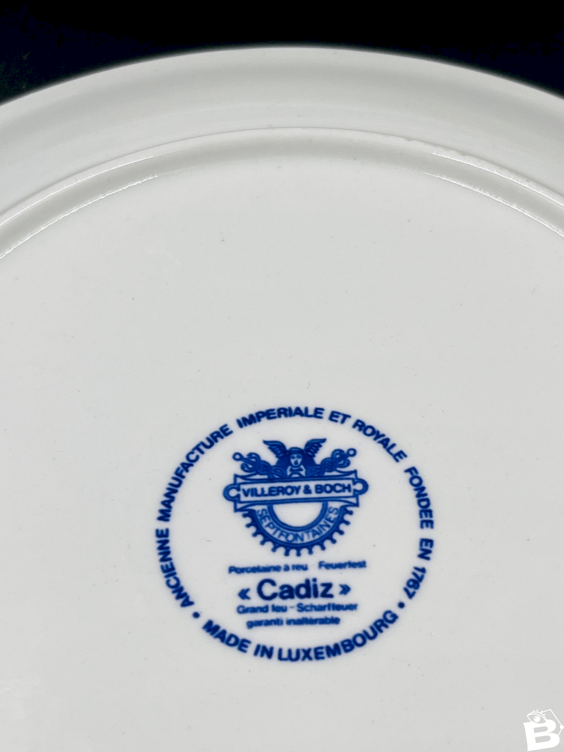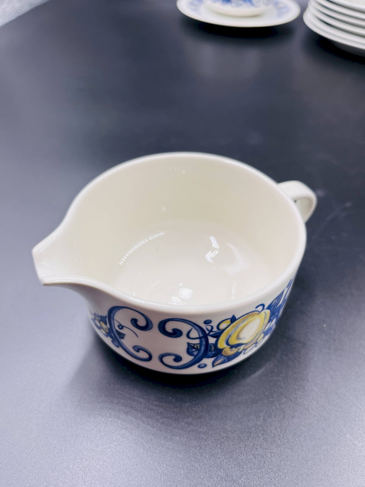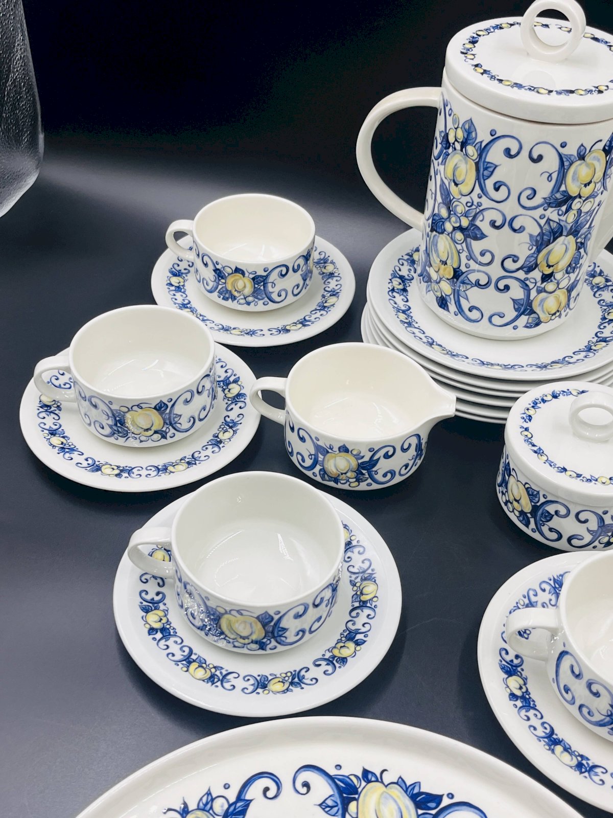 Dimensions : 6 assiettes 19 x 19 x H 2 cm, 6 tasses 11.5 x 9 x H 5.5 cm, 6 sous tasses 15.5 x H 2 cm, 1 cafetière 22 x 12 x H 21 cm, 1 pot à lait 13 x 9 x H 5.5 cm, 1 sucrier 9 x 9 x H 9.5 cm, 1 plat à gâteaux 36 x 30 x H 2.5 cm.