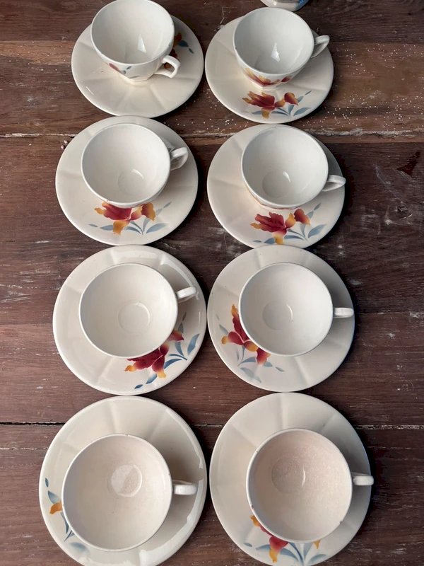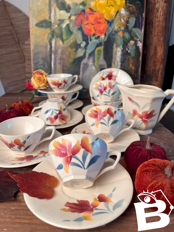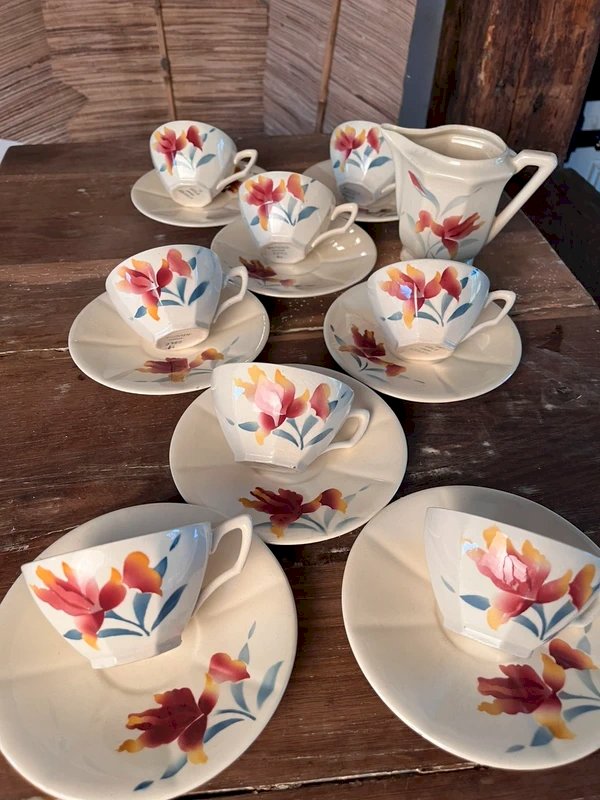 Service à café Digoin Sarreguemines 9325 en faïence ancienne, composé de 8 tasses et sous-tasses et 1 pot à lait.