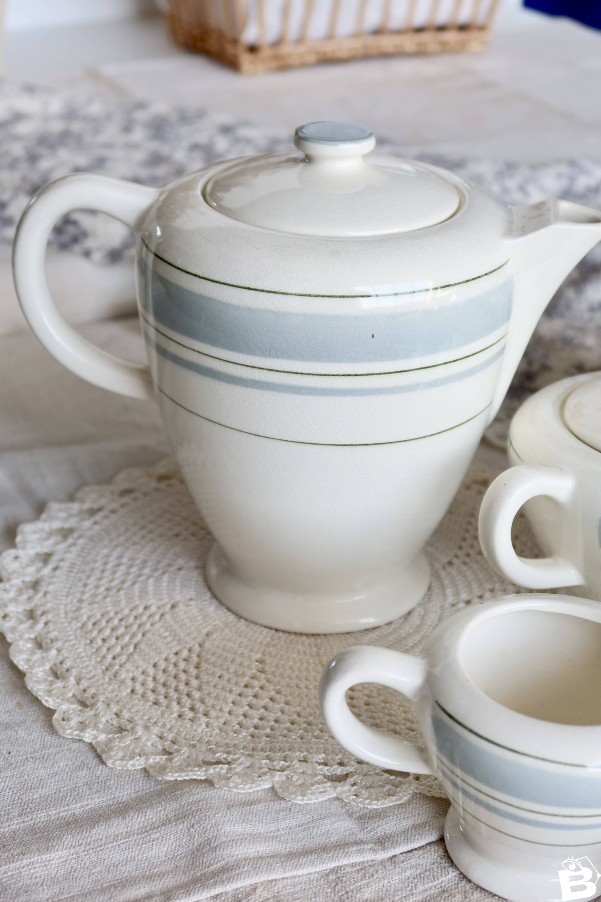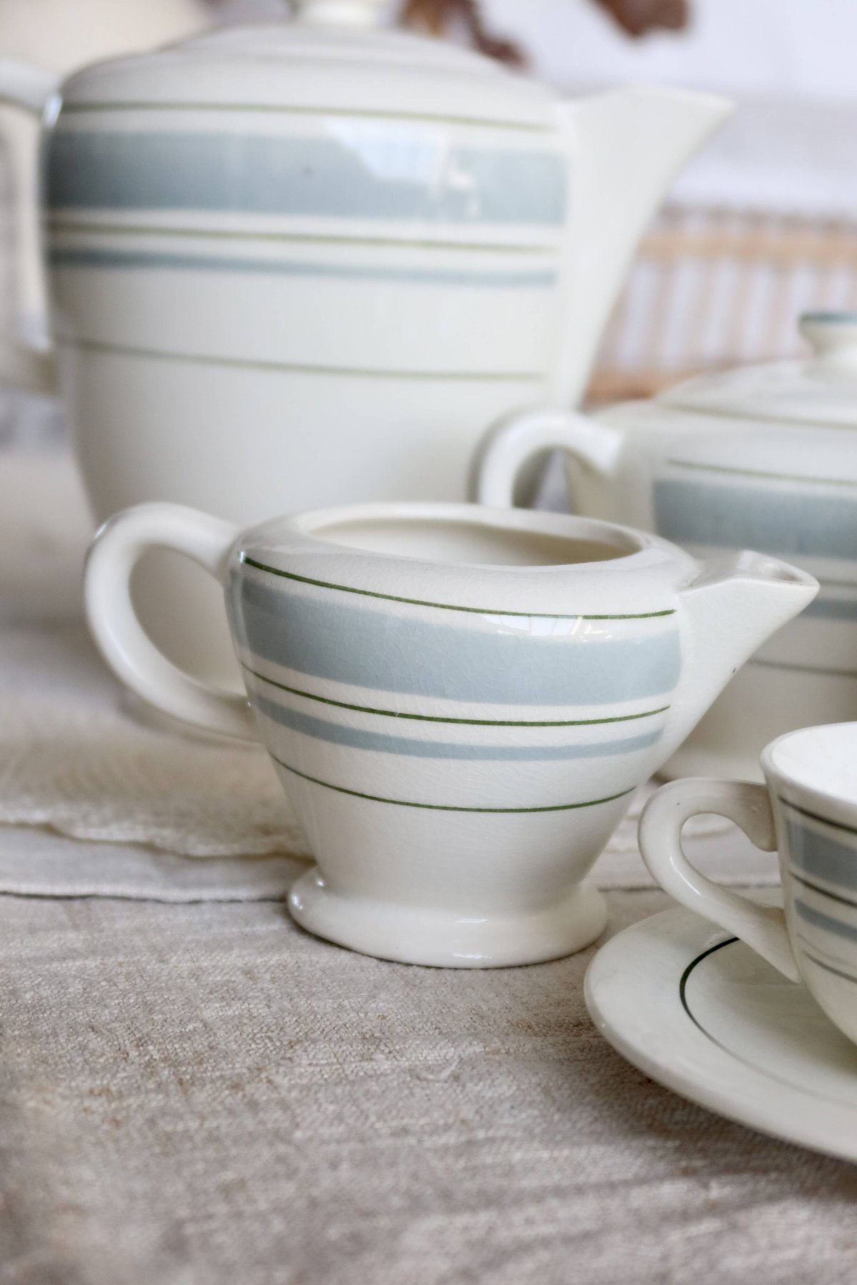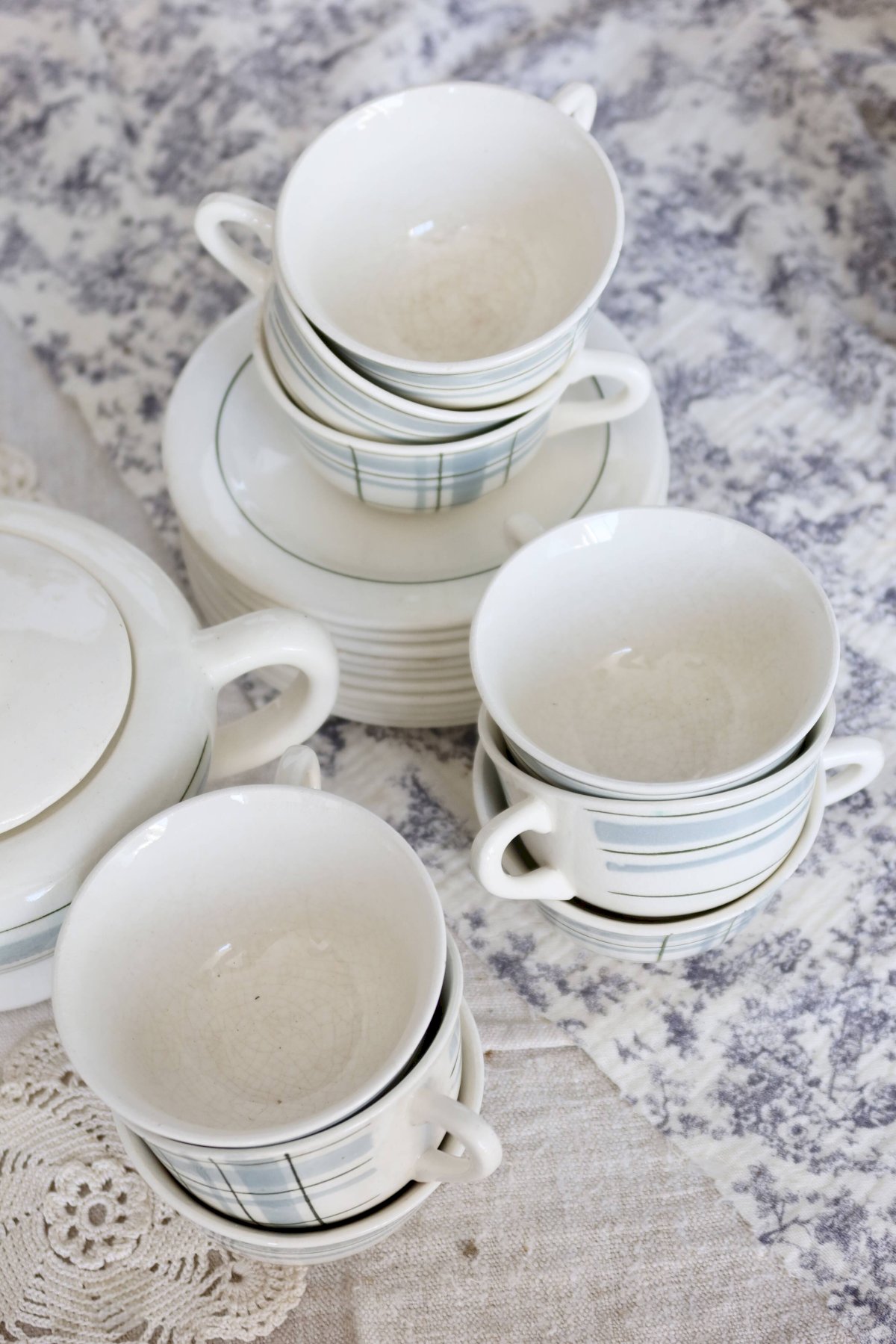 Service à thé ou café de la faïencerie de Salins, décor géométrique bleu gris rehaussé de fins filets bleu foncé.
