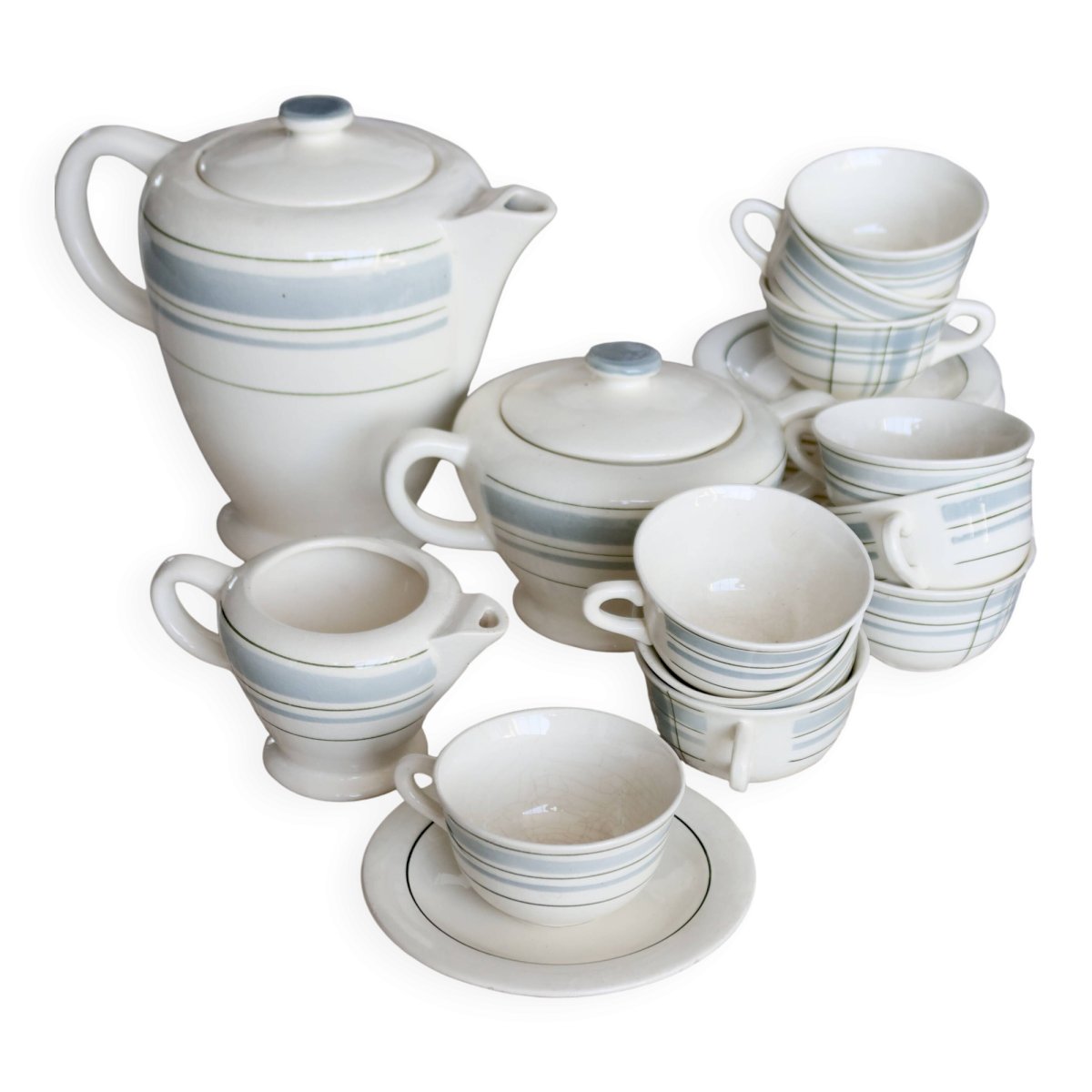 Service à café vintage 10 personnes faïence Salins décor géométrique Blanc Céramique