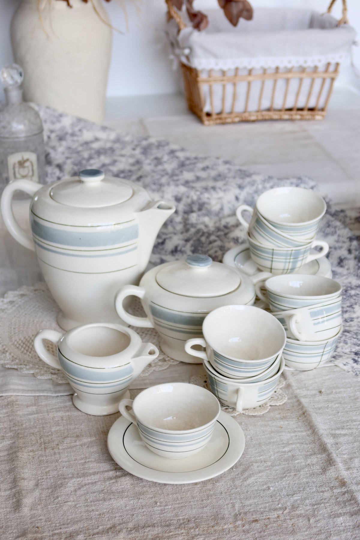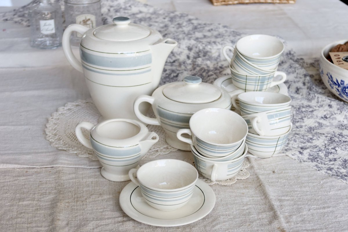 Service à café vintage 10 personnes faïence Salins décor géométrique