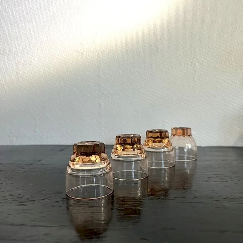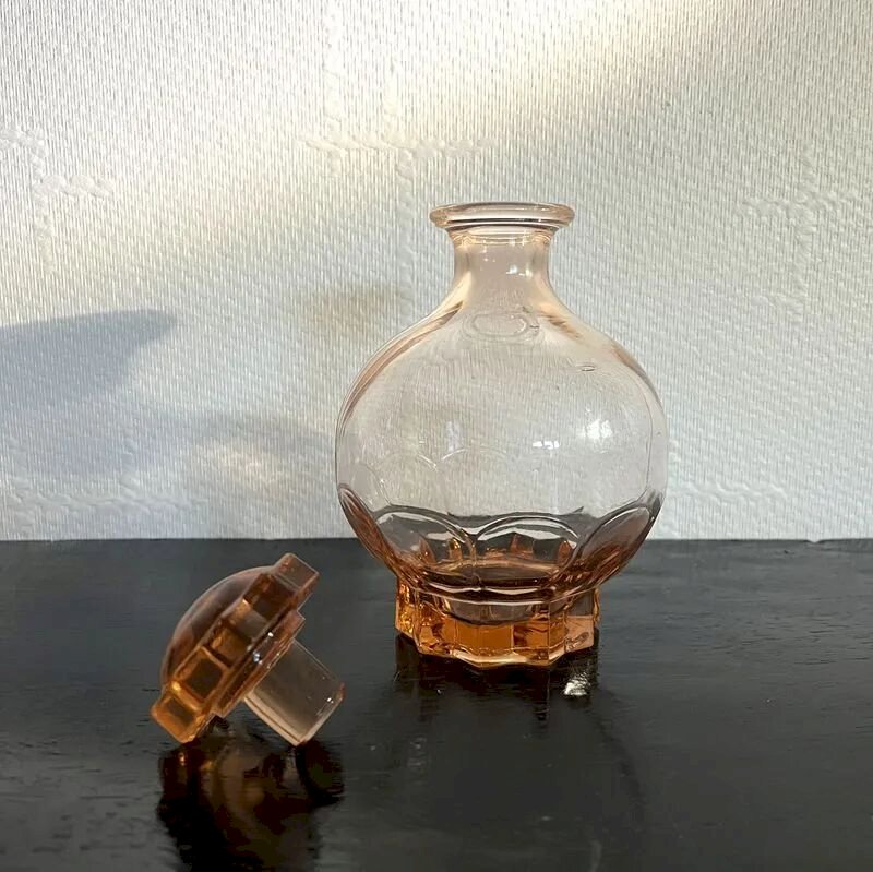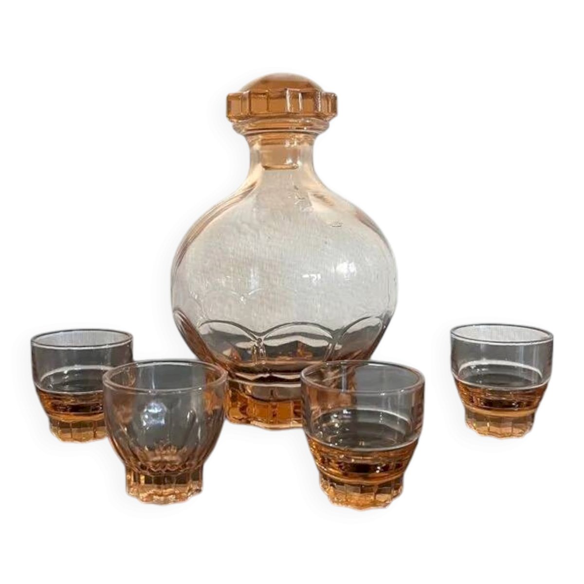 Lot composé de: une carafe bombée avec son bouchon d’origine ainsi que 4 petits verres coordonnés.