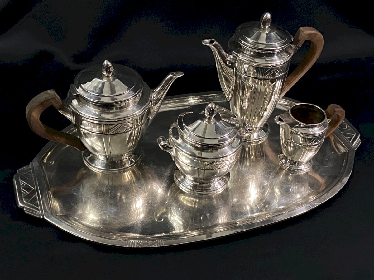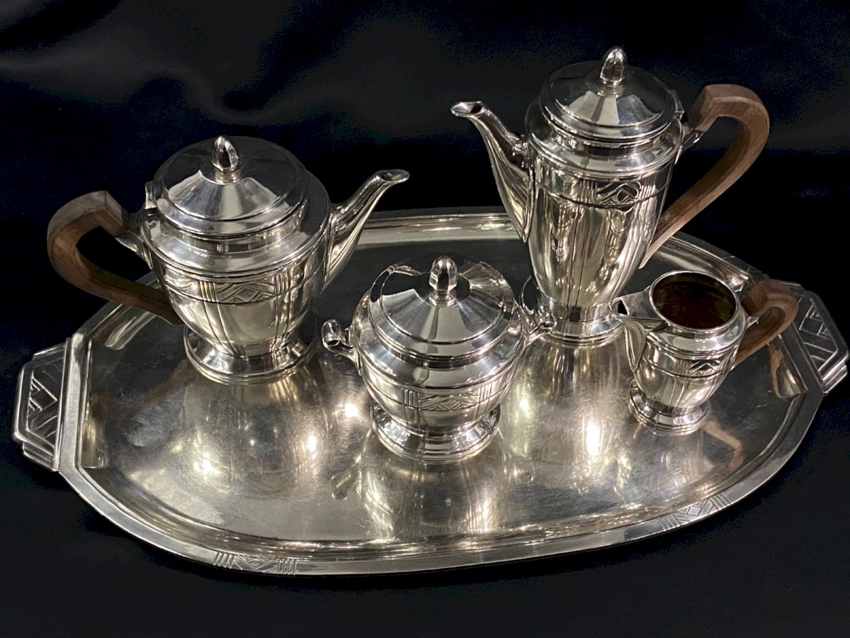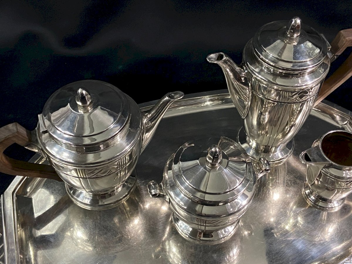 Service à thé et à café en métal argenté design Art déco avec plateau de service