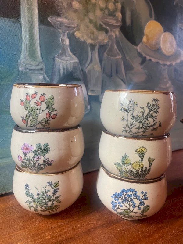 Service à thé en grès vintage 6 grandes tasses à thé avec 6 motifs de fleurs différents 1 grande théière Très bon état Tasses diamètre (ouverture)8cm, hauteur 6,5cm Théière hauteur avec couvercle 14cm