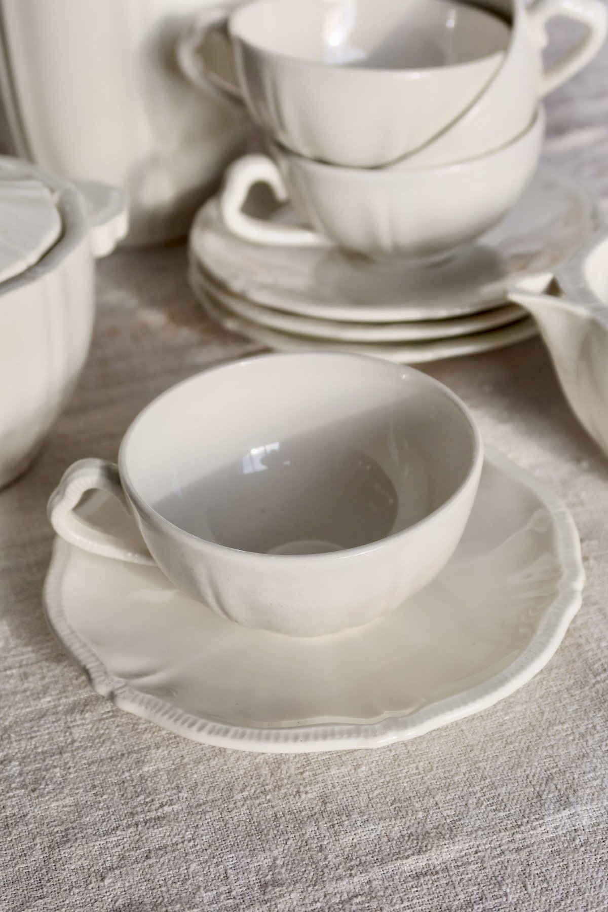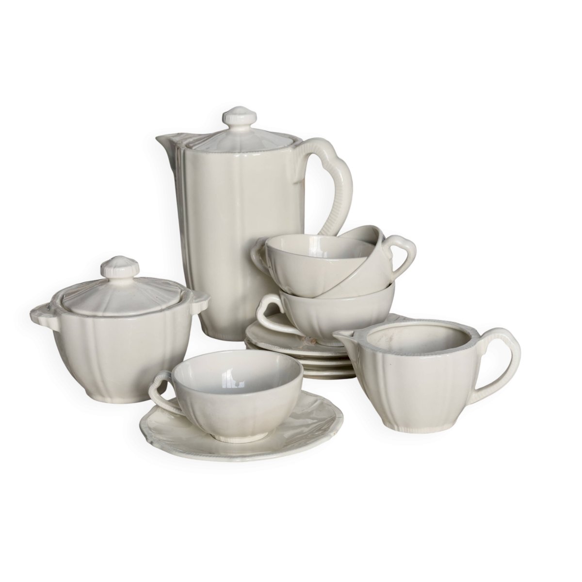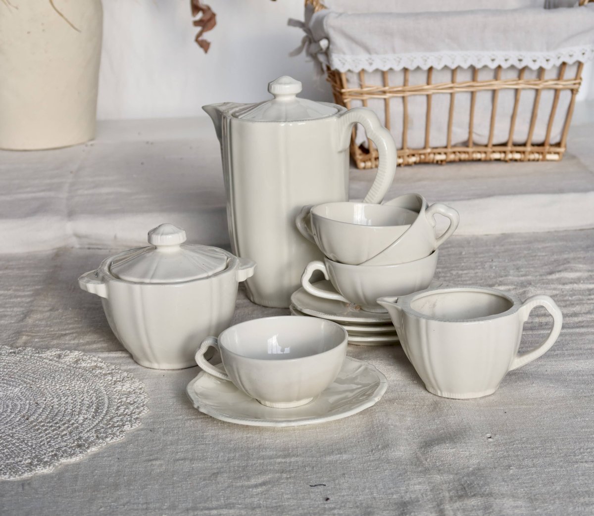 Grande verseuse avec couvercle, 1 sucrier couvert, 1 crémier, 4 tasses et 4 sous-tasses, belle patine et micro-craquelures d’usage.Ensemble propre et cohérent, traces d’usage et petites marques de fabrication d’époque, pas d’ébréchure visible.Dimensions:Verseuse: 11cm X 20cm X 19cm.Pot à lait: 9cm X 6cm X 14cm.Sucrier: 11cm X 7cm X 14cm.Tasse: 9cm X 3, 5cm.Sous tasse: 14, 5cm.