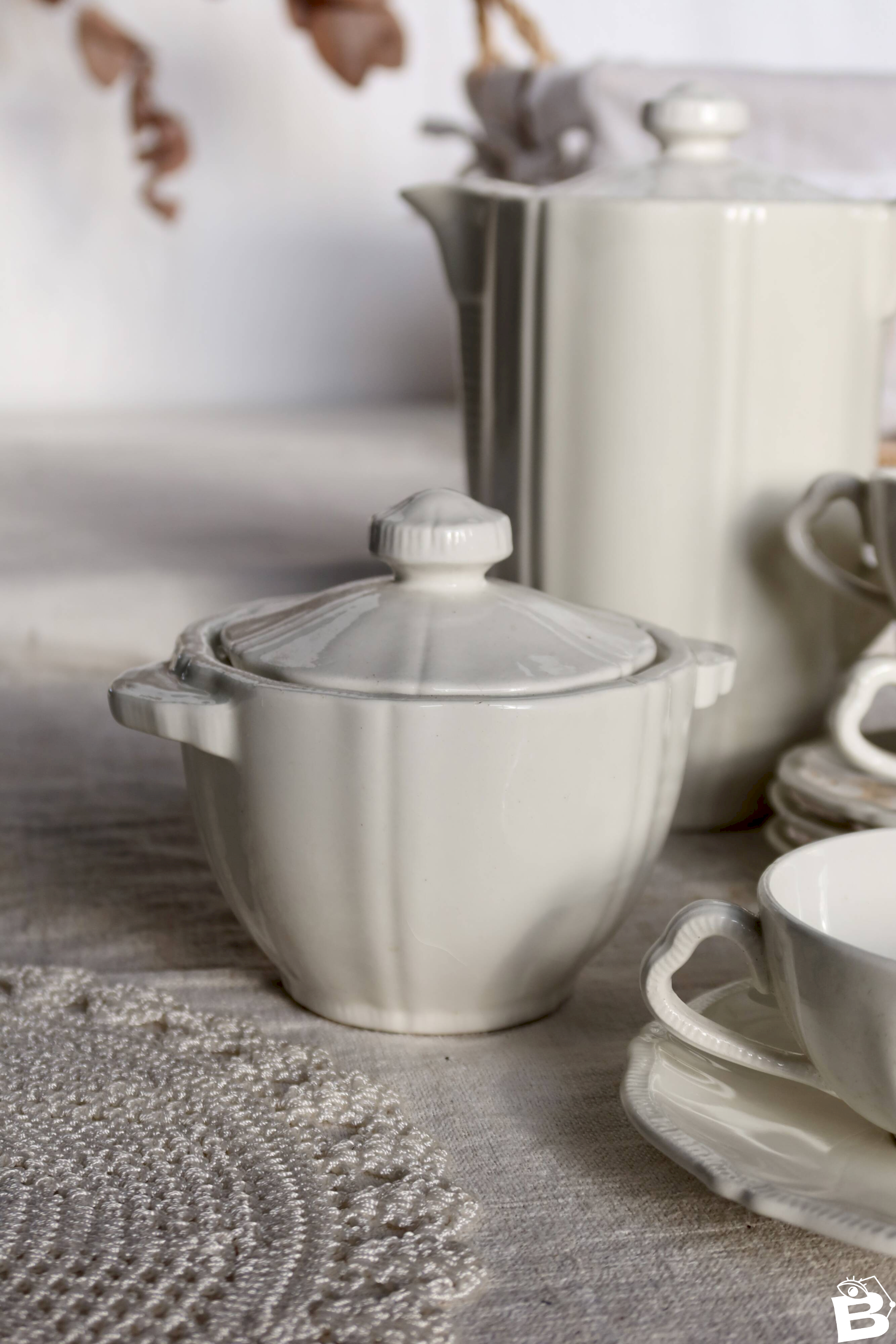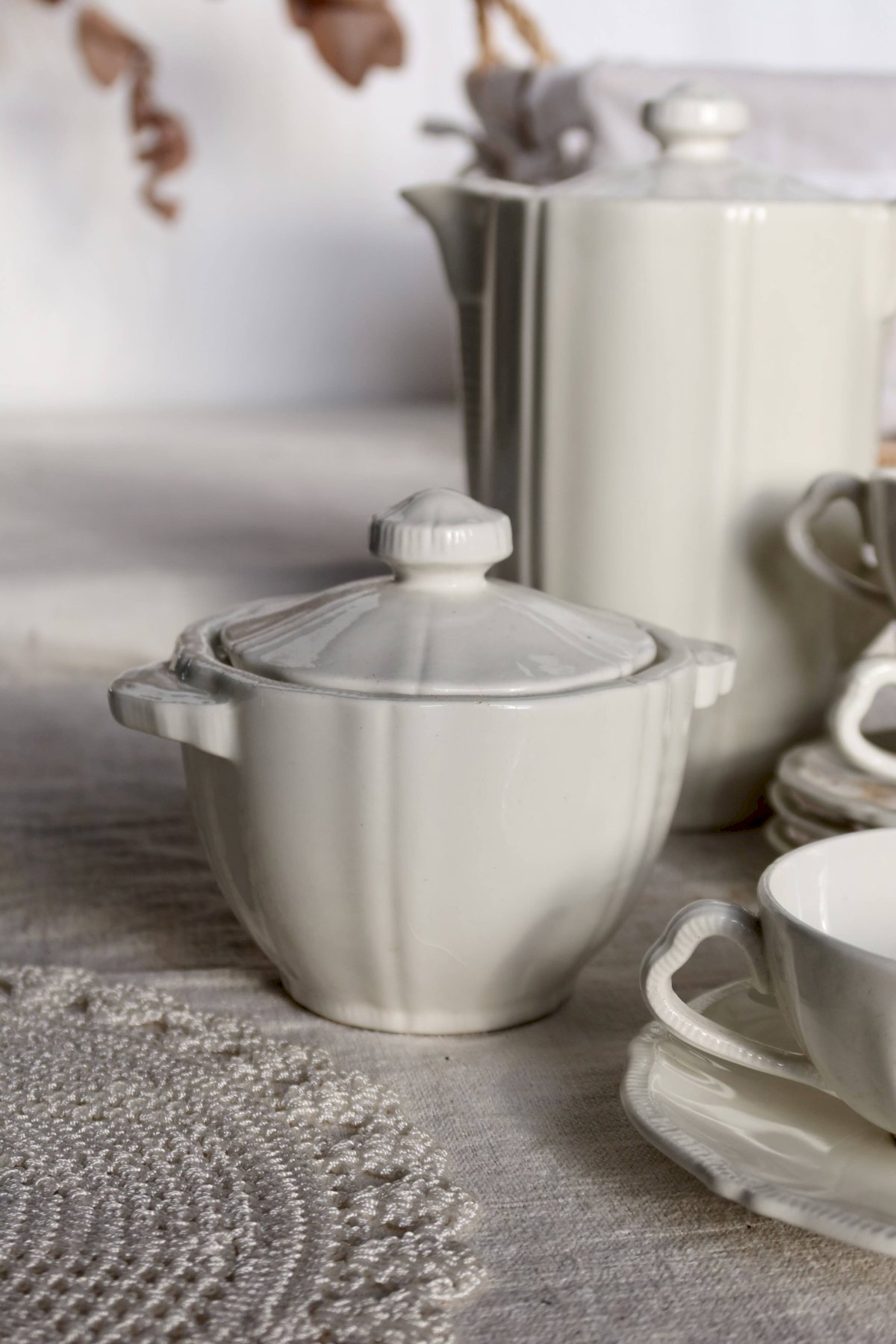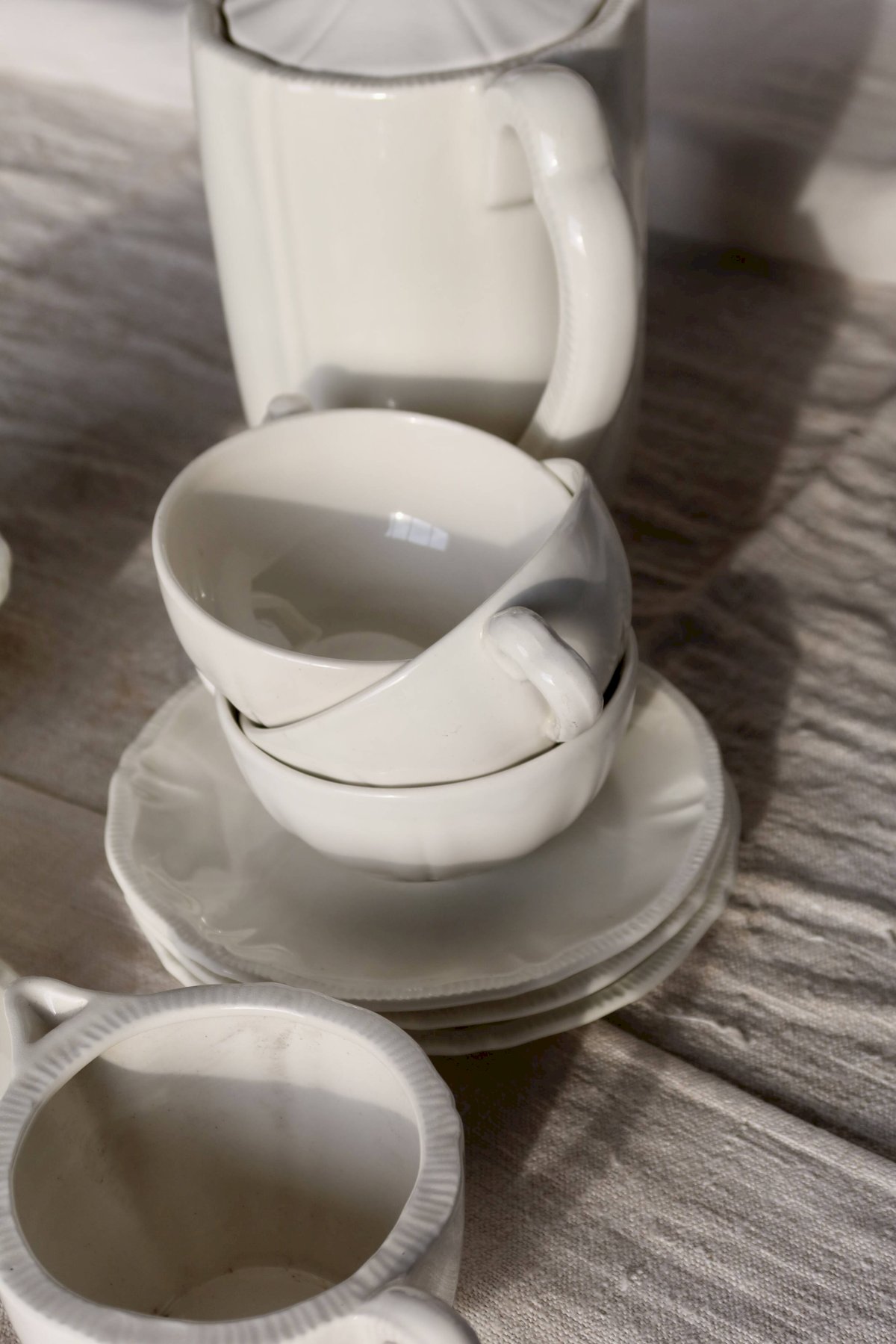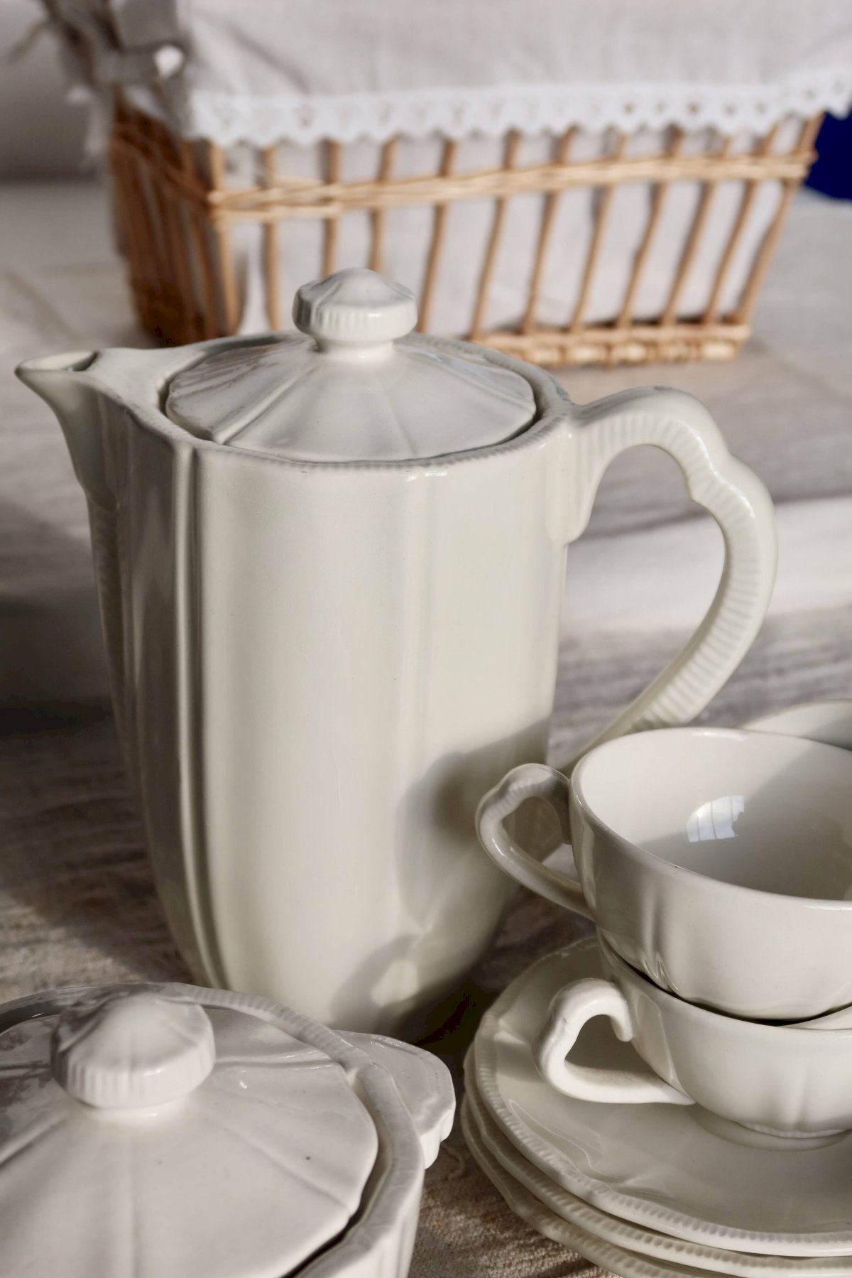 Grande verseuse avec couvercle, 1 sucrier couvert, 1 crémier, 4 tasses et 4 sous-tasses, belle patine et micro-craquelures d’usage.Ensemble propre et cohérent, traces d’usage et petites marques de fabrication d’époque, pas d’ébréchure visible.Dimensions:Verseuse: 11cm X 20cm X 19cm.Pot à lait: 9cm X 6cm X 14cm.Sucrier: 11cm X 7cm X 14cm.Tasse: 9cm X 3, 5cm.Sous tasse: 14, 5cm.