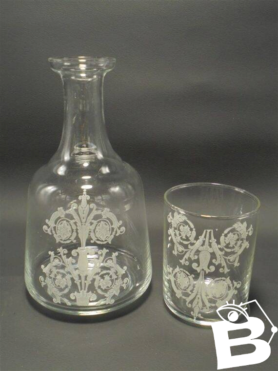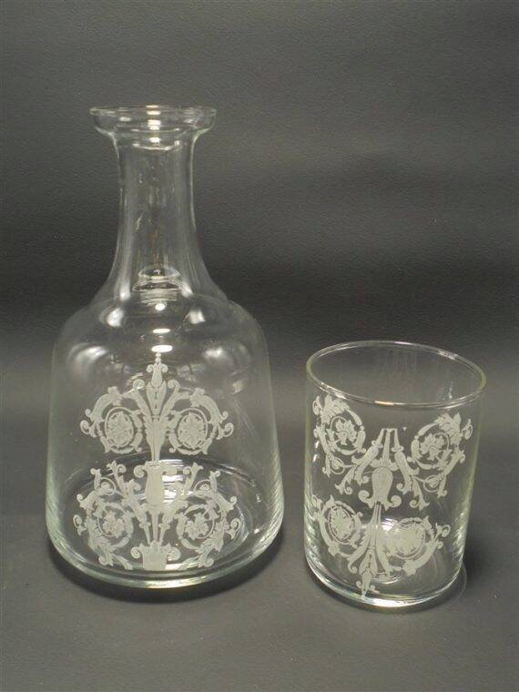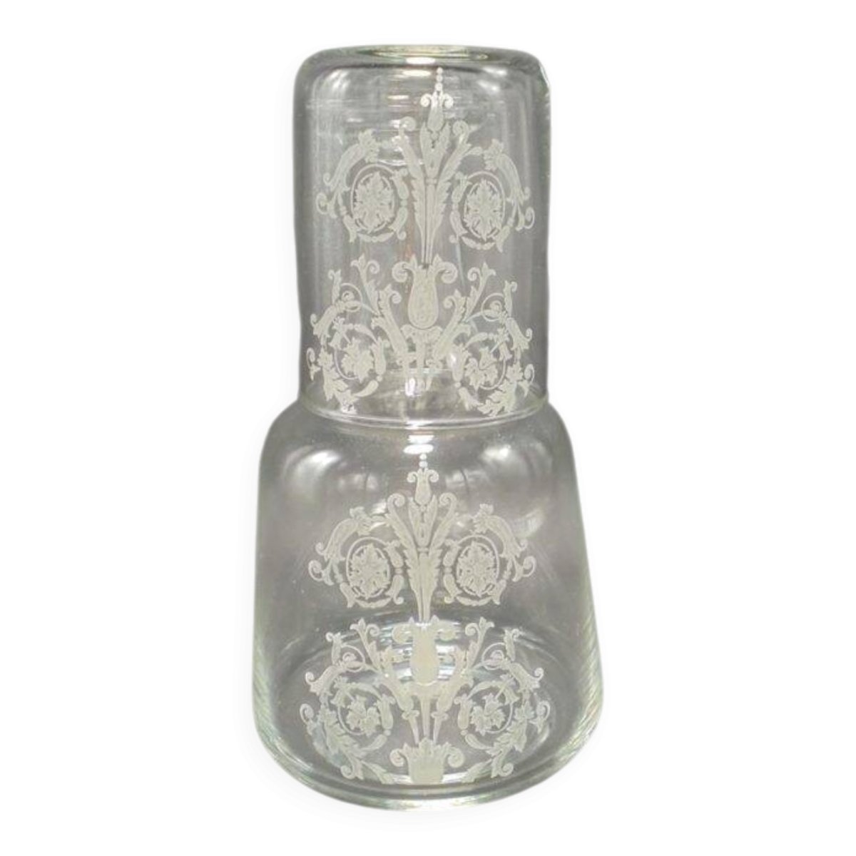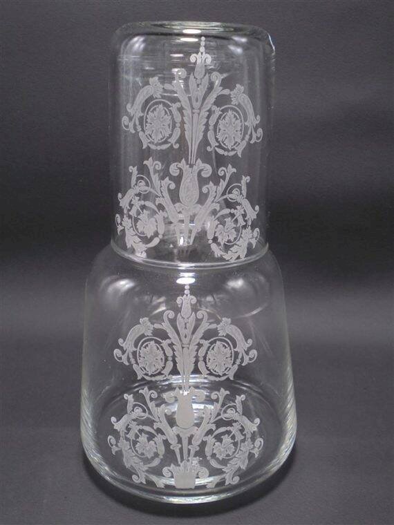 Service de chevet en verre, une jolie carafe et un gobelet pour les soifs nocturnes.Dimensions du verre: 6.4 X 8.5 cm.Dimensions de la carafe: 10 X 17.5 cm.Poids: 340 g.