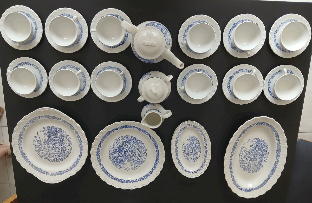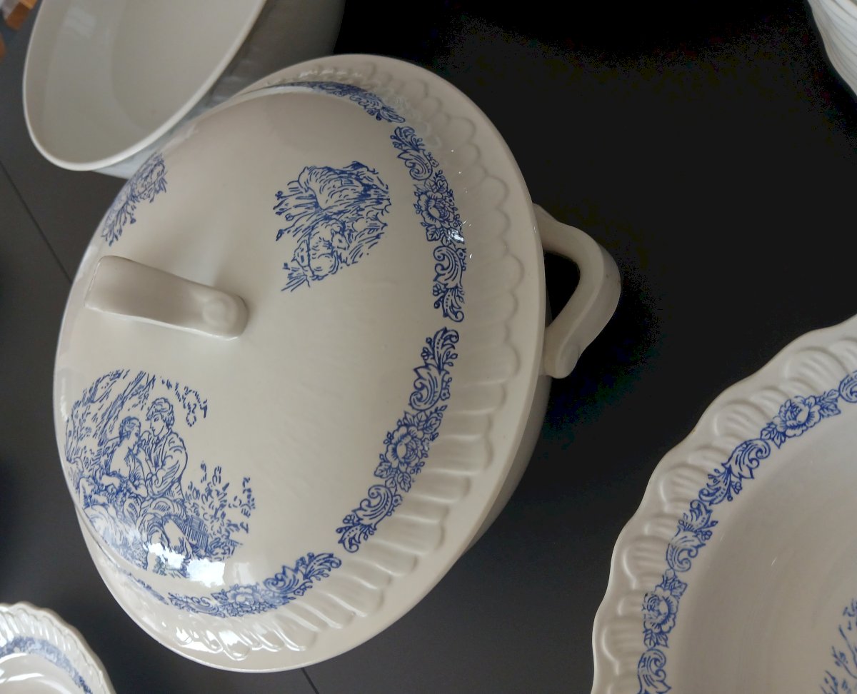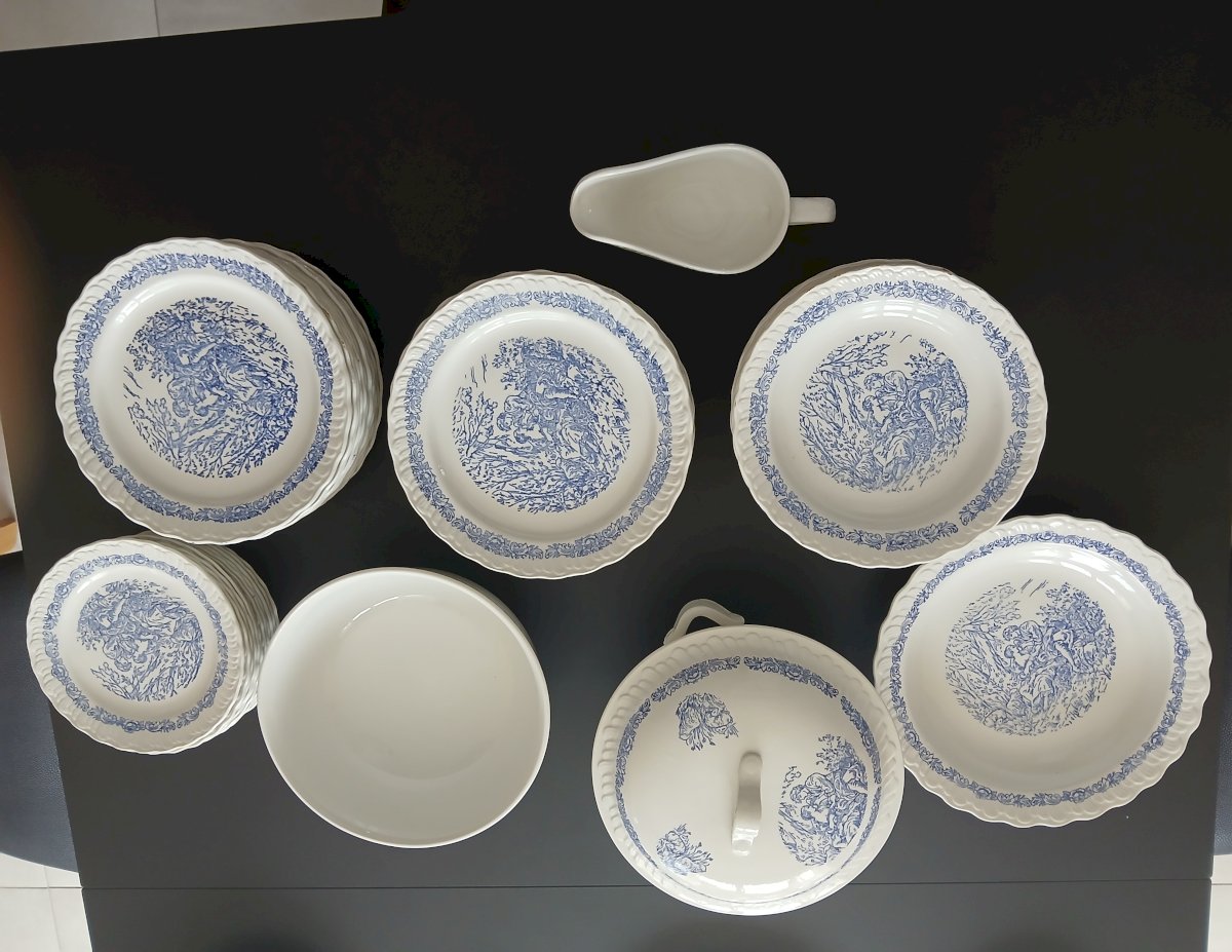 Service de table complet 84 pièces faîence blanc motif personnages bleu