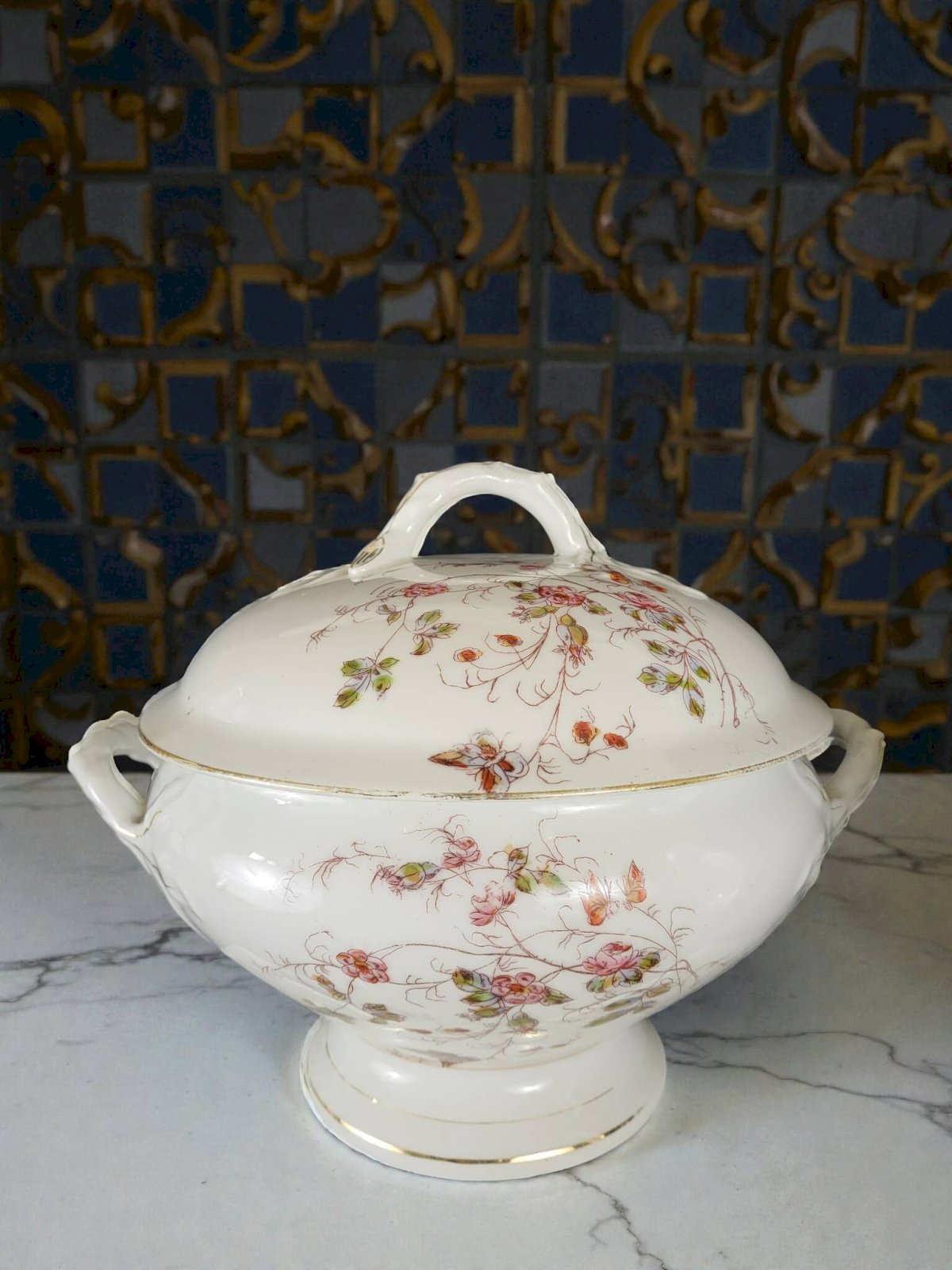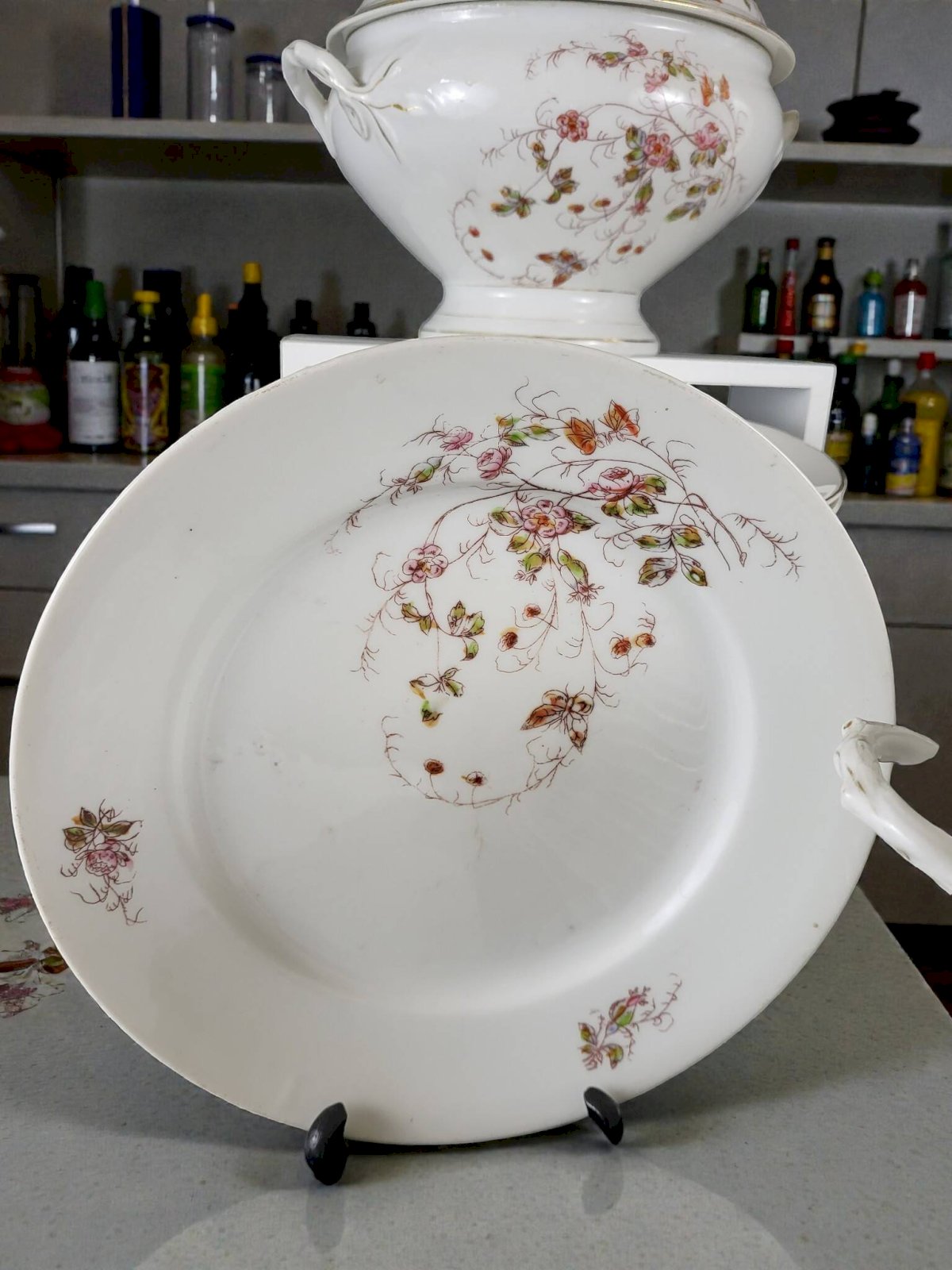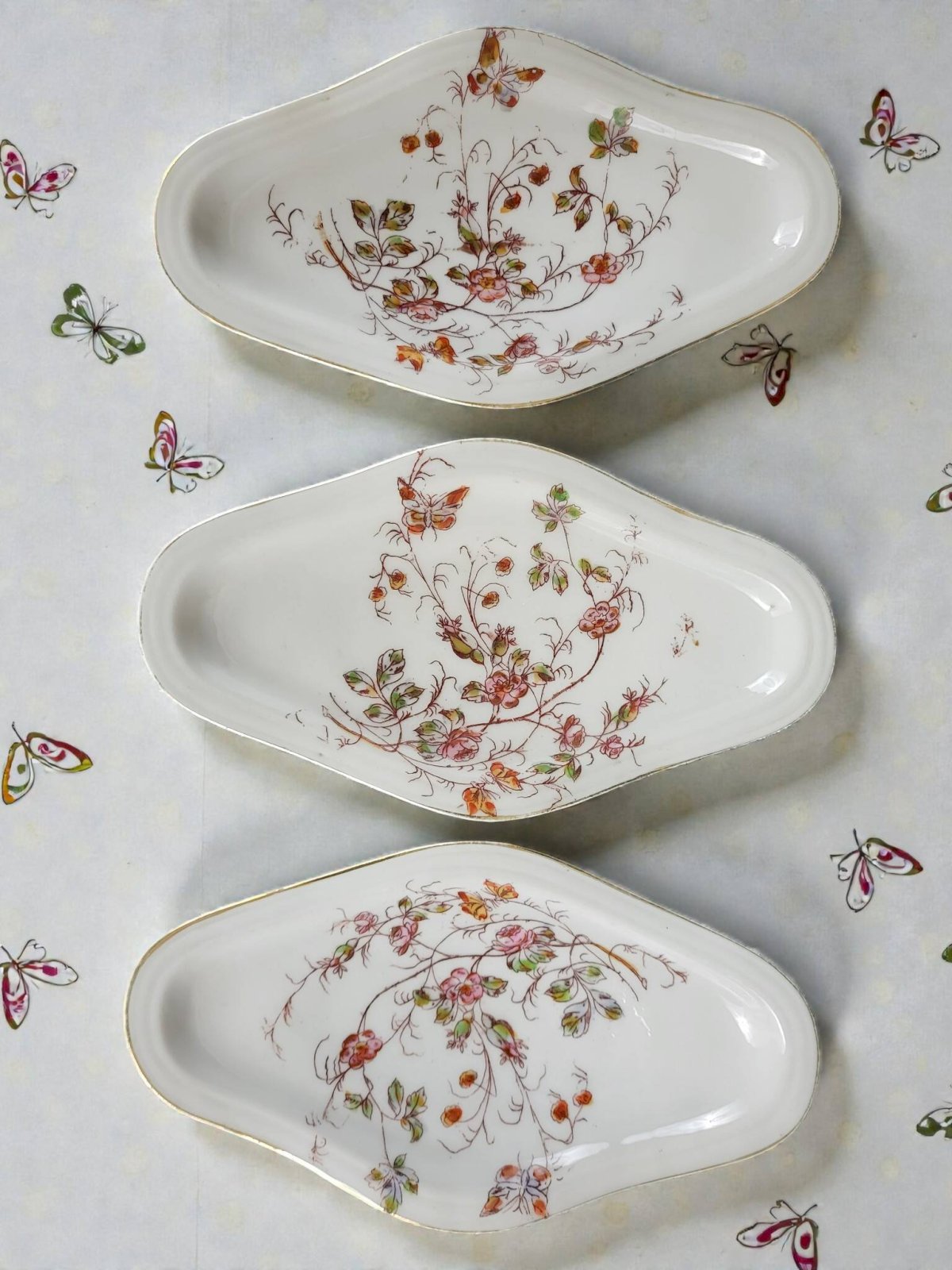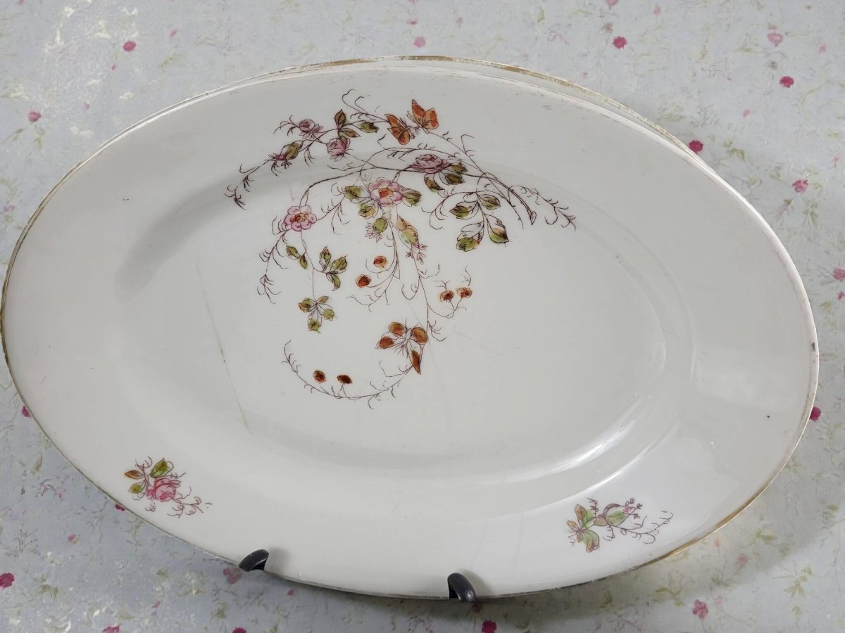 Service de table art nouveau à décor de fleurs et de papillons.En porcelaine.Le services est globalement en bon état avec traces d'usage et d'ancienneté.Il comprend:24 assiettes plates (1 cheveu sur l'une, usure de la dorure) diamètre 22, 9 cm.12 assiettes creuses (1 éclat sur une assiette) diamètre 22, 8 cm.3 raviers (2 avec une égrenures sous le bord (peu visible) dim 13*23 cm.1 saucière (1 éclat peu visible)1 soupière hauteur hauteur 22 cm environ.1 légumier.2 plats ovales en porcelaine épaisse dimensions 24*34, 5 cm (cheveux) et 25*37 cm.3 plats ronds en porcelaine épaisse.1 plat creux en porcelaine épaisse.Diamètre 28 cm.Soit un total de 47 pièces.Livraison me demander.