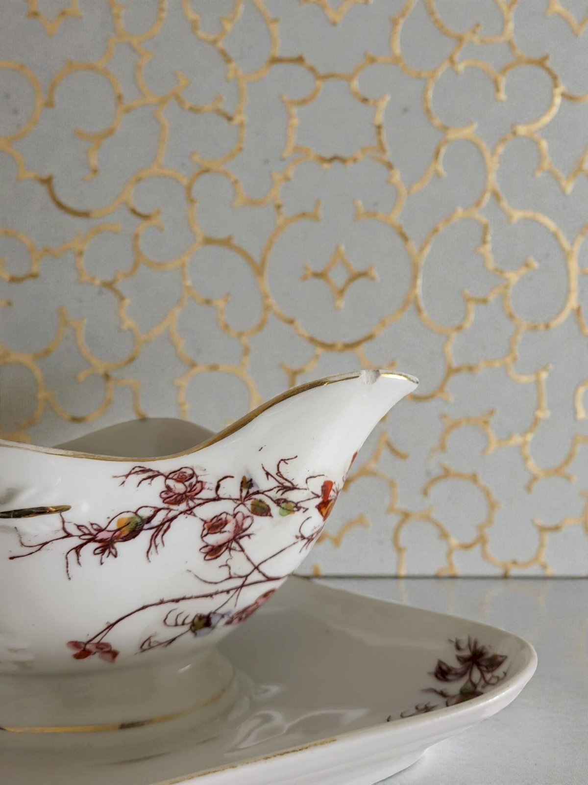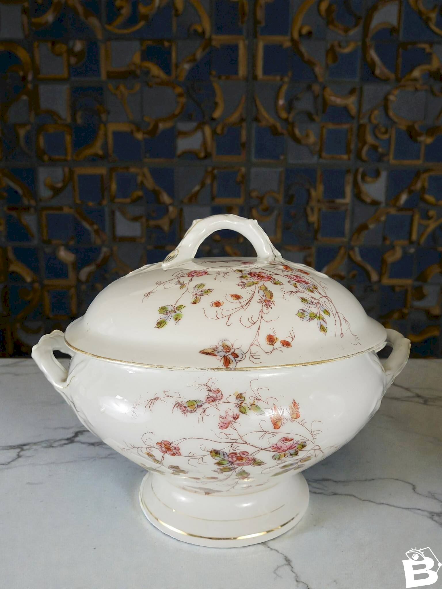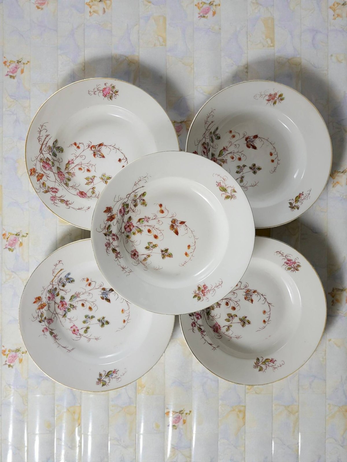 Service de table art nouveau à décor de fleurs et de papillons.En porcelaine.Le services est globalement en bon état avec traces d'usage et d'ancienneté.Il comprend:24 assiettes plates (1 cheveu sur l'une, usure de la dorure) diamètre 22, 9 cm.12 assiettes creuses (1 éclat sur une assiette) diamètre 22, 8 cm.3 raviers (2 avec une égrenures sous le bord (peu visible) dim 13*23 cm.1 saucière (1 éclat peu visible)1 soupière hauteur hauteur 22 cm environ.1 légumier.2 plats ovales en porcelaine épaisse dimensions 24*34, 5 cm (cheveux) et 25*37 cm.3 plats ronds en porcelaine épaisse.1 plat creux en porcelaine épaisse.Diamètre 28 cm.Soit un total de 47 pièces.Livraison me demander.