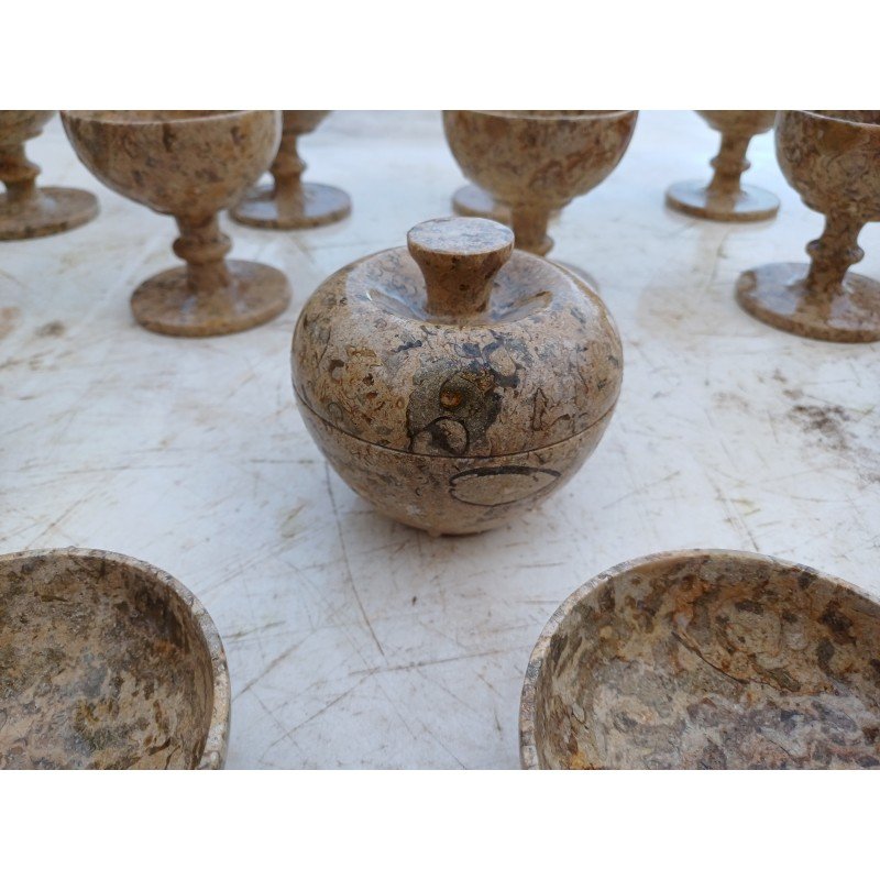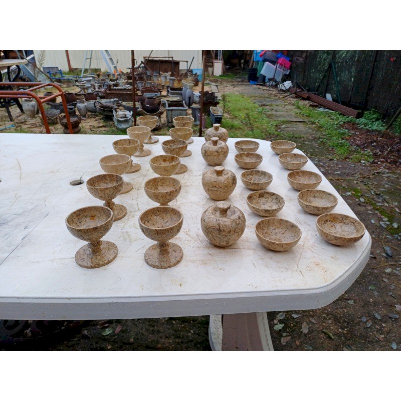 Service en Travertin , 12 Coupes Haut 10 cm , Diam : 9 cm , 4 Récipients avec couvercles Haut 10 cm , Diam : 10 cm et 10 Bols , Haut 4 cm , Diam : 10 cm , poids Total : 12 Kg , très bon état ,