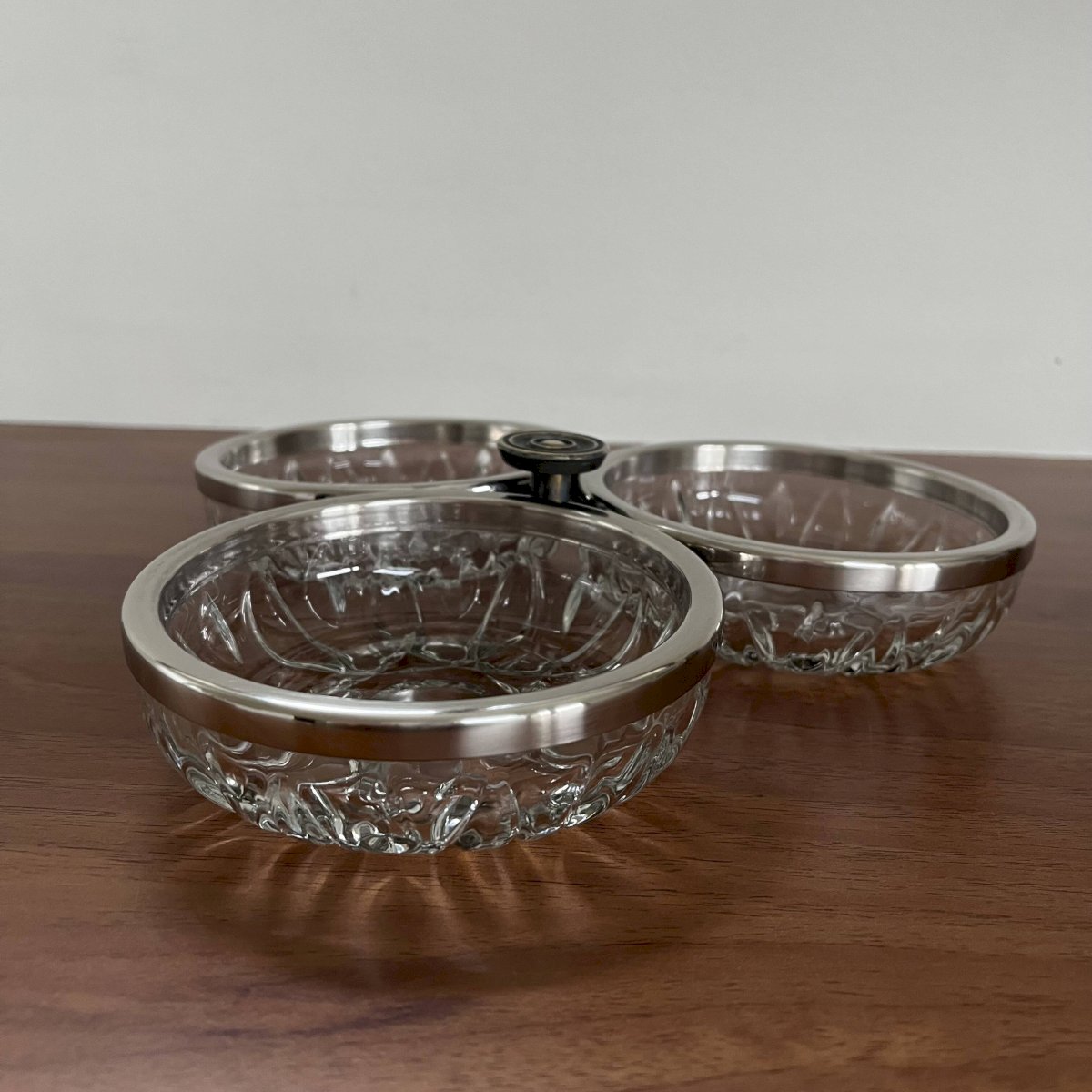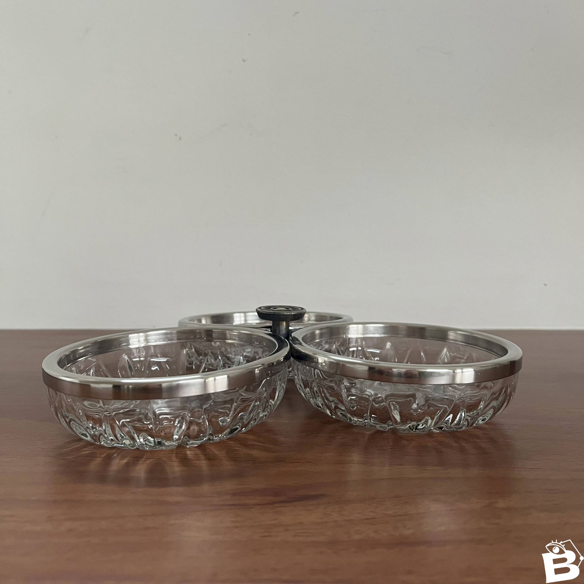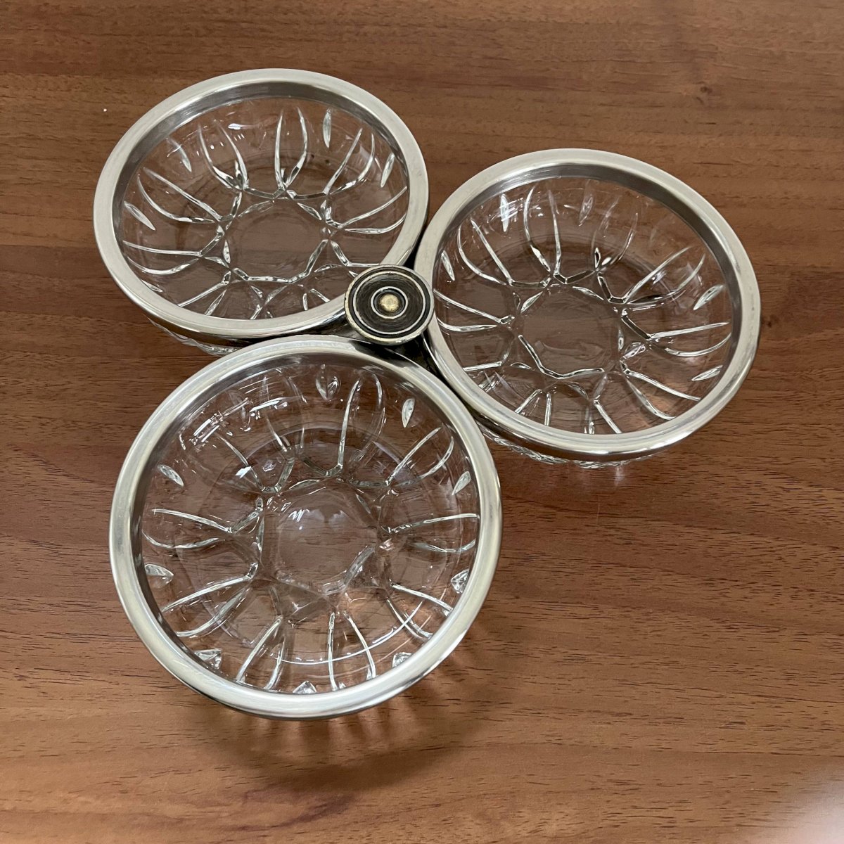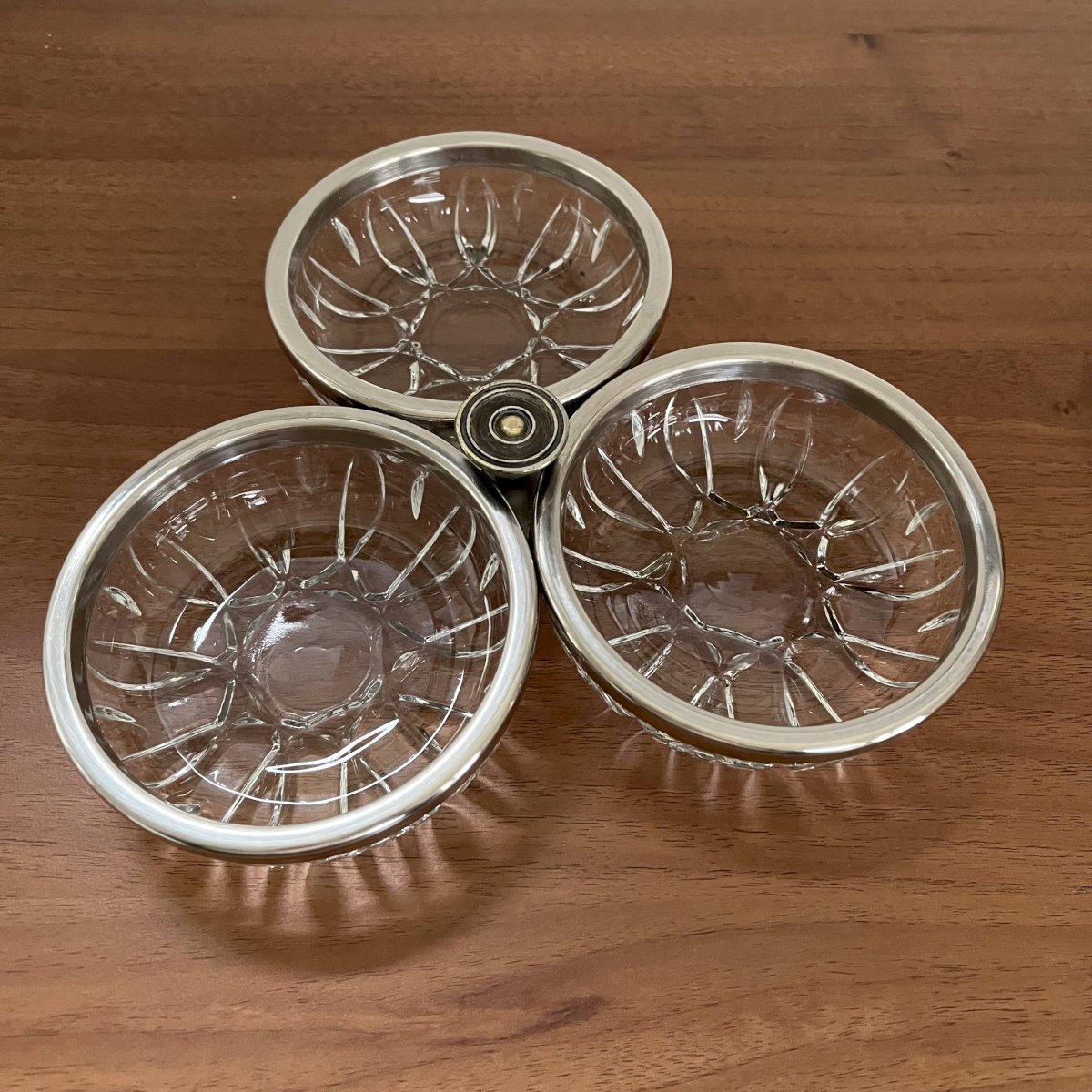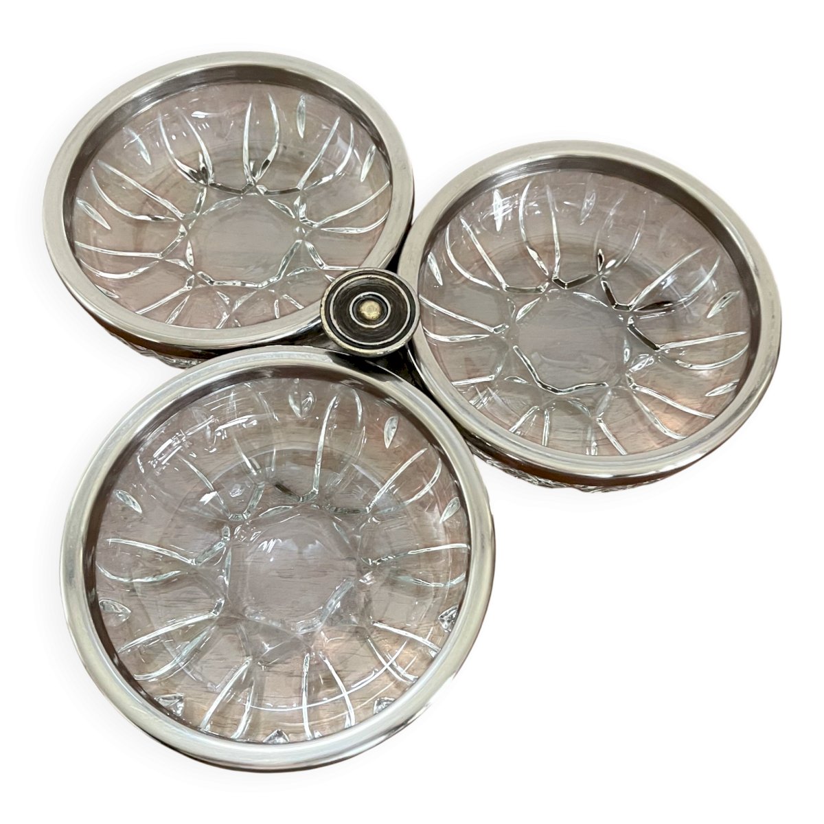 Serviteur apéritif vintage organisé autour de 3 coupes en verres cerclé de métal argenté.Hauteur: 3, 5 cm.Diamètre d'une coupe: 12 cm.Diamètre total: 23 cm.