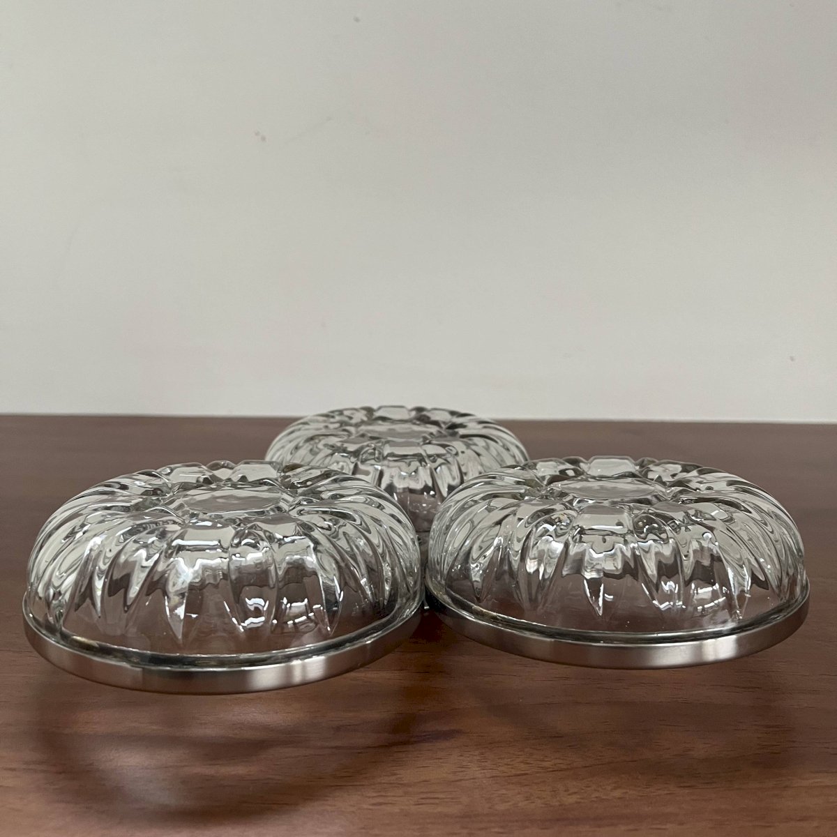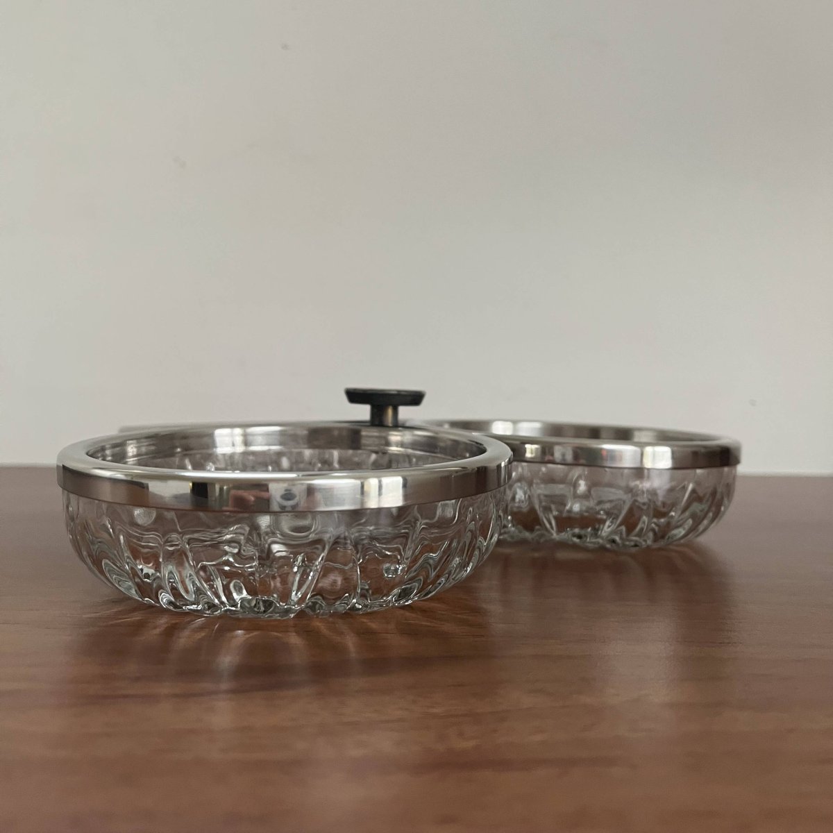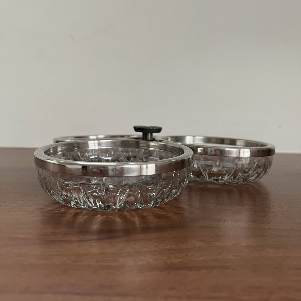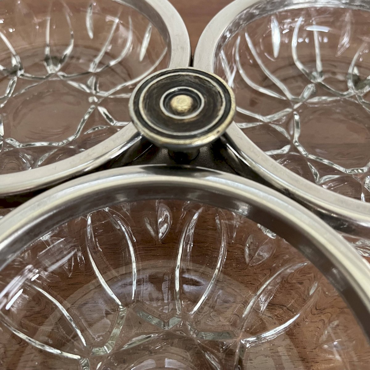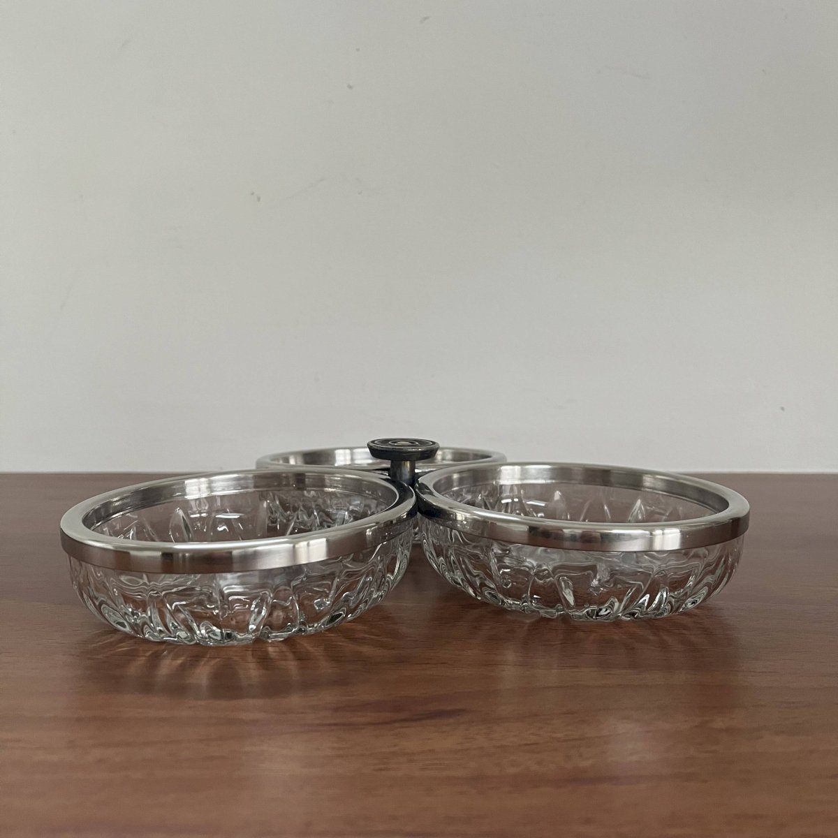 Serviteur apéritif vintage organisé autour de 3 coupes en verres cerclé de métal argenté.Hauteur: 3, 5 cm.Diamètre d'une coupe: 12 cm.Diamètre total: 23 cm.