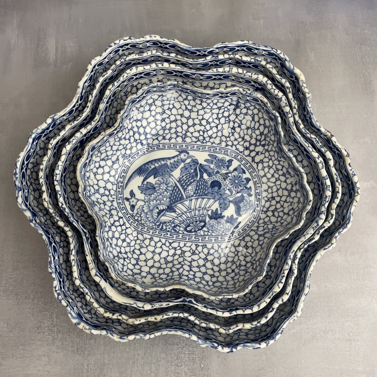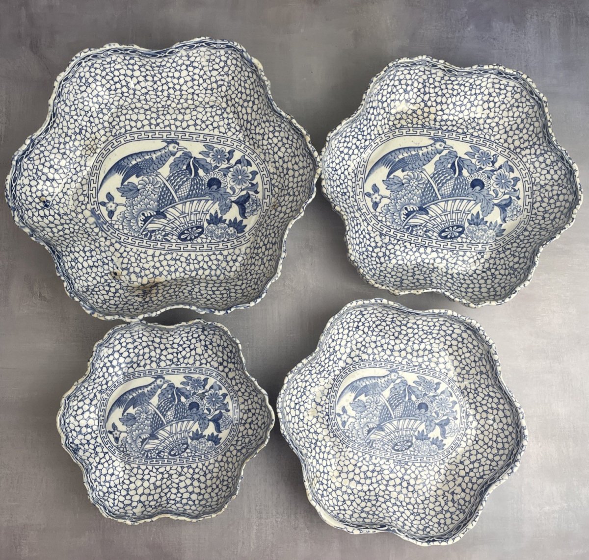 Ensemble de 4 plats bols début XXe WILLIAM ADAMS England décor oiseaux chinois pattern chinese bird de 1780   Set of 4 dishes bolws, early 20th century, WILLIAM ADAMS England, Chinese bird pattern, 1780 Hauteur ~ 18.5 / 21.5 / 23.5 / 27 cm  Diamètre  ~ 4 / 4.5 / 5 / 6 cm Poids total ~ 2 kg Très bel état global, quelques traces du temps (égrenures et taches), un gros éclat sur le plus petit plat, voir photos. Pensez à grouper vos achats pour réduire les frais de port !